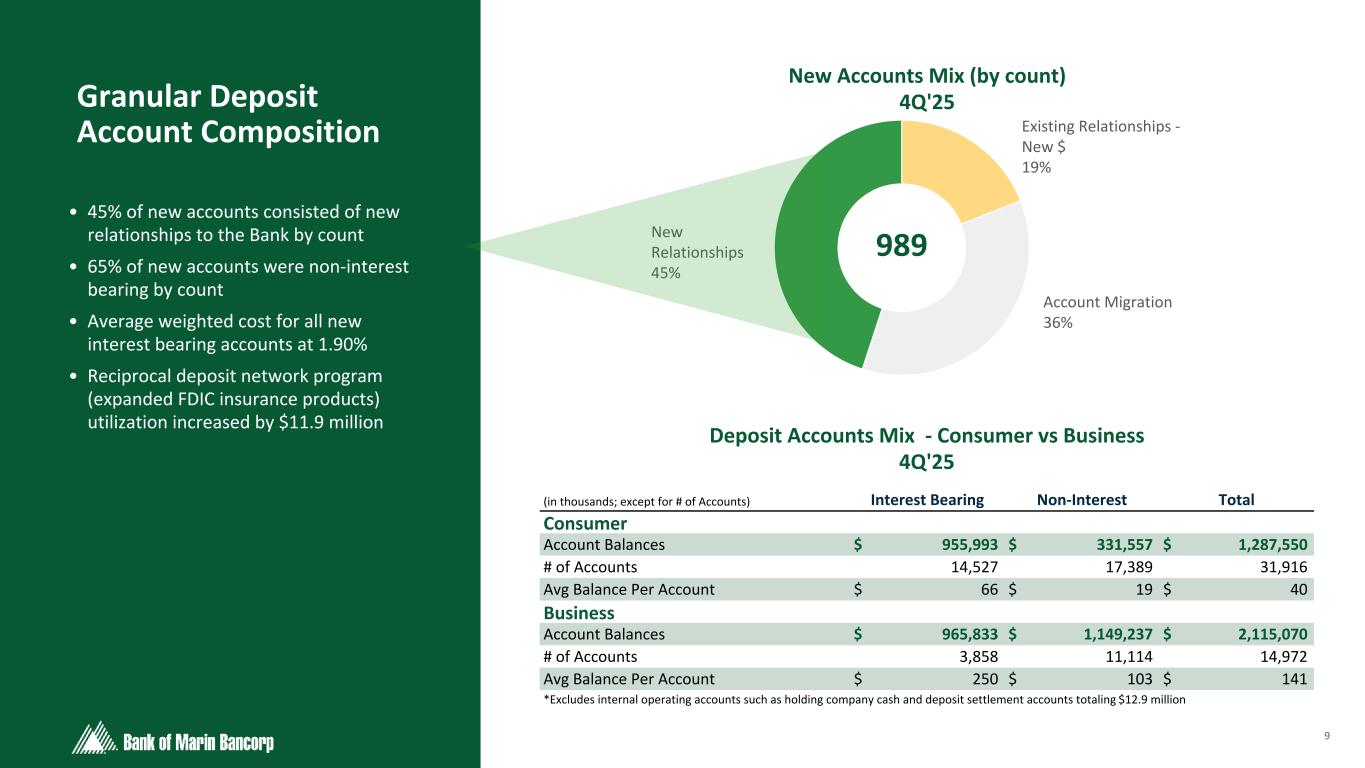 8 Text 95,96,96 Light Gray 232, 232, 232 Black 0, 0, 0 White 255, 255, 255 Accent 1 7,89,52 Accent 2 248,153,40 Accent 3 254,217,129 Accent 4 52,153,70 Accent 5 5,39,67 Accent 6 171,184,195 Strong Deposit Franchise • Bank of Marin ranked #1 on the west coast and #4 nationwide in 2025 by S&P Global Market Intelligence for best deposit franchise among banks with total assets between $3 billion and $10 billion • Deposit mix continues to favor a high percentage of non-interest bearing deposits totaling 43.7%, highlighting our relationship banking model • Total cost of deposits was 1.19% (interest-bearing 2.12%) for 4Q'25 and 1.29% (interest-bearing 2.24%) for the prior quarter • Spot rate was 1.17% (interest-bearing 2.08%) as of December 31, 2025, compared to 1.25% (interest-bearing 2.18%) as of September 30, 2025 • The Bank continued strategic pricing adjustments with limited rate related outflows Total Deposit Mix at 4Q'25Total Deposits ($ in millions) $2,504 $3,808 $3,574 $3,290 $3,220 $3,416 $1,538 $2,201 $2,127 $1,667 $1,598 $1,672 $869 $1,457 $1,328 $1,372 $1,379 $1,538$97 $150 $119 $251 $243 $206 Transaction Savings & MMDA Time 2020 2021 2022 2023 2024 2025 Non-Interest Bearing 43.7% IB DDA 5.3% Savings 6.8% Money Market 38.2% Time 6.0% $3.42B