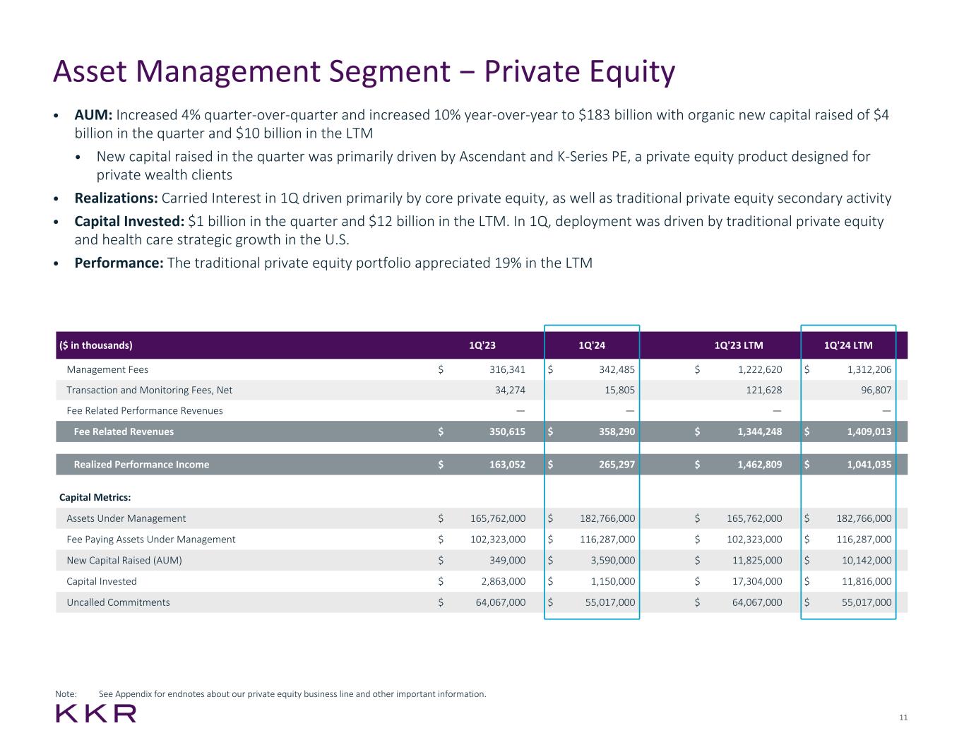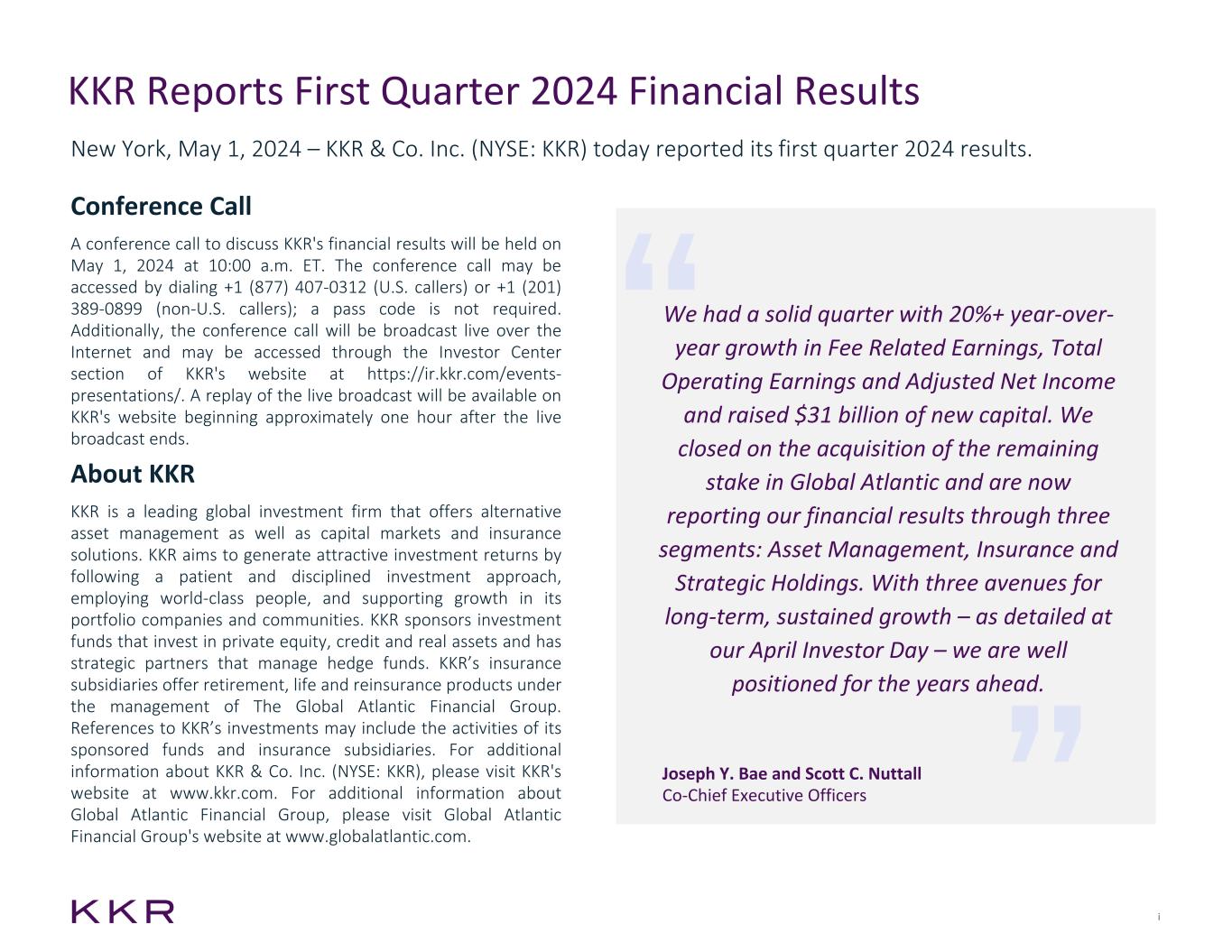 i We had a solid quarter with 20%+ year-over- year growth in Fee Related Earnings, Total Operating Earnings and Adjusted Net Income and raised $31 billion of new capital. We closed on the acquisition of the remaining stake in Global Atlantic and are now reporting our financial results through three segments: Asset Management, Insurance and Strategic Holdings. With three avenues for long-term, sustained growth – as detailed at our April Investor Day – we are well positioned for the years ahead. Conference Call A conference call to discuss KKR's financial results will be held on May 1, 2024 at 10:00 a.m. ET. The conference call may be accessed by dialing +1 (877) 407-0312 (U.S. callers) or +1 (201) 389-0899 (non-U.S. callers); a pass code is not required. Additionally, the conference call will be broadcast live over the Internet and may be accessed through the Investor Center section of KKR's website at https://ir.kkr.com/events- presentations/. A replay of the live broadcast will be available on KKR's website beginning approximately one hour after the live broadcast ends. About KKR KKR is a leading global investment firm that offers alternative asset management as well as capital markets and insurance solutions. KKR aims to generate attractive investment returns by following a patient and disciplined investment approach, employing world-class people, and supporting growth in its portfolio companies and communities. KKR sponsors investment funds that invest in private equity, credit and real assets and has strategic partners that manage hedge funds. KKR’s insurance subsidiaries offer retirement, life and reinsurance products under the management of The Global Atlantic Financial Group. References to KKR’s investments may include the activities of its sponsored funds and insurance subsidiaries. For additional information about KKR & Co. Inc. (NYSE: KKR), please visit KKR's website at www.kkr.com. For additional information about Global Atlantic Financial Group, please visit Global Atlantic Financial Group's website at www.globalatlantic.com. New York, May 1, 2024 – KKR & Co. Inc. (NYSE: KKR) today reported its first quarter 2024 results. KKR Reports First Quarter 2024 Financial Results Joseph Y. Bae and Scott C. Nuttall Co-Chief Executive Officers
