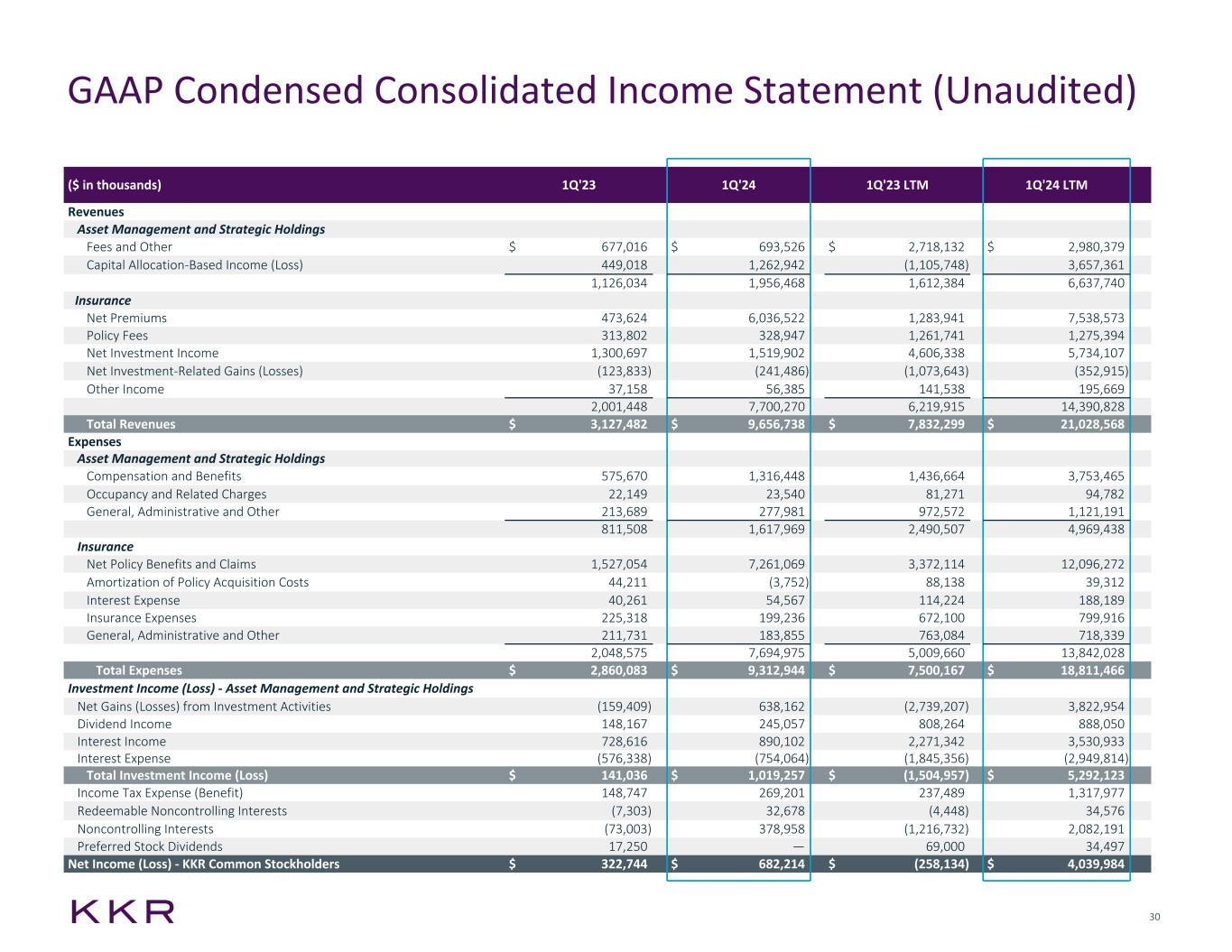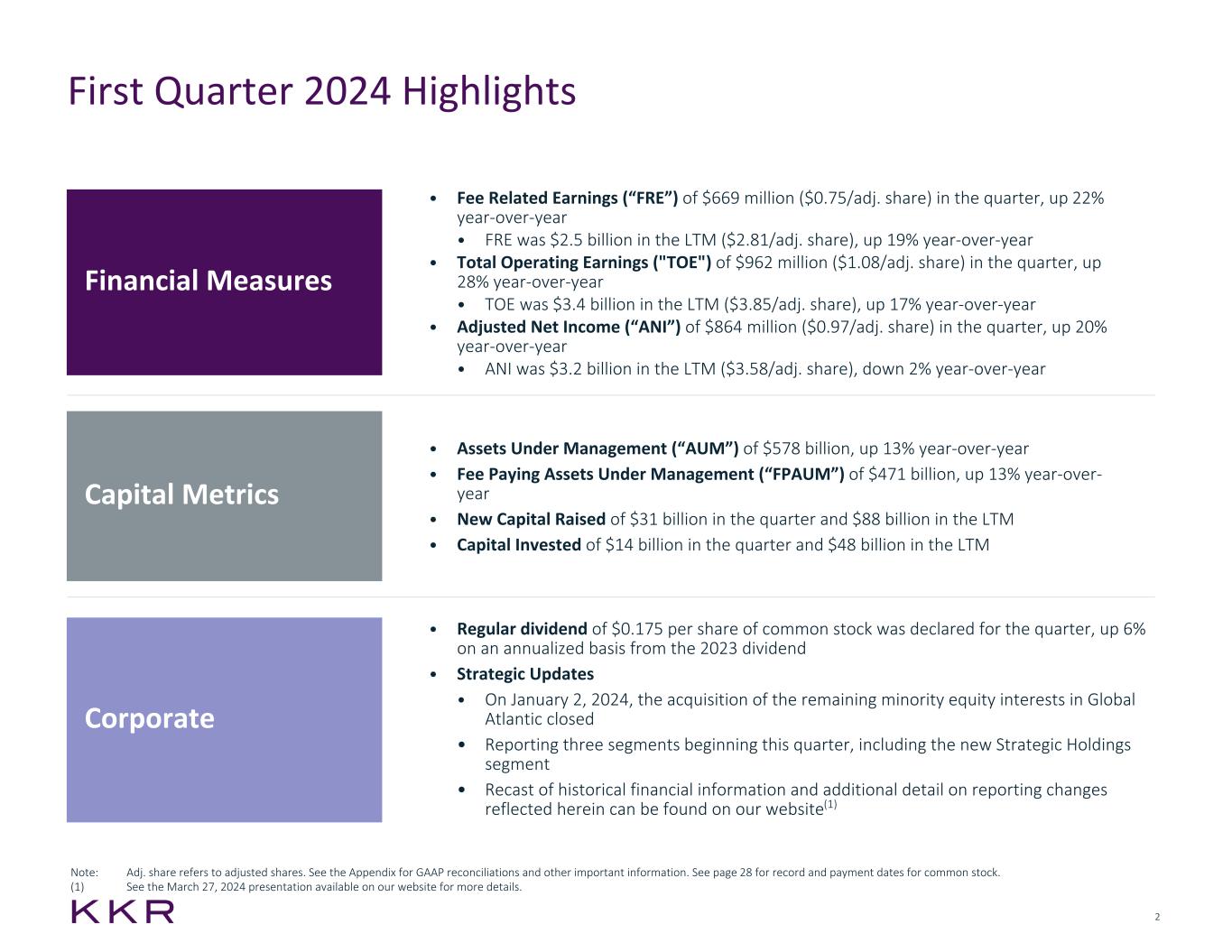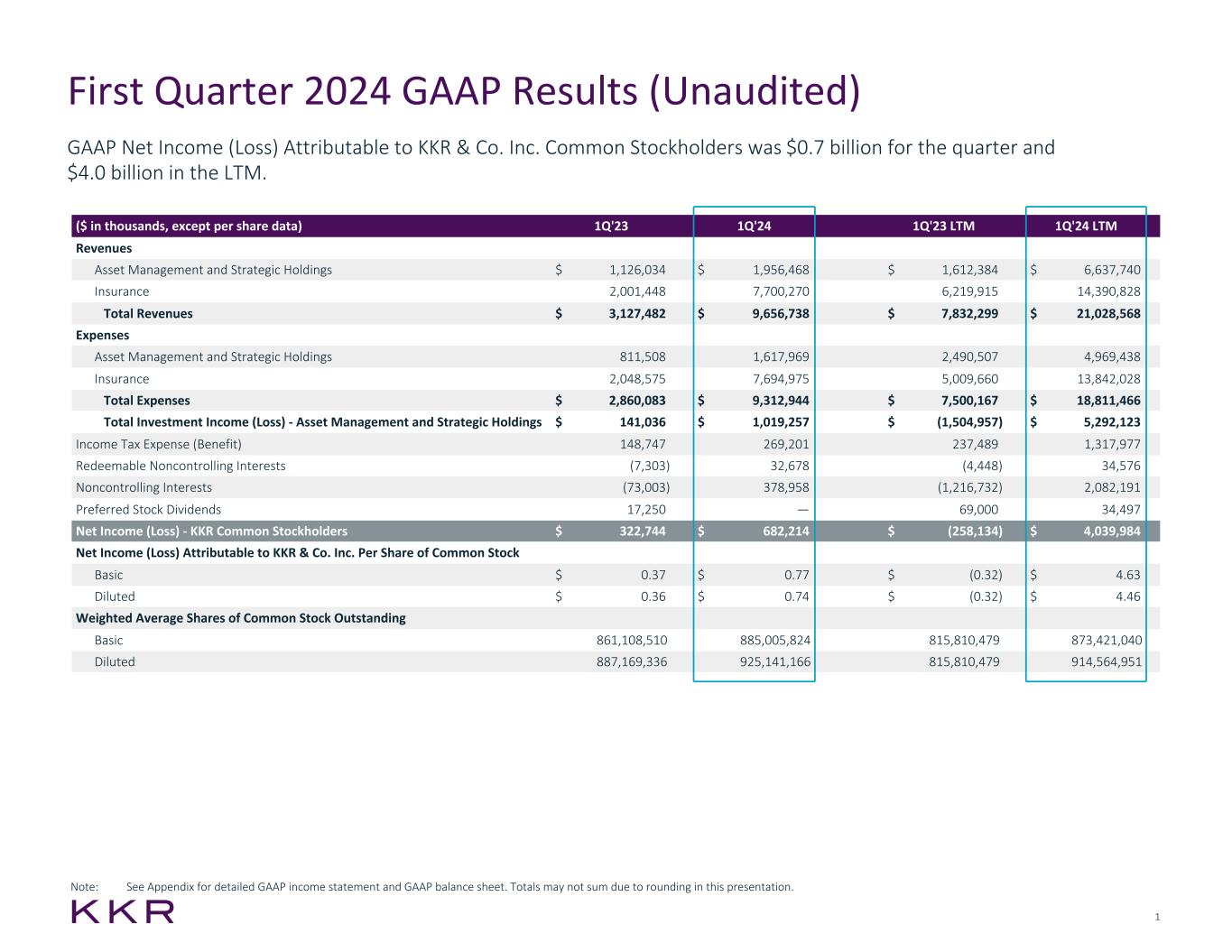 1 First Quarter 2024 GAAP Results (Unaudited) GAAP Net Income (Loss) Attributable to KKR & Co. Inc. Common Stockholders was $0.7 billion for the quarter and $4.0 billion in the LTM. ($ in thousands, except per share data) 1Q'23 1Q'24 1Q'23 LTM 1Q'24 LTM Revenues Asset Management and Strategic Holdings $ 1,126,034 $ 1,956,468 $ 1,612,384 $ 6,637,740 Insurance 2,001,448 7,700,270 6,219,915 14,390,828 Total Revenues $ 3,127,482 $ 9,656,738 $ 7,832,299 $ 21,028,568 Expenses Asset Management and Strategic Holdings 811,508 1,617,969 2,490,507 4,969,438 Insurance 2,048,575 7,694,975 5,009,660 13,842,028 Total Expenses $ 2,860,083 $ 9,312,944 $ 7,500,167 $ 18,811,466 Total Investment Income (Loss) - Asset Management and Strategic Holdings $ 141,036 $ 1,019,257 $ (1,504,957) $ 5,292,123 Income Tax Expense (Benefit) 148,747 269,201 237,489 1,317,977 Redeemable Noncontrolling Interests (7,303) 32,678 (4,448) 34,576 Noncontrolling Interests (73,003) 378,958 (1,216,732) 2,082,191 Preferred Stock Dividends 17,250 — 69,000 34,497 Net Income (Loss) - KKR Common Stockholders $ 322,744 $ 682,214 $ (258,134) $ 4,039,984 Net Income (Loss) Attributable to KKR & Co. Inc. Per Share of Common Stock Basic $ 0.37 $ 0.77 $ (0.32) $ 4.63 Diluted $ 0.36 $ 0.74 $ (0.32) $ 4.46 Weighted Average Shares of Common Stock Outstanding Basic 861,108,510 885,005,824 815,810,479 873,421,040 Diluted 887,169,336 925,141,166 815,810,479 914,564,951 Note: See Appendix for detailed GAAP income statement and GAAP balance sheet. Totals may not sum due to rounding in this presentation.