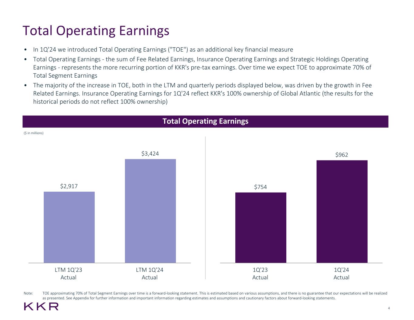 3 First Quarter 2024 Segment Earnings Note: See Appendix for GAAP reconciliations, endnotes about taxes affecting Adjusted Net Income and other important information. ($ in thousands, except per share data) 1Q'23 1Q'24 1Q'23 LTM 1Q'24 LTM Management Fees $ 738,156 $ 815,327 $ 2,769,715 $ 3,107,496 Transaction and Monitoring Fees, Net 142,179 152,084 612,074 730,559 Fee Related Performance Revenues 21,741 19,101 100,355 91,787 Fee Related Compensation (203,094) (172,640) (760,609) (834,882) Other Operating Expenses (150,404) (145,131) (610,528) (591,011) Fee Related Earnings $ 548,578 $ 668,741 $ 2,111,007 $ 2,503,949 Insurance Operating Earnings $ 205,112 $ 272,840 $ 785,927 $ 884,365 Strategic Holdings Operating Earnings $ — $ 20,720 $ 20,316 $ 35,251 Total Operating Earnings $ 753,690 $ 962,301 $ 2,917,250 $ 3,423,565 Net Realized Performance Income 61,389 77,998 678,949 415,558 Net Realized Investment Income 165,120 114,542 813,073 490,863 Total Investing Earnings $ 226,509 $ 192,540 $ 1,492,022 $ 906,421 Total Segment Earnings $ 980,199 $ 1,154,841 $ 4,409,272 $ 4,329,986 Interest Expense, Net and Other (87,866) (74,730) (338,983) (338,733) Income Taxes on Adjusted Earnings (173,057) (216,366) (812,742) (806,691) Adjusted Net Income $ 719,276 $ 863,745 $ 3,257,547 $ 3,184,562 Adjusted Per Share Measures: FRE per Adjusted Share $ 0.62 $ 0.75 $ 2.38 $ 2.81 TOE per Adjusted Share $ 0.85 $ 1.08 $ 3.28 $ 3.85 ANI per Adjusted Share $ 0.81 $ 0.97 $ 3.67 $ 3.58