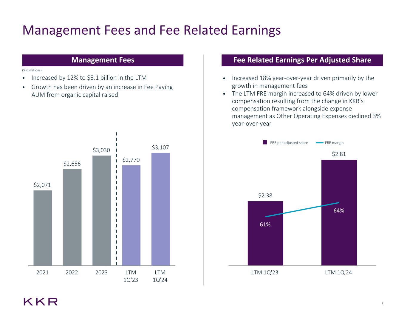 6 Asset Management Segment ($ in thousands, except per share data) 1Q'23 1Q'24 1Q'23 LTM 1Q'24 LTM Management Fees $ 738,156 $ 815,327 $ 2,769,715 $ 3,107,496 Transaction and Monitoring Fees, Net 142,179 152,084 612,074 730,559 Fee Related Performance Revenues 21,741 19,101 100,355 91,787 Fee Related Compensation (203,094) (172,640) (760,609) (834,882) Other Operating Expenses (150,404) (145,131) (610,528) (591,011) Fee Related Earnings $ 548,578 $ 668,741 $ 2,111,007 $ 2,503,949 Realized Performance Income 175,398 271,545 1,742,849 1,161,536 Realized Performance Income Compensation (114,009) (193,547) (1,063,900) (745,978) Net Realized Performance Income $ 61,389 $ 77,998 $ 678,949 $ 415,558 Realized Investment Income 194,834 134,753 924,562 584,950 Realized Investment Income Compensation (29,714) (20,211) (136,314) (94,087) Net Realized Investment Income $ 165,120 $ 114,542 $ 788,248 $ 490,863 Total Investing Earnings $ 226,509 $ 192,540 $ 1,467,197 $ 906,421 Asset Management Segment Earnings $ 775,087 $ 861,281 $ 3,578,204 $ 3,410,370 Additional Financial Measures and Capital Metrics: FRE per Adjusted Share $ 0.62 $ 0.75 $ 2.38 $ 2.81 Total Asset Management Segment Revenues $ 1,272,308 $ 1,392,810 $ 6,149,555 $ 5,676,328 Assets Under Management $ 510,069,000 $ 577,633,000 $ 510,069,000 $ 577,633,000 Fee Paying Assets Under Management $ 415,871,000 $ 470,603,000 $ 415,871,000 $ 470,603,000 New Capital Raised (AUM) $ 11,677,000 $ 30,606,000 $ 66,661,000 $ 88,395,000 Capital Invested $ 9,767,000 $ 14,104,000 $ 59,802,000 $ 48,347,000 Uncalled Commitments $ 106,266,000 $ 97,508,000 $ 106,266,000 $ 97,508,000 Note: See Appendix for GAAP reconciliations and other important information.