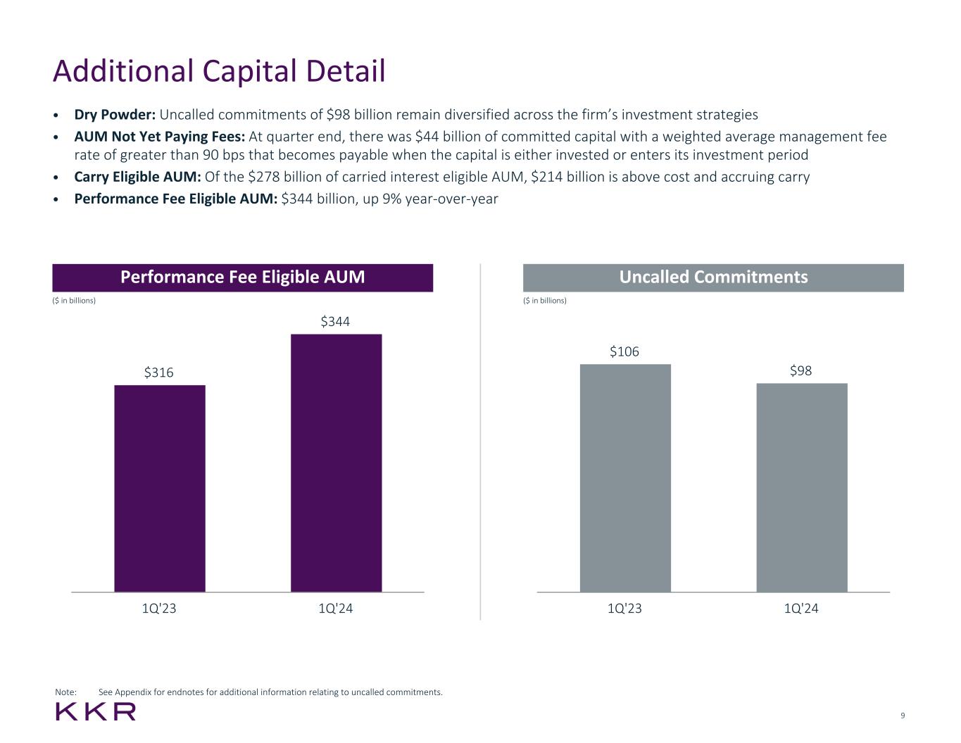 8 Assets Under Management • AUM of $578 billion, up 13% year-over-year, with $31 billion of organic new capital raised in the quarter and $88 billion in the LTM • Fee Paying AUM of $471 billion, up 13% year-over-year, with $36 billion of organic new capital raised in the quarter and $93 billion in the LTM • Perpetual Capital of $240 billion, up 22% year-over-year driven primarily by the organic growth of Global Atlantic. Perpetual capital represents 42% of AUM and 50% of FPAUM AUM Fee Paying AUM Perpetual Capital ($ in billions) ($ in billions) ($ in billions) $510 $578 1Q'23 1Q'24 $416 $471 1Q'23 1Q'24 $197 $240 1Q'23 1Q'24 Note: Perpetual capital is capital of indefinite duration, which may be reduced or terminated under certain conditions. See Appendix for endnotes about perpetual capital and other important information.