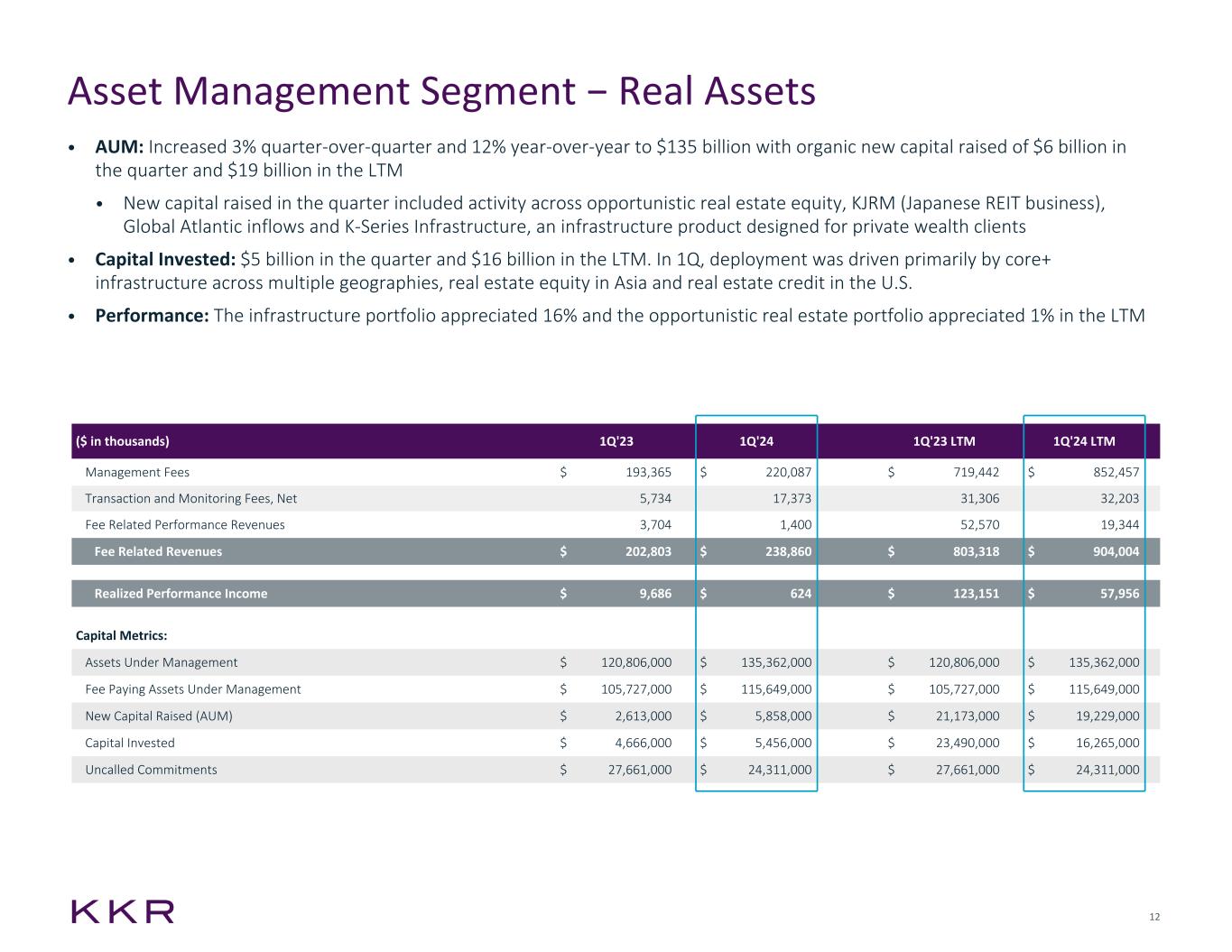 11 • AUM: Increased 4% quarter-over-quarter and increased 10% year-over-year to $183 billion with organic new capital raised of $4 billion in the quarter and $10 billion in the LTM • New capital raised in the quarter was primarily driven by Ascendant and K-Series PE, a private equity product designed for private wealth clients • Realizations: Carried Interest in 1Q driven primarily by core private equity, as well as traditional private equity secondary activity • Capital Invested: $1 billion in the quarter and $12 billion in the LTM. In 1Q, deployment was driven by traditional private equity and health care strategic growth in the U.S. • Performance: The traditional private equity portfolio appreciated 19% in the LTM Asset Management Segment − Private Equity ($ in thousands) 1Q'23 1Q'24 1Q'23 LTM 1Q'24 LTM Management Fees $ 316,341 $ 342,485 $ 1,222,620 $ 1,312,206 Transaction and Monitoring Fees, Net 34,274 15,805 121,628 96,807 Fee Related Performance Revenues — — — — Fee Related Revenues $ 350,615 $ 358,290 $ 1,344,248 $ 1,409,013 Realized Performance Income $ 163,052 $ 265,297 $ 1,462,809 $ 1,041,035 Capital Metrics: Assets Under Management $ 165,762,000 $ 182,766,000 $ 165,762,000 $ 182,766,000 Fee Paying Assets Under Management $ 102,323,000 $ 116,287,000 $ 102,323,000 $ 116,287,000 New Capital Raised (AUM) $ 349,000 $ 3,590,000 $ 11,825,000 $ 10,142,000 Capital Invested $ 2,863,000 $ 1,150,000 $ 17,304,000 $ 11,816,000 Uncalled Commitments $ 64,067,000 $ 55,017,000 $ 64,067,000 $ 55,017,000 Note: See Appendix for endnotes about our private equity business line and other important information.