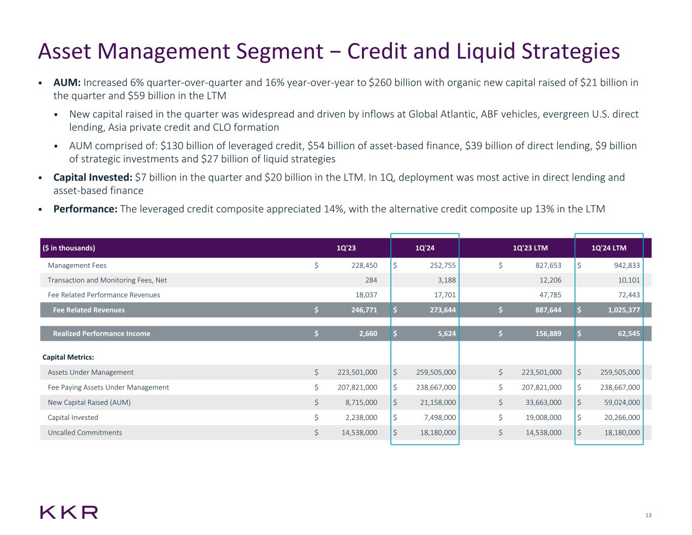 12 Asset Management Segment − Real Assets • AUM: Increased 3% quarter-over-quarter and 12% year-over-year to $135 billion with organic new capital raised of $6 billion in the quarter and $19 billion in the LTM • New capital raised in the quarter included activity across opportunistic real estate equity, KJRM (Japanese REIT business), Global Atlantic inflows and K-Series Infrastructure, an infrastructure product designed for private wealth clients • Capital Invested: $5 billion in the quarter and $16 billion in the LTM. In 1Q, deployment was driven primarily by core+ infrastructure across multiple geographies, real estate equity in Asia and real estate credit in the U.S. • Performance: The infrastructure portfolio appreciated 16% and the opportunistic real estate portfolio appreciated 1% in the LTM ($ in thousands) 1Q'23 1Q'24 1Q'23 LTM 1Q'24 LTM Management Fees $ 193,365 $ 220,087 $ 719,442 $ 852,457 Transaction and Monitoring Fees, Net 5,734 17,373 31,306 32,203 Fee Related Performance Revenues 3,704 1,400 52,570 19,344 Fee Related Revenues $ 202,803 $ 238,860 $ 803,318 $ 904,004 Realized Performance Income $ 9,686 $ 624 $ 123,151 $ 57,956 Capital Metrics: Assets Under Management $ 120,806,000 $ 135,362,000 $ 120,806,000 $ 135,362,000 Fee Paying Assets Under Management $ 105,727,000 $ 115,649,000 $ 105,727,000 $ 115,649,000 New Capital Raised (AUM) $ 2,613,000 $ 5,858,000 $ 21,173,000 $ 19,229,000 Capital Invested $ 4,666,000 $ 5,456,000 $ 23,490,000 $ 16,265,000 Uncalled Commitments $ 27,661,000 $ 24,311,000 $ 27,661,000 $ 24,311,000