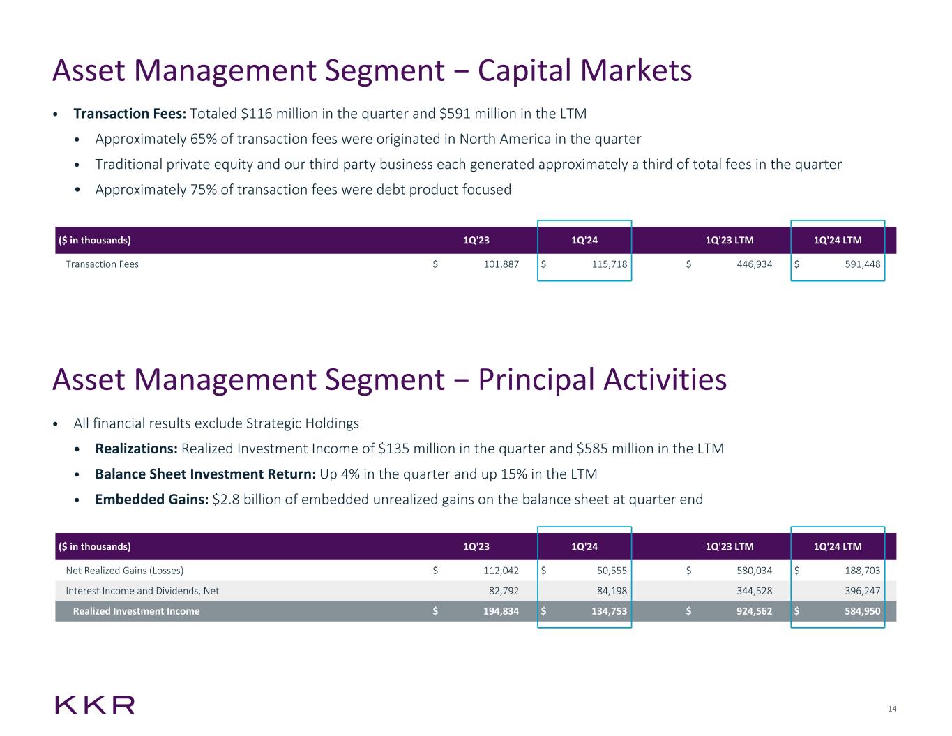 13 • AUM: Increased 6% quarter-over-quarter and 16% year-over-year to $260 billion with organic new capital raised of $21 billion in the quarter and $59 billion in the LTM • New capital raised in the quarter was widespread and driven by inflows at Global Atlantic, ABF vehicles, evergreen U.S. direct lending, Asia private credit and CLO formation • AUM comprised of: $130 billion of leveraged credit, $54 billion of asset-based finance, $39 billion of direct lending, $9 billion of strategic investments and $27 billion of liquid strategies • Capital Invested: $7 billion in the quarter and $20 billion in the LTM. In 1Q, deployment was most active in direct lending and asset-based finance • Performance: The leveraged credit composite appreciated 14%, with the alternative credit composite up 13% in the LTM ($ in thousands) 1Q'23 1Q'24 1Q'23 LTM 1Q'24 LTM Management Fees $ 228,450 $ 252,755 $ 827,653 $ 942,833 Transaction and Monitoring Fees, Net 284 3,188 12,206 10,101 Fee Related Performance Revenues 18,037 17,701 47,785 72,443 Fee Related Revenues $ 246,771 $ 273,644 $ 887,644 $ 1,025,377 Realized Performance Income $ 2,660 $ 5,624 $ 156,889 $ 62,545 Capital Metrics: Assets Under Management $ 223,501,000 $ 259,505,000 $ 223,501,000 $ 259,505,000 Fee Paying Assets Under Management $ 207,821,000 $ 238,667,000 $ 207,821,000 $ 238,667,000 New Capital Raised (AUM) $ 8,715,000 $ 21,158,000 $ 33,663,000 $ 59,024,000 Capital Invested $ 2,238,000 $ 7,498,000 $ 19,008,000 $ 20,266,000 Uncalled Commitments $ 14,538,000 $ 18,180,000 $ 14,538,000 $ 18,180,000 Asset Management Segment − Credit and Liquid Strategies