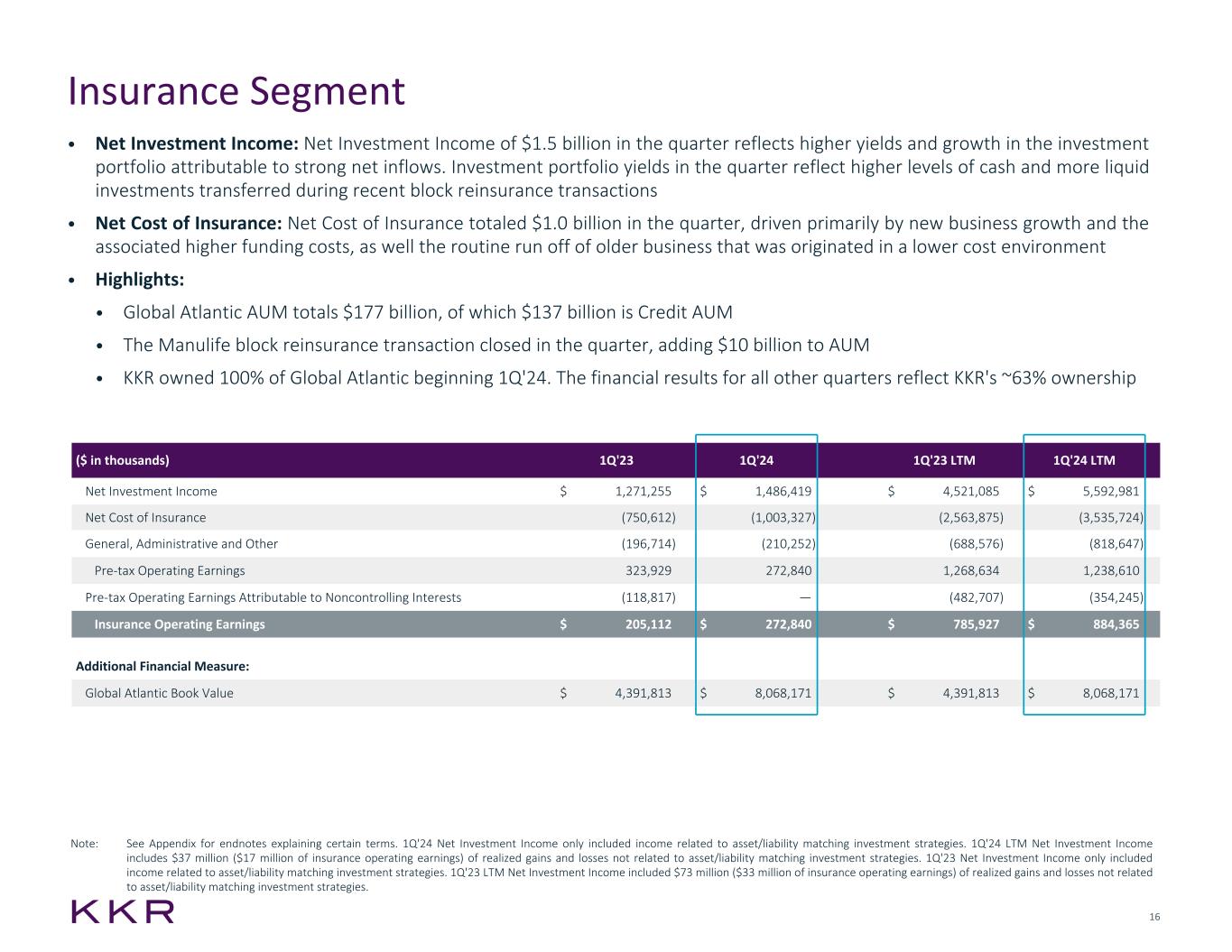 16 • Net Investment Income: Net Investment Income of $1.5 billion in the quarter reflects higher yields and growth in the investment portfolio attributable to strong net inflows. Investment portfolio yields in the quarter reflect higher levels of cash and more liquid investments transferred during recent block reinsurance transactions • Net Cost of Insurance: Net Cost of Insurance totaled $1.0 billion in the quarter, driven primarily by new business growth and the associated higher funding costs, as well the routine run off of older business that was originated in a lower cost environment • Highlights: • Global Atlantic AUM totals $177 billion, of which $137 billion is Credit AUM • The Manulife block reinsurance transaction closed in the quarter, adding $10 billion to AUM • KKR owned 100% of Global Atlantic beginning 1Q'24. The financial results for all other quarters reflect KKR's ~63% ownership Insurance Segment ($ in thousands) 1Q'23 1Q'24 1Q'23 LTM 1Q'24 LTM Net Investment Income $ 1,271,255 $ 1,486,419 $ 4,521,085 $ 5,592,981 Net Cost of Insurance (750,612) (1,003,327) (2,563,875) (3,535,724) General, Administrative and Other (196,714) (210,252) (688,576) (818,647) Pre-tax Operating Earnings 323,929 272,840 1,268,634 1,238,610 Pre-tax Operating Earnings Attributable to Noncontrolling Interests (118,817) — (482,707) (354,245) Insurance Operating Earnings $ 205,112 $ 272,840 $ 785,927 $ 884,365 Additional Financial Measure: Global Atlantic Book Value $ 4,391,813 $ 8,068,171 $ 4,391,813 $ 8,068,171 Note: See Appendix for endnotes explaining certain terms. 1Q'24 Net Investment Income only included income related to asset/liability matching investment strategies. 1Q'24 LTM Net Investment Income includes $37 million ($17 million of insurance operating earnings) of realized gains and losses not related to asset/liability matching investment strategies. 1Q'23 Net Investment Income only included income related to asset/liability matching investment strategies. 1Q'23 LTM Net Investment Income included $73 million ($33 million of insurance operating earnings) of realized gains and losses not related to asset/liability matching investment strategies.