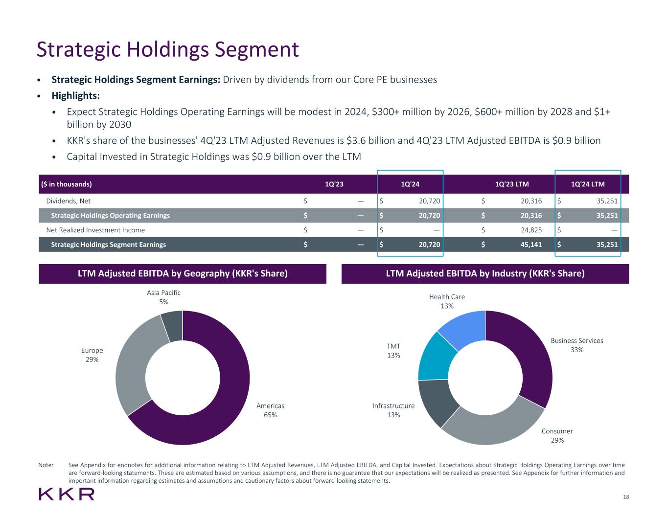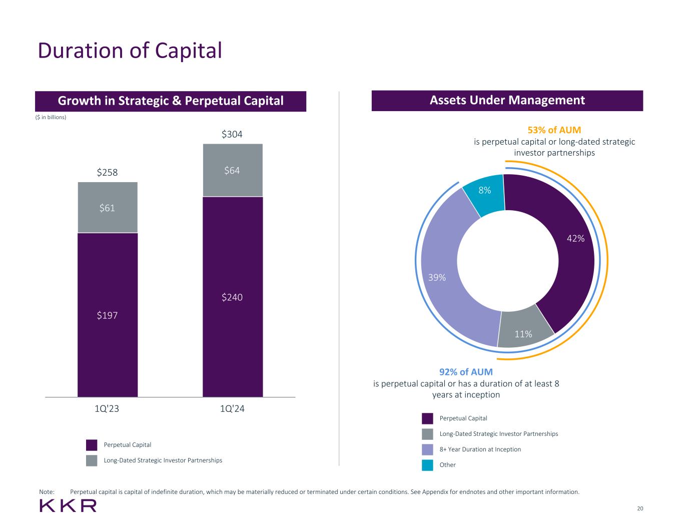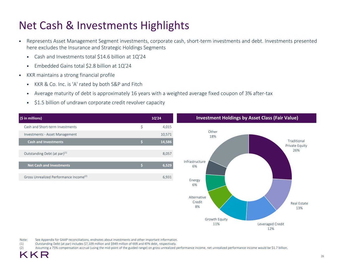 37 Notes to Page 18 – Strategic Holdings Segment • The adjusted revenue and adjusted EBITDA information represents the measures management currently uses to monitor the operating performance of the businesses. • The Capital Invested for Strategic Holdings segment is included in Private Equity Capital Invested within the Asset Management segment and relates to Core Private Equity. • LTM Adjusted EBITDA is shown based on the geographic location of the businesses' headquarters. • LTM Adjusted revenue and EBITDA represents KKR’s look-through ownership percentage for each of these companies in the aggregate as a result of the firm's investments in these companies through its participation in our core private equity strategy multiplied by the revenue and EBITDA of each portfolio company, respectively. Non-U.S. dollar businesses have been converted at the period-ending foreign exchange rate. The calculation reflects the underlying revenue or EBITDA growth of investments made in the preceding periods, assuming those businesses were owned for the full acquisition year and are shown on a constant currency / constant ownership percentage basis. We believe this is helpful to the investor to show a steady state growth profile of the underlying portfolio on an organic basis. • A reconciliation of the forecasts for certain non-GAAP measures, including Strategic Holdings Operating Earnings to their corresponding GAAP measures has not been provided due to the unreasonable efforts it would take to provide such a reconciliation Notes to Page 20 – Duration of Capital • Please see endnote for page 8 for information about the term "perpetual capital." • "Other" in the chart primarily includes hedge fund partnerships and certain leveraged credit funds. Notes to Page 21 – Assets Under Management Rollforward • For the three months ended March 31, 2024, Distributions and Other includes $128 million of redemptions by fund investors in Real Assets and $2,893 million of redemptions by fund investors in Credit and Liquid Strategies. • For the twelve months ended March 31, 2024, Distributions and Other includes $360 million of redemptions by fund investors in Real Assets and $8,396 million of redemptions by fund investors in Credit and Liquid Strategies. Notes to Page 22 – Fee Paying Assets Under Management Rollforward • For the three months ended March 31, 2024, Distributions and Other includes $128 million of redemptions by fund investors in Real Assets and $2,893 million of redemptions by fund investors in Credit and Liquid Strategies. Important Information − Endnotes (cont’d) • For the twelve months ended March 31, 2024, Distributions and Other includes net changes in fee base of certain Real Assets funds of $805 million, $360 million of redemptions by fund investors in Real Assets, and $8,396 million of redemptions by fund investors in Credit and Liquid Strategies. Notes to Pages 23 to 25 – Investment Vehicle Summary • The start date represents the start of the fund's investment period as defined in the fund's governing documents and may or may not be the same as the date upon which management fees begin to accrue. • The end date represents the end of the fund's investment period as defined in the fund's governing documents and is generally not the date upon which management fees cease to accrue. For funds that initially charge management fees on the basis of committed capital, the end date is generally the date on or after which the management fees begin to be calculated instead on the basis of invested capital and may, for certain funds, begin to be calculated using a lower rate. • This table includes investment vehicles which are not investment funds. The terms investments and investment vehicles are terms used solely for purposes of financial presentation. Note to Page 26 – Net Cash & Investments Highlight • The Investment amounts do not include KKR's ownership of the Global Atlantic insurance companies through KKR's insurance segment or KKR's participation in the core private equity strategy through KKR's Strategic Holdings segment. • The term “investments” has been presented solely for purposes of demonstrating the financial performance of certain assets contained on KKR’s balance sheet, including majority ownership of subsidiaries that operate KKR’s asset management, insurance businesses, broker-dealer and other businesses, including the general partner interests of KKR’s investment funds. • Traditional private equity includes KKR traditional private equity funds, co-investments alongside such KKR sponsored private equity funds, and other opportunistic investments. Equity investments in other asset classes, such as growth equity, energy, real estate, infrastructure, leveraged credit and alternative credit appear in these other asset classes.