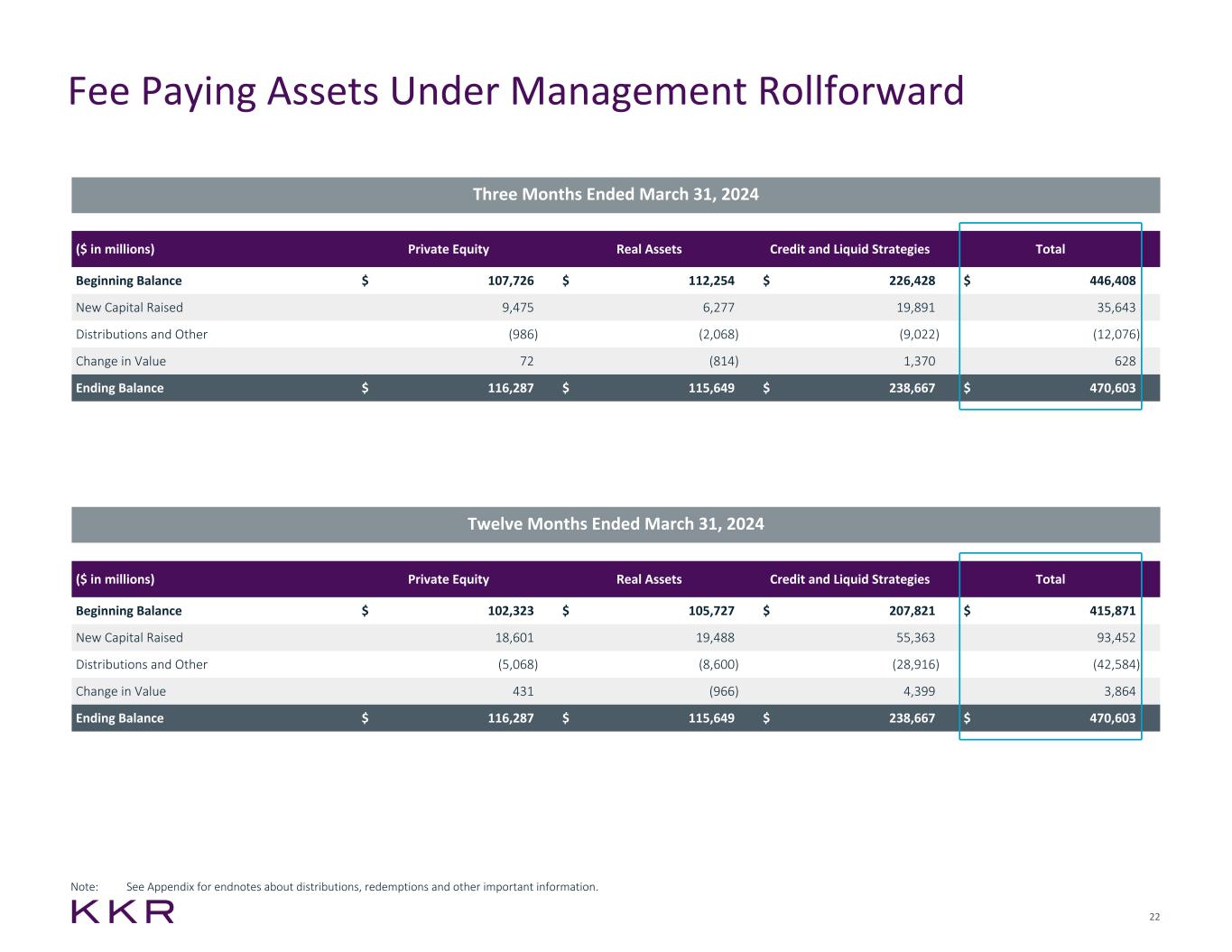 21 Assets Under Management Rollforward Twelve Months Ended March 31, 2024 ($ in millions) Private Equity Real Assets Credit and Liquid Strategies Total Beginning Balance $ 165,762 $ 120,806 $ 223,501 $ 510,069 New Capital Raised 10,142 19,229 59,024 88,395 Distributions and Other (10,030) (7,734) (28,667) (46,431) Change in Value 16,892 3,061 5,647 25,600 Ending Balance $ 182,766 $ 135,362 $ 259,505 $ 577,633 ($ in millions) Private Equity Real Assets Credit and Liquid Strategies Total Beginning Balance $ 176,377 $ 130,933 $ 245,491 $ 552,801 New Capital Raised 3,590 5,858 21,158 30,606 Distributions and Other (1,917) (1,858) (8,952) (12,727) Change in Value 4,716 429 1,808 6,953 Ending Balance $ 182,766 $ 135,362 $ 259,505 $ 577,633 Three Months Ended March 31, 2024 Note: See Appendix for endnotes about distributions, redemptions and other important information.