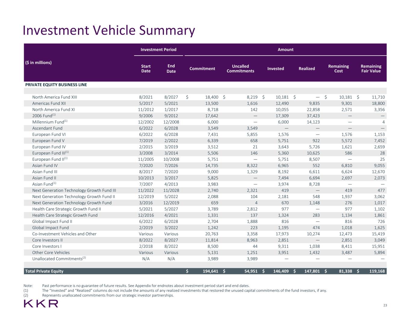 23 Investment Vehicle Summary ($ in thousands) 4Q'21 4Q'22 FY'21 FY'22 Net Investment Income $ 1,352,187 $ 1,230,677 $ 3,329,570 $ 4,112,244 Net Cost of Insurance (490,115) (751,332) (1,566,681) (2,415,996) General, Administrative and Other (162,085) (164,923) (500,410) (637,718) Pre-tax Insurance Operating Earnings 699,987 314,422 1,262,479 1,058,530 Income Taxes (135,947) (45,817) (199,095) (171,744) Net Income Attributable to Noncontrolling Interests (217,263) (103,464) (410,833) (341,582) Insurance Segment Operating Earnings $ 346,777 $ 165,141 $ 652,551 $ 545,204 Additional Financial Measures: Global Atlantic Book Value $ 3,372,498 $ 3,929,710 $ 3,372,498 $ 3,929,710 ($ in millions) Investment Period Amount Start Date End Date Commitment Uncalled Commitments Invested Realized Remaining Cost Remaining Fair Value PRIVATE EQUITY BUSINESS LINE North America Fund XIII 8/2021 8/2027 $ 18,400 $ 8,219 $ 10,181 $ — $ 10,181 $ 11,710 Americas Fund XII 5/2017 5/2021 13,500 1,616 12,490 9,835 9,301 18,800 North America Fund XI 11/2012 1/2017 8,718 142 10,055 22,858 2,571 3,356 2006 Fund(1) 9/2006 9/2012 17,642 — 17,309 37,423 — — Millennium Fund(1) 12/2002 12/2008 6,000 — 6,000 14,123 — 4 Ascendant Fund 6/2022 6/2028 3,549 3,549 — — — — European Fund VI 6/2022 6/2028 7,431 5,855 1,576 — 1,576 1,153 European Fund V 7/2019 2/2022 6,339 658 5,751 922 5,572 7,452 European Fund IV 2/2015 3/2019 3,512 21 3,643 5,726 1,621 2,659 European Fund III(1) 3/2008 3/2014 5,506 146 5,360 10,625 586 28 European Fund II(1) 11/2005 10/2008 5,751 — 5,751 8,507 — 25 Asian Fund IV 7/2020 7/2026 14,735 8,322 6,965 552 6,810 9,055 Asian Fund III 8/2017 7/2020 9,000 1,329 8,192 6,611 6,624 12,670 Asian Fund II 10/2013 3/2017 5,825 — 7,494 6,694 2,697 2,073 Asian Fund(1) 7/2007 4/2013 3,983 — 3,974 8,728 — — Next Generation Technology Growth Fund III 11/2022 11/2028 2,740 2,321 419 — 419 477 Next Generation Technology Growth Fund II 12/2019 5/2022 2,088 104 2,181 548 1,937 3,062 Next Generation Technology Growth Fund 3/2016 12/2019 659 4 670 1,148 276 1,017 Health Care Strategic Growth Fund II 5/2021 5/2027 3,789 2,812 977 — 977 1,102 Health Care Strategic Growth Fund 12/2016 4/2021 1,331 137 1,324 283 1,134 1,861 Global Impact Fund II 6/2022 6/2028 2,704 1,888 816 — 816 726 Global Impact Fund 2/2019 3/2022 1,242 223 1,195 474 1,018 1,625 Co-Investment Vehicles and Other Various Various 20,763 3,358 17,973 10,274 12,473 15,419 Core Investors II 8/2022 8/2027 11,814 8,963 2,851 — 2,851 3,049 Core Investors I 2/2018 8/2022 8,500 44 9,311 1,038 8,411 15,951 Other Core Vehicles Various Various 5,131 1,251 3,951 1,432 3,487 5,894 Unallocated Commitments(2) N/A N/A 3,989 3,989 — — — — Total Private Equity $ 194,641 $ 54,951 $ 146,409 $ 147,801 $ 81,338 $ 119,168 Note: Past performance is no guarantee of future results. See Appendix for endnotes about investment period start and end dates. (1) The “Invested" and “Realized” columns do not include the amounts of any realized investments that restored the unused capital commitments of the fund investors, if any. (2) Represents unallocated commitments from our strategic investor partnerships.