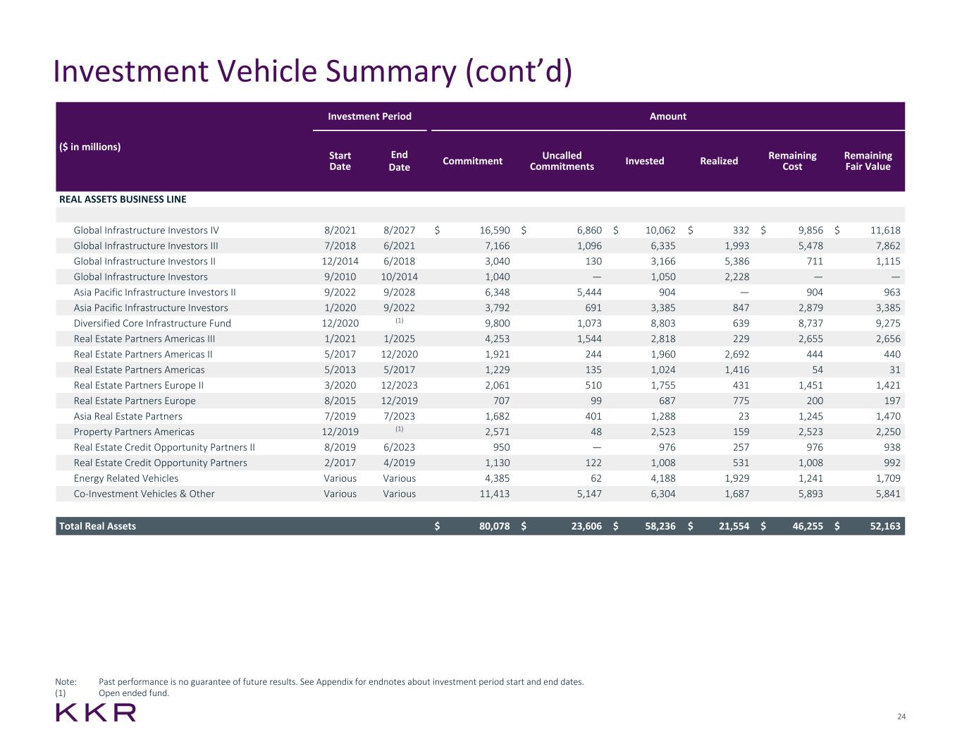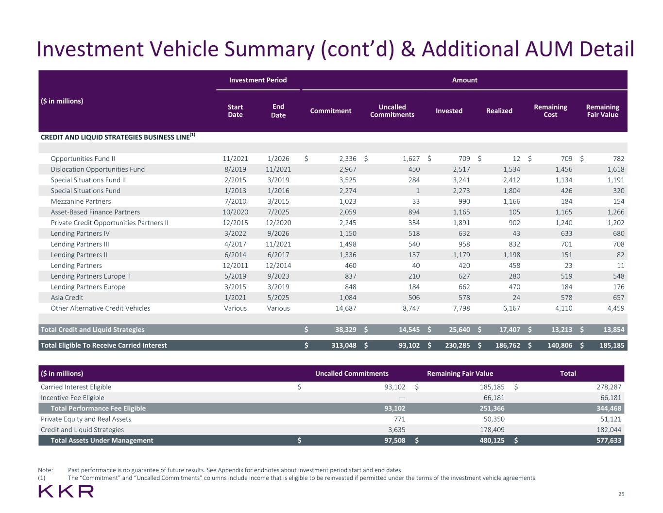 24 Investment Vehicle Summary (cont’d) Note: Past performance is no guarantee of future results. See Appendix for endnotes about investment period start and end dates. (1) Open ended fund. ($ in millions) Investment Period Amount Start Date End Date Commitment Uncalled Commitments Invested Realized Remaining Cost Remaining Fair Value REAL ASSETS BUSINESS LINE Global Infrastructure Investors IV 8/2021 8/2027 $ 16,590 $ 6,860 $ 10,062 $ 332 $ 9,856 $ 11,618 Global Infrastructure Investors III 7/2018 6/2021 7,166 1,096 6,335 1,993 5,478 7,862 Global Infrastructure Investors II 12/2014 6/2018 3,040 130 3,166 5,386 711 1,115 Global Infrastructure Investors 9/2010 10/2014 1,040 — 1,050 2,228 — — Asia Pacific Infrastructure Investors II 9/2022 9/2028 6,348 5,444 904 — 904 963 Asia Pacific Infrastructure Investors 1/2020 9/2022 3,792 691 3,385 847 2,879 3,385 Diversified Core Infrastructure Fund 12/2020 (1) 9,800 1,073 8,803 639 8,737 9,275 Real Estate Partners Americas III 1/2021 1/2025 4,253 1,544 2,818 229 2,655 2,656 Real Estate Partners Americas II 5/2017 12/2020 1,921 244 1,960 2,692 444 440 Real Estate Partners Americas 5/2013 5/2017 1,229 135 1,024 1,416 54 31 Real Estate Partners Europe II 3/2020 12/2023 2,061 510 1,755 431 1,451 1,421 Real Estate Partners Europe 8/2015 12/2019 707 99 687 775 200 197 Asia Real Estate Partners 7/2019 7/2023 1,682 401 1,288 23 1,245 1,470 Property Partners Americas 12/2019 (1) 2,571 48 2,523 159 2,523 2,250 Real Estate Credit Opportunity Partners II 8/2019 6/2023 950 — 976 257 976 938 Real Estate Credit Opportunity Partners 2/2017 4/2019 1,130 122 1,008 531 1,008 992 Energy Related Vehicles Various Various 4,385 62 4,188 1,929 1,241 1,709 Co-Investment Vehicles & Other Various Various 11,413 5,147 6,304 1,687 5,893 5,841 Total Real Assets $ 80,078 $ 23,606 $ 58,236 $ 21,554 $ 46,255 $ 52,163