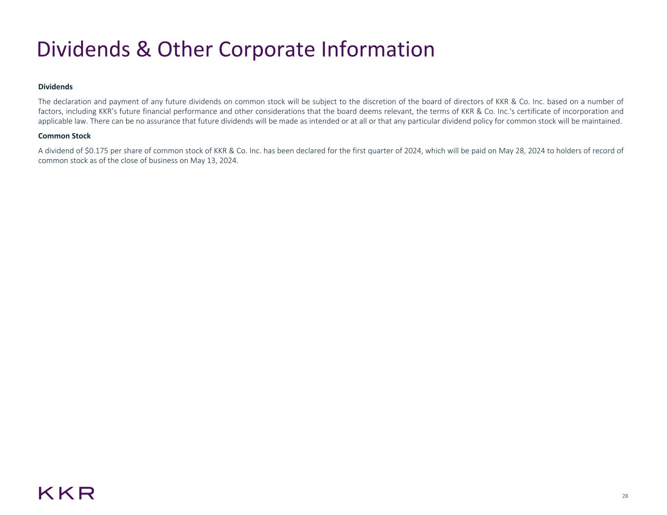 28 Dividends The declaration and payment of any future dividends on common stock will be subject to the discretion of the board of directors of KKR & Co. Inc. based on a number of factors, including KKR’s future financial performance and other considerations that the board deems relevant, the terms of KKR & Co. Inc.'s certificate of incorporation and applicable law. There can be no assurance that future dividends will be made as intended or at all or that any particular dividend policy for common stock will be maintained. Common Stock A dividend of $0.175 per share of common stock of KKR & Co. Inc. has been declared for the first quarter of 2024, which will be paid on May 28, 2024 to holders of record of common stock as of the close of business on May 13, 2024. Dividends & Other Corporate Information