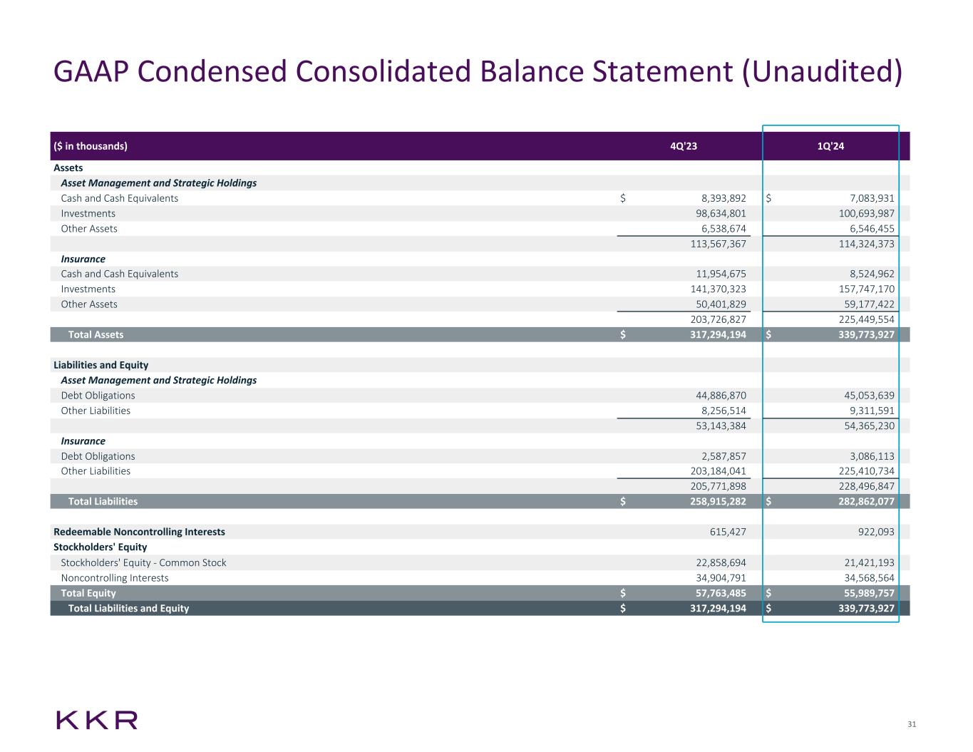 30 GAAP Condensed Consolidated Income Statement (Unaudited) ($ in thousands) 1Q'23 1Q'24 1Q'23 LTM 1Q'24 LTM Revenues Asset Management and Strategic Holdings Fees and Other $ 677,016 $ 693,526 $ 2,718,132 $ 2,980,379 Capital Allocation-Based Income (Loss) 449,018 1,262,942 (1,105,748) 3,657,361 1,126,034 1,956,468 1,612,384 6,637,740 Insurance Net Premiums 473,624 6,036,522 1,283,941 7,538,573 Policy Fees 313,802 328,947 1,261,741 1,275,394 Net Investment Income 1,300,697 1,519,902 4,606,338 5,734,107 Net Investment-Related Gains (Losses) (123,833) (241,486) (1,073,643) (352,915) Other Income 37,158 56,385 141,538 195,669 2,001,448 7,700,270 6,219,915 14,390,828 Total Revenues $ 3,127,482 $ 9,656,738 $ 7,832,299 $ 21,028,568 Expenses Asset Management and Strategic Holdings Compensation and Benefits 575,670 1,316,448 1,436,664 3,753,465 Occupancy and Related Charges 22,149 23,540 81,271 94,782 General, Administrative and Other 213,689 277,981 972,572 1,121,191 811,508 1,617,969 2,490,507 4,969,438 Insurance Net Policy Benefits and Claims 1,527,054 7,261,069 3,372,114 12,096,272 Amortization of Policy Acquisition Costs 44,211 (3,752) 88,138 39,312 Interest Expense 40,261 54,567 114,224 188,189 Insurance Expenses 225,318 199,236 672,100 799,916 General, Administrative and Other 211,731 183,855 763,084 718,339 2,048,575 7,694,975 5,009,660 13,842,028 Total Expenses $ 2,860,083 $ 9,312,944 $ 7,500,167 $ 18,811,466 Investment Income (Loss) - Asset Management and Strategic Holdings Net Gains (Losses) from Investment Activities (159,409) 638,162 (2,739,207) 3,822,954 Dividend Income 148,167 245,057 808,264 888,050 Interest Income 728,616 890,102 2,271,342 3,530,933 Interest Expense (576,338) (754,064) (1,845,356) (2,949,814) Total Investment Income (Loss) $ 141,036 $ 1,019,257 $ (1,504,957) $ 5,292,123 Income Tax Expense (Benefit) 148,747 269,201 237,489 1,317,977 Redeemable Noncontrolling Interests (7,303) 32,678 (4,448) 34,576 Noncontrolling Interests (73,003) 378,958 (1,216,732) 2,082,191 Preferred Stock Dividends 17,250 — 69,000 34,497 Net Income (Loss) - KKR Common Stockholders $ 322,744 $ 682,214 $ (258,134) $ 4,039,984
