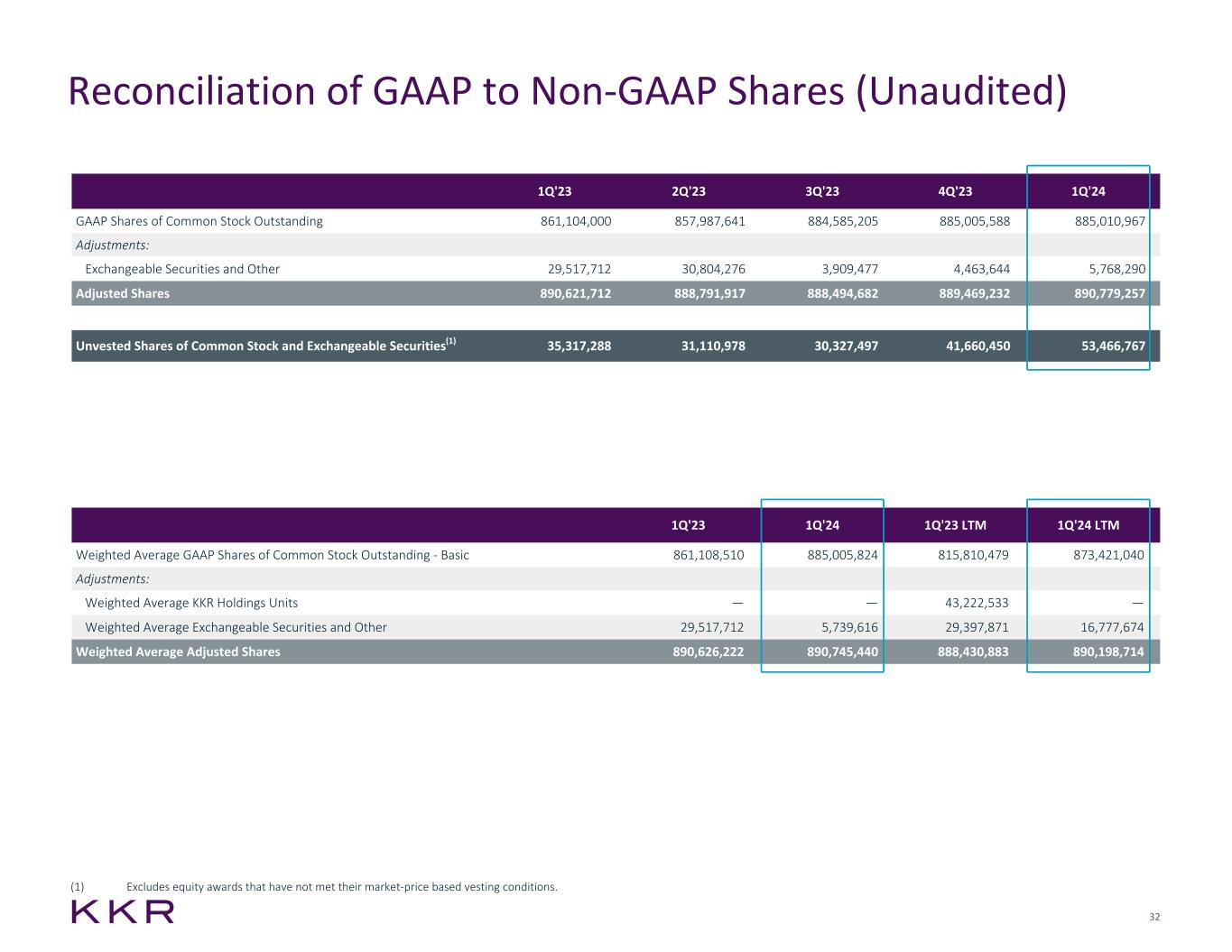 32 Reconciliation of GAAP to Non-GAAP Shares (Unaudited) 1Q'23 1Q'24 1Q'23 LTM 1Q'24 LTM Weighted Average GAAP Shares of Common Stock Outstanding - Basic 861,108,510 885,005,824 815,810,479 873,421,040 Adjustments: Weighted Average KKR Holdings Units — — 43,222,533 — Weighted Average Exchangeable Securities and Other 29,517,712 5,739,616 29,397,871 16,777,674 Weighted Average Adjusted Shares 890,626,222 890,745,440 888,430,883 890,198,714 1Q'23 2Q'23 3Q'23 4Q'23 1Q'24 GAAP Shares of Common Stock Outstanding 861,104,000 857,987,641 884,585,205 885,005,588 885,010,967 Adjustments: Exchangeable Securities and Other 29,517,712 30,804,276 3,909,477 4,463,644 5,768,290 Adjusted Shares 890,621,712 888,791,917 888,494,682 889,469,232 890,779,257 Unvested Shares of Common Stock and Exchangeable Securities(1) 35,317,288 31,110,978 30,327,497 41,660,450 53,466,767 (1) Excludes equity awards that have not met their market-price based vesting conditions.
