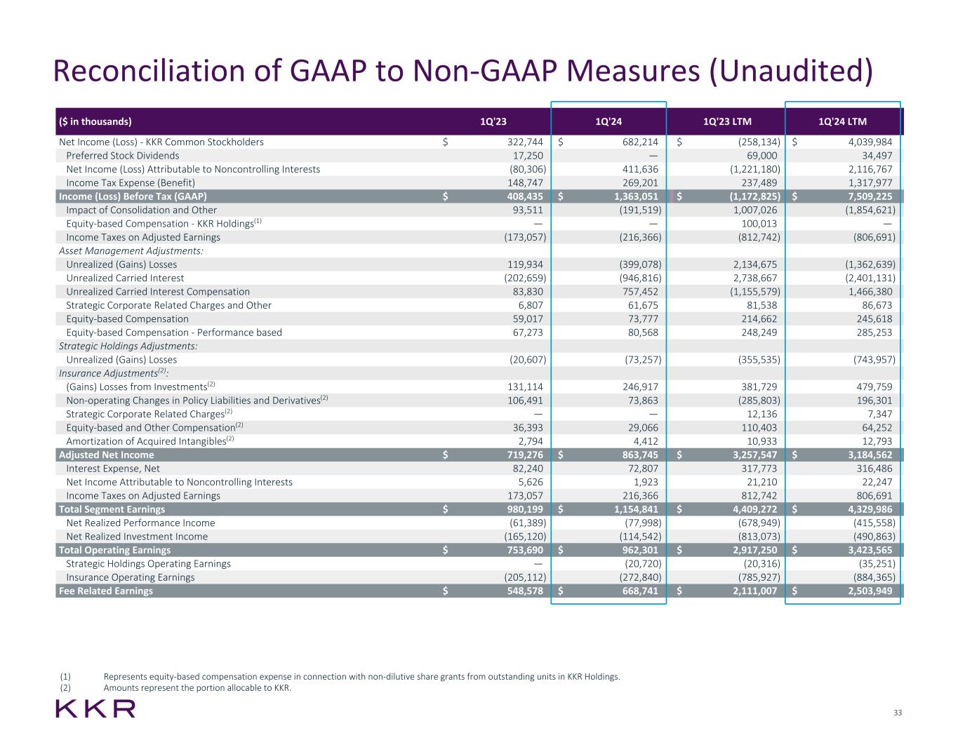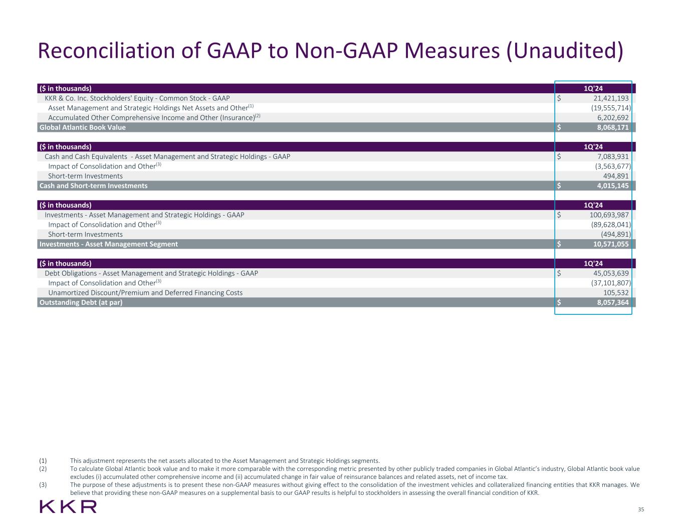 33 Reconciliation of GAAP to Non-GAAP Measures (Unaudited) (1) Represents equity-based compensation expense in connection with non-dilutive share grants from outstanding units in KKR Holdings. (2) Amounts represent the portion allocable to KKR. ($ in thousands) 1Q'23 1Q'24 1Q'23 LTM 1Q'24 LTM Net Income (Loss) - KKR Common Stockholders $ 322,744 $ 682,214 $ (258,134) $ 4,039,984 Preferred Stock Dividends 17,250 — 69,000 34,497 Net Income (Loss) Attributable to Noncontrolling Interests (80,306) 411,636 (1,221,180) 2,116,767 Income Tax Expense (Benefit) 148,747 269,201 237,489 1,317,977 Income (Loss) Before Tax (GAAP) $ 408,435 $ 1,363,051 $ (1,172,825) $ 7,509,225 Impact of Consolidation and Other 93,511 (191,519) 1,007,026 (1,854,621) Equity-based Compensation - KKR Holdings(1) — — 100,013 — Income Taxes on Adjusted Earnings (173,057) (216,366) (812,742) (806,691) Asset Management Adjustments: Unrealized (Gains) Losses 119,934 (399,078) 2,134,675 (1,362,639) Unrealized Carried Interest (202,659) (946,816) 2,738,667 (2,401,131) Unrealized Carried Interest Compensation 83,830 757,452 (1,155,579) 1,466,380 Strategic Corporate Related Charges and Other 6,807 61,675 81,538 86,673 Equity-based Compensation 59,017 73,777 214,662 245,618 Equity-based Compensation - Performance based 67,273 80,568 248,249 285,253 Strategic Holdings Adjustments: Unrealized (Gains) Losses (20,607) (73,257) (355,535) (743,957) Insurance Adjustments(2): (Gains) Losses from Investments(2) 131,114 246,917 381,729 479,759 Non-operating Changes in Policy Liabilities and Derivatives(2) 106,491 73,863 (285,803) 196,301 Strategic Corporate Related Charges(2) — — 12,136 7,347 Equity-based and Other Compensation(2) 36,393 29,066 110,403 64,252 Amortization of Acquired Intangibles(2) 2,794 4,412 10,933 12,793 Adjusted Net Income $ 719,276 $ 863,745 $ 3,257,547 $ 3,184,562 Interest Expense, Net 82,240 72,807 317,773 316,486 Net Income Attributable to Noncontrolling Interests 5,626 1,923 21,210 22,247 Income Taxes on Adjusted Earnings 173,057 216,366 812,742 806,691 Total Segment Earnings $ 980,199 $ 1,154,841 $ 4,409,272 $ 4,329,986 Net Realized Performance Income (61,389) (77,998) (678,949) (415,558) Net Realized Investment Income (165,120) (114,542) (813,073) (490,863) Total Operating Earnings $ 753,690 $ 962,301 $ 2,917,250 $ 3,423,565 Strategic Holdings Operating Earnings — (20,720) (20,316) (35,251) Insurance Operating Earnings (205,112) (272,840) (785,927) (884,365) Fee Related Earnings $ 548,578 $ 668,741 $ 2,111,007 $ 2,503,949