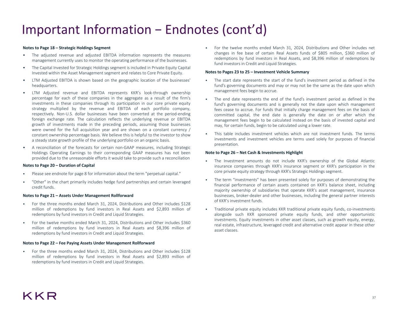 36 • The leveraged credit composite refers to the composite of certain investment portfolios made in KKR’s collateralized loan obligations and U.S. and European leveraged credit strategies including leveraged loans, high-yield bonds and opportunistic credit. • The alternative credit composite refers to the composite of certain investment portfolios made in KKR's private credit strategy, including direct lending (including our business development company), asset-based finance and junior capital, and in the Strategic Investments Group ("SIG") strategy. Funds and separately managed accounts in liquidation or discontinued strategies are excluded. • For a list of our carry paying funds, see the Investment Vehicle Summary on pages 23 to 25. See also “Important Information – Other Legal Disclosures” regarding past performance and investment returns. Note to Page 11 – Asset Management Segment – Private Equity • Except as otherwise noted, amounts referencing the private equity business line include amounts related to core private equity, including KKR's participation through the Strategic Holdings segment. Notes to Page 16 – Insurance Segment • Net investment income represents income earned on invested assets, net of investment-related expenses, including investment management fees paid to KKR. • Net cost of insurance represents the net cost of funding institutional and individual products – interest credited or incurred, benefits incurred, the associated insurance expenses, net of any premiums, fees and other income earned. . Note to All Pages • All figures in this presentation are as of March 31, 2024, unless otherwise specifically indicated. • References to LTM means last twelve months. Note to Page 3 – First Quarter 2024 Segment Earnings • The amount of tax benefit from equity-based compensation for 1Q'24 and 1Q'23 was $26.2 million and $13.7 million, respectively, and for 1Q'24 LTM and 1Q'23 LTM was $63.8 million and $67.3 million, respectively. Its inclusion in Adjusted Net Income had the effect of increasing this metric for 1Q'24 and 1Q'23 by 3% and 2%, respectively, and for 1Q'24 LTM and 1Q'23 LTM both by 2%. Note to Page 8 – Assets Under Management • Perpetual capital refers to a component of AUM that has an indefinite term and for which there is no predetermined requirement to return invested capital to investors upon the realization of investments. Perpetual capital includes the AUM of our registered funds, certain unregistered funds, listed companies, and insurance companies, and it excludes our traditional private equity funds, similarly structured investment funds, collateralized loan obligations, hedge fund partnerships and certain other investment vehicles. Investors should not view this component of our AUM as being permanent without exception, because it can be subject to material reductions and even termination. Perpetual capital is subject to material reductions from changes in valuation and withdrawals by or payments to investors, clients and policyholders (including through elections by investors to redeem their fund investments, periodic dividends, and payment obligations under insurance policies and reinsurance agreements) as well as termination by a client of, or failure to renew, its investment management agreement with KKR. Note to Page 9 – Additional Capital Detail • KKR’s portion of Uncalled Commitments to its investment funds includes $4.6 billion, $2.2 billion and $1.2 billion to its Private Equity, Real Assets and Credit and Liquid Strategies business lines, respectively. Notes to Page 10 – Fund Investment Performance • Traditional private equity portfolio refers to the portfolio of investments held by all KKR’s private equity flagship funds. This portfolio does not include investments from KKR’s growth equity or core private equity. • Opportunistic real estate portfolio refers to the portfolio of investments held by KKR’s flagship opportunistic real estate equity funds. This portfolio does not include investments from KKR's core plus real estate funds or real estate credit funds. • Infrastructure portfolio refers to the portfolio of investments held by KKR’s flagship core plus infrastructure equity funds. This portfolio does not include investments from KKR’s core infrastructure fund, KKR Diversified Core Infrastructure. Important Information − Endnotes