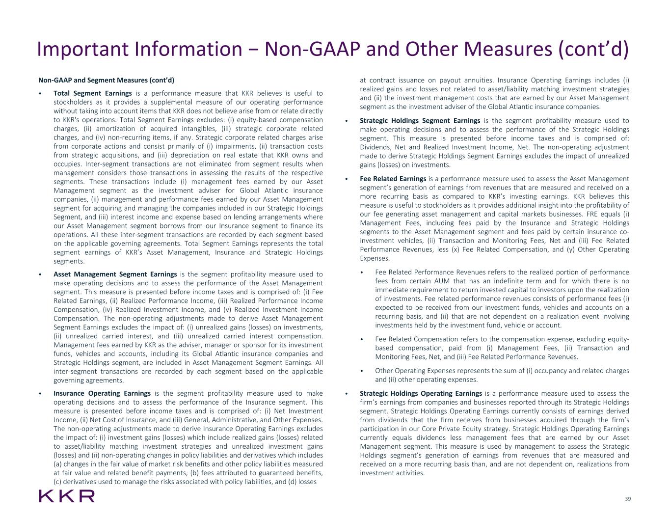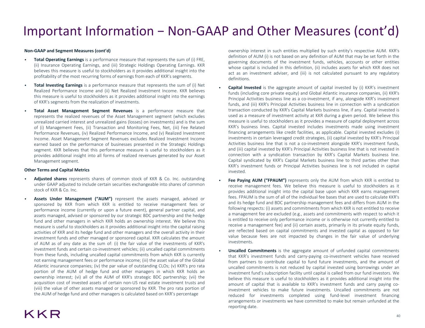 39 Non-GAAP and Segment Measures (cont’d) • Total Segment Earnings is a performance measure that KKR believes is useful to stockholders as it provides a supplemental measure of our operating performance without taking into account items that KKR does not believe arise from or relate directly to KKR's operations. Total Segment Earnings excludes: (i) equity-based compensation charges, (ii) amortization of acquired intangibles, (iii) strategic corporate related charges, and (iv) non-recurring items, if any. Strategic corporate related charges arise from corporate actions and consist primarily of (i) impairments, (ii) transaction costs from strategic acquisitions, and (iii) depreciation on real estate that KKR owns and occupies. Inter-segment transactions are not eliminated from segment results when management considers those transactions in assessing the results of the respective segments. These transactions include (i) management fees earned by our Asset Management segment as the investment adviser for Global Atlantic insurance companies, (ii) management and performance fees earned by our Asset Management segment for acquiring and managing the companies included in our Strategic Holdings Segment, and (iii) interest income and expense based on lending arrangements where our Asset Management segment borrows from our Insurance segment to finance its operations. All these inter-segment transactions are recorded by each segment based on the applicable governing agreements. Total Segment Earnings represents the total segment earnings of KKR’s Asset Management, Insurance and Strategic Holdings segments. • Asset Management Segment Earnings is the segment profitability measure used to make operating decisions and to assess the performance of the Asset Management segment. This measure is presented before income taxes and is comprised of: (i) Fee Related Earnings, (ii) Realized Performance Income, (iii) Realized Performance Income Compensation, (iv) Realized Investment Income, and (v) Realized Investment Income Compensation. The non-operating adjustments made to derive Asset Management Segment Earnings excludes the impact of: (i) unrealized gains (losses) on investments, (ii) unrealized carried interest, and (iii) unrealized carried interest compensation. Management fees earned by KKR as the adviser, manager or sponsor for its investment funds, vehicles and accounts, including its Global Atlantic insurance companies and Strategic Holdings segment, are included in Asset Management Segment Earnings. All inter-segment transactions are recorded by each segment based on the applicable governing agreements. • Insurance Operating Earnings is the segment profitability measure used to make operating decisions and to assess the performance of the Insurance segment. This measure is presented before income taxes and is comprised of: (i) Net Investment Income, (ii) Net Cost of Insurance, and (iii) General, Administrative, and Other Expenses. The non-operating adjustments made to derive Insurance Operating Earnings excludes the impact of: (i) investment gains (losses) which include realized gains (losses) related to asset/liability matching investment strategies and unrealized investment gains (losses) and (ii) non-operating changes in policy liabilities and derivatives which includes (a) changes in the fair value of market risk benefits and other policy liabilities measured at fair value and related benefit payments, (b) fees attributed to guaranteed benefits, (c) derivatives used to manage the risks associated with policy liabilities, and (d) losses Important Information − Non-GAAP and Other Measures (cont’d) at contract issuance on payout annuities. Insurance Operating Earnings includes (i) realized gains and losses not related to asset/liability matching investment strategies and (ii) the investment management costs that are earned by our Asset Management segment as the investment adviser of the Global Atlantic insurance companies. • Strategic Holdings Segment Earnings is the segment profitability measure used to make operating decisions and to assess the performance of the Strategic Holdings segment. This measure is presented before income taxes and is comprised of: Dividends, Net and Realized Investment Income, Net. The non-operating adjustment made to derive Strategic Holdings Segment Earnings excludes the impact of unrealized gains (losses) on investments. • Fee Related Earnings is a performance measure used to assess the Asset Management segment’s generation of earnings from revenues that are measured and received on a more recurring basis as compared to KKR’s investing earnings. KKR believes this measure is useful to stockholders as it provides additional insight into the profitability of our fee generating asset management and capital markets businesses. FRE equals (i) Management Fees, including fees paid by the Insurance and Strategic Holdings segments to the Asset Management segment and fees paid by certain insurance co- investment vehicles, (ii) Transaction and Monitoring Fees, Net and (iii) Fee Related Performance Revenues, less (x) Fee Related Compensation, and (y) Other Operating Expenses. • Fee Related Performance Revenues refers to the realized portion of performance fees from certain AUM that has an indefinite term and for which there is no immediate requirement to return invested capital to investors upon the realization of investments. Fee related performance revenues consists of performance fees (i) expected to be received from our investment funds, vehicles and accounts on a recurring basis, and (ii) that are not dependent on a realization event involving investments held by the investment fund, vehicle or account. • Fee Related Compensation refers to the compensation expense, excluding equity- based compensation, paid from (i) Management Fees, (ii) Transaction and Monitoring Fees, Net, and (iii) Fee Related Performance Revenues. • Other Operating Expenses repres