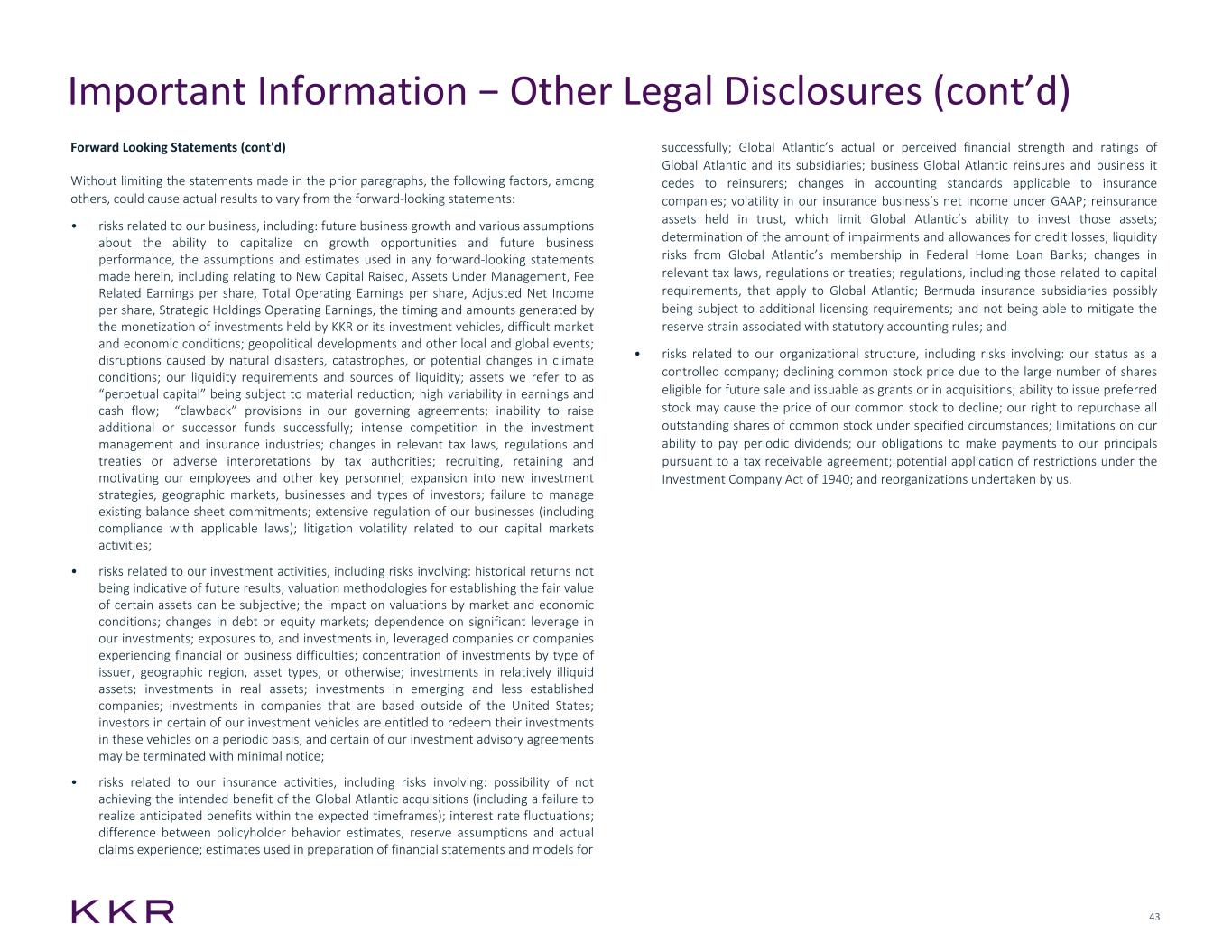 43 successfully; Global Atlantic’s actual or perceived financial strength and ratings of Global Atlantic and its subsidiaries; business Global Atlantic reinsures and business it cedes to reinsurers; changes in accounting standards applicable to insurance companies; volatility in our insurance business’s net income under GAAP; reinsurance assets held in trust, which limit Global Atlantic’s ability to invest those assets; determination of the amount of impairments and allowances for credit losses; liquidity risks from Global Atlantic’s membership in Federal Home Loan Banks; changes in relevant tax laws, regulations or treaties; regulations, including those related to capital requirements, that apply to Global Atlantic; Bermuda insurance subsidiaries possibly being subject to additional licensing requirements; and not being able to mitigate the reserve strain associated with statutory accounting rules; and • risks related to our organizational structure, including risks involving: our status as a controlled company; declining common stock price due to the large number of shares eligible for future sale and issuable as grants or in acquisitions; ability to issue preferred stock may cause the price of our common stock to decline; our right to repurchase all outstanding shares of common stock under specified circumstances; limitations on our ability to pay periodic dividends; our obligations to make payments to our principals pursuant to a tax receivable agreement; potential application of restrictions under the Investment Company Act of 1940; and reorganizations undertaken by us. Forward Looking Statements (cont'd) Without limiting the statements made in the prior paragraphs, the following factors, among others, could cause actual results to vary from the forward-looking statements: • risks related to our business, including: future business growth and various assumptions about the ability to capitalize on growth opportunities and future business performance, the assumptions and estimates used in any forward-looking statements made herein, including relating to New Capital Raised, Assets Under Management, Fee Related Earnings per share, Total Operating Earnings per share, Adjusted Net Income per share, Strategic Holdings Operating Earnings, the timing and amounts generated by the monetization of investments held by KKR or its investment vehicles, difficult market and economic conditions; geopolitical developments and other local and global events; disruptions caused by natural disasters, catastrophes, or potential changes in climate conditions; our liquidity requirements and sources of liquidity; assets we refer to as “perpetual capital” being subject to material reduction; high variability in earnings and cash flow; “clawback” provisions in our governing agreements; inability to raise additional or successor funds successfully; intense competition in the investment management and insurance industries; changes in relevant tax laws, regulations and treaties or adverse interpretations by tax authorities; recruiting, retaining and motivating our employees and other key personnel; expansion into new investment strategies, geographic markets, businesses and types of investors; failure to manage existing balance sheet commitments; extensive regulation of our businesses (including compliance with applicable laws); litigation volatility related to our capital markets activities; • risks related to our investment activities, including risks involving: historical returns not being indicative of future results; valuation methodologies for establishing the fair value of certain assets can be subjective; the impact on valuations by market and economic conditions; changes in debt or equity markets; dependence on significant leverage in our investments; exposures to, and investments in, leveraged companies or companies experiencing financial or business difficulties; concentration of investments by type of issuer, geographic region, asset types, or otherwise; investments in relatively illiquid assets; investments in real assets; investments in emerging and less established companies; investments in companies that are based outside of the United States; investors in certain of our investment vehicles are entitled to redeem their investments in these vehicles on a periodic basis, and certain of our investment advisory agreements may be terminated with minimal notice; • risks related to our insurance activities, including risks involving: possibility of not achieving the intended benefit of the Global Atlantic acquisitions (including a failure to realize anticipated benefits within the expected timeframes); interest rate fluctuations; difference between policyholder behavior estimates, reserve assumptions and actual claims experience; estimates used in preparation of financial statements and models for Important Information − Other Legal Disclosures (cont’d)