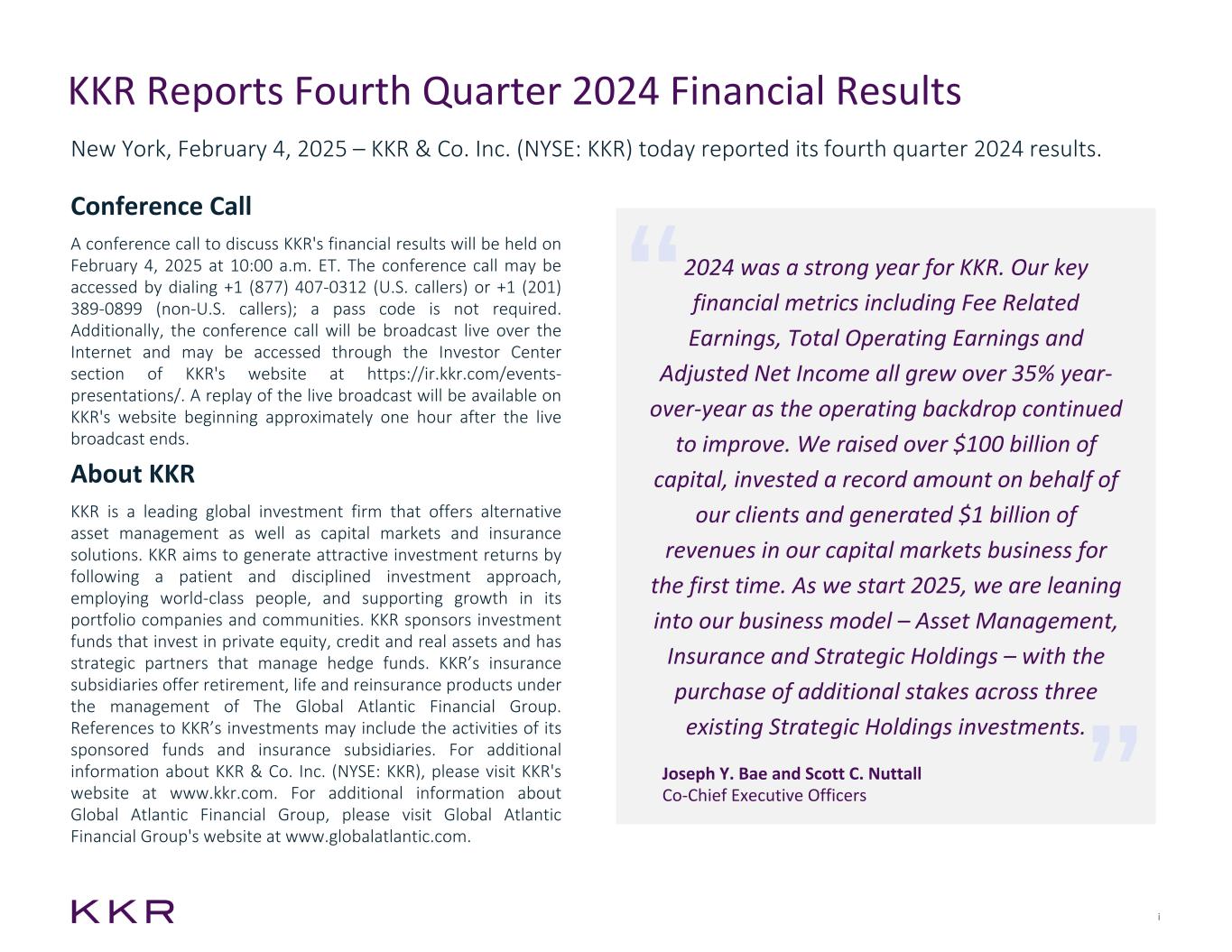 i 2024 was a strong year for KKR. Our key financial metrics including Fee Related Earnings, Total Operating Earnings and Adjusted Net Income all grew over 35% year- over-year as the operating backdrop continued to improve. We raised over $100 billion of capital, invested a record amount on behalf of our clients and generated $1 billion of revenues in our capital markets business for the first time. As we start 2025, we are leaning into our business model – Asset Management, Insurance and Strategic Holdings – with the purchase of additional stakes across three existing Strategic Holdings investments. Conference Call A conference call to discuss KKR's financial results will be held on February 4, 2025 at 10:00 a.m. ET. The conference call may be accessed by dialing +1 (877) 407-0312 (U.S. callers) or +1 (201) 389-0899 (non-U.S. callers); a pass code is not required. Additionally, the conference call will be broadcast live over the Internet and may be accessed through the Investor Center section of KKR's website at https://ir.kkr.com/events- presentations/. A replay of the live broadcast will be available on KKR's website beginning approximately one hour after the live broadcast ends. About KKR KKR is a leading global investment firm that offers alternative asset management as well as capital markets and insurance solutions. KKR aims to generate attractive investment returns by following a patient and disciplined investment approach, employing world-class people, and supporting growth in its portfolio companies and communities. KKR sponsors investment funds that invest in private equity, credit and real assets and has strategic partners that manage hedge funds. KKR’s insurance subsidiaries offer retirement, life and reinsurance products under the management of The Global Atlantic Financial Group. References to KKR’s investments may include the activities of its sponsored funds and insurance subsidiaries. For additional information about KKR & Co. Inc. (NYSE: KKR), please visit KKR's website at www.kkr.com. For additional information about Global Atlantic Financial Group, please visit Global Atlantic Financial Group's website at www.globalatlantic.com. New York, February 4, 2025 – KKR & Co. Inc. (NYSE: KKR) today reported its fourth quarter 2024 results. KKR Reports Fourth Quarter 2024 Financial Results Joseph Y. Bae and Scott C. Nuttall Co-Chief Executive Officers
