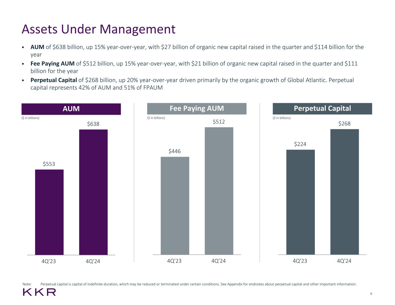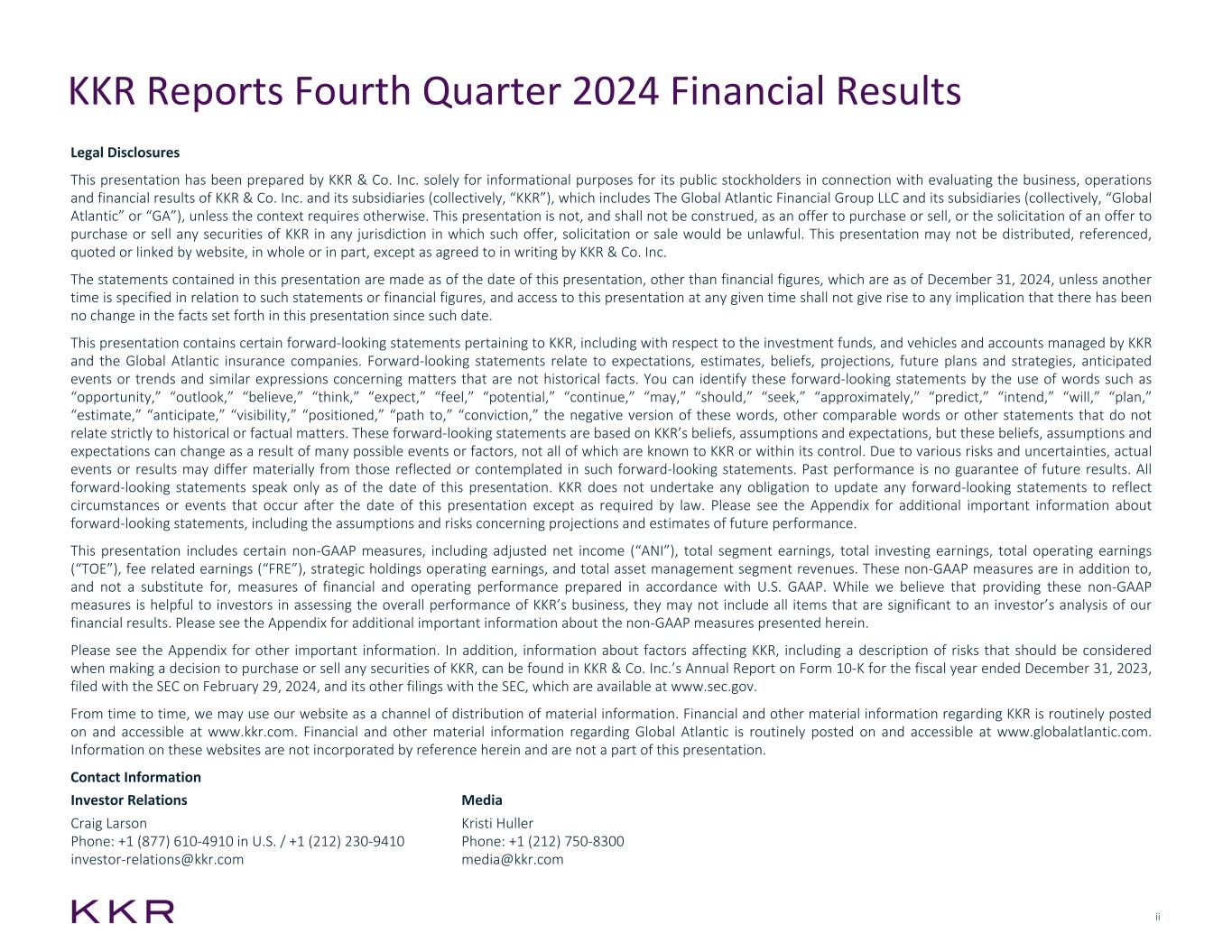 ii KKR Reports Fourth Quarter 2024 Financial Results Investor Relations Craig Larson Phone: +1 (877) 610-4910 in U.S. / +1 (212) 230-9410 investor-relations@kkr.com Media Kristi Huller Phone: +1 (212) 750-8300 media@kkr.com Legal Disclosures This presentation has been prepared by KKR & Co. Inc. solely for informational purposes for its public stockholders in connection with evaluating the business, operations and financial results of KKR & Co. Inc. and its subsidiaries (collectively, “KKR”), which includes The Global Atlantic Financial Group LLC and its subsidiaries (collectively, “Global Atlantic” or “GA”), unless the context requires otherwise. This presentation is not, and shall not be construed, as an offer to purchase or sell, or the solicitation of an offer to purchase or sell any securities of KKR in any jurisdiction in which such offer, solicitation or sale would be unlawful. This presentation may not be distributed, referenced, quoted or linked by website, in whole or in part, except as agreed to in writing by KKR & Co. Inc. The statements contained in this presentation are made as of the date of this presentation, other than financial figures, which are as of December 31, 2024, unless another time is specified in relation to such statements or financial figures, and access to this presentation at any given time shall not give rise to any implication that there has been no change in the facts set forth in this presentation since such date. This presentation contains certain forward-looking statements pertaining to KKR, including with respect to the investment funds, and vehicles and accounts managed by KKR and the Global Atlantic insurance companies. Forward-looking statements relate to expectations, estimates, beliefs, projections, future plans and strategies, anticipated events or trends and similar expressions concerning matters that are not historical facts. You can identify these forward-looking statements by the use of words such as “opportunity,” “outlook,” “believe,” “think,” “expect,” “feel,” “potential,” “continue,” “may,” “should,” “seek,” “approximately,” “predict,” “intend,” “will,” “plan,” “estimate,” “anticipate,” “visibility,” “positioned,” “path to,” “conviction,” the negative version of these words, other comparable words or other statements that do not relate strictly to historical or factual matters. These forward-looking statements are based on KKR’s beliefs, assumptions and expectations, but these beliefs, assumptions and expectations can change as a result of many possible events or factors, not all of which are known to KKR or within its control. Due to various risks and uncertainties, actual events or results may differ materially from those reflected or contemplated in such forward-looking statements. Past performance is no guarantee of future results. All forward-looking statements speak only as of the date of this presentation. KKR does not undertake any obligation to update any forward-looking statements to reflect circumstances or events that occur after the date of this presentation except as required by law. Please see the Appendix for additional important information about forward-looking statements, including the assumptions and risks concerning projections and estimates of future performance. This presentation includes certain non-GAAP measures, including adjusted net income (“ANI”), total segment earnings, total investing earnings, total operating earnings (“TOE”), fee related earnings (“FRE”), strategic holdings operating earnings, and total asset management segment revenues. These non-GAAP measures are in addition to, and not a substitute for, measures of financial and operating performance prepared in accordance with U.S. GAAP. While we believe that providing these non-GAAP measures is helpful to investors in assessing the overall performance of KKR’s business, they may not include all items that are significant to an investor’s analysis of our financial results. Please see the Appendix for additional important information about the non-GAAP measures presented herein. Please see the Appendix for other important information. In addition, information about factors affecting KKR, including a description of risks that should be considered when making a decision to purchase or sell any securities of KKR, can be found in KKR & Co. Inc.’s Annual Report on Form 10-K for the fiscal year ended December 31, 2023, filed with the SEC on February 29, 2024, and its other filings with the SEC, which are available at www.sec.gov. From time to time, we may use our website as a channel of distribution of material information. Financial and other material information regarding KKR is routinely posted on and accessible at www.kkr.com. Financial and other material information regarding Global Atlantic is routinely posted on and accessible at www.globalatlantic.com. Information on these websites are not incorporated by reference herein and are not a part of this presentation. Contact Information