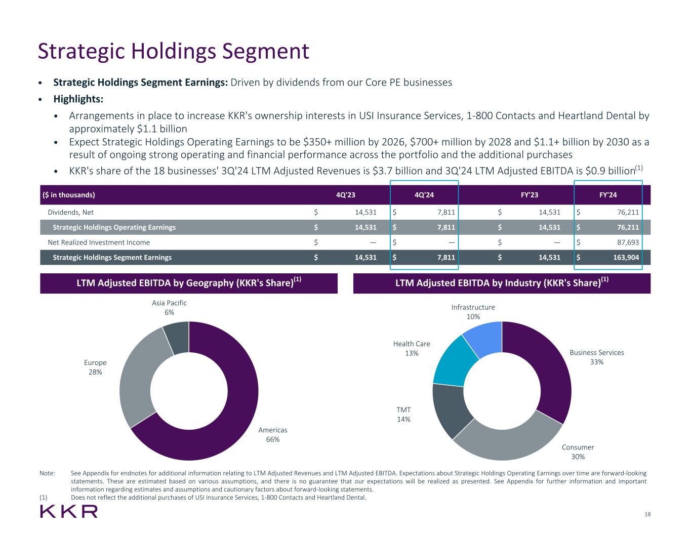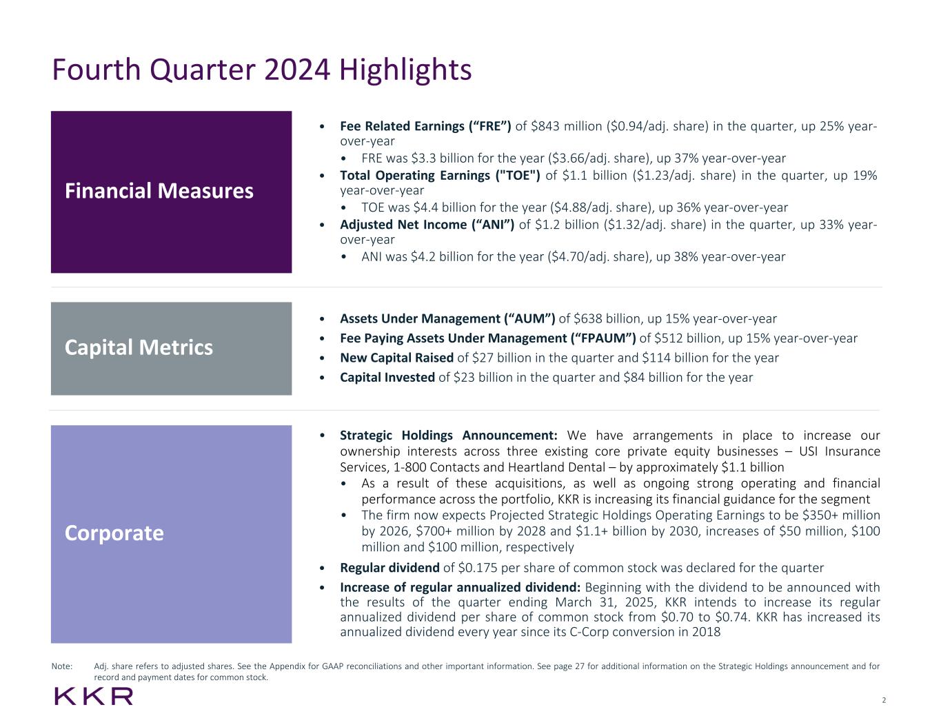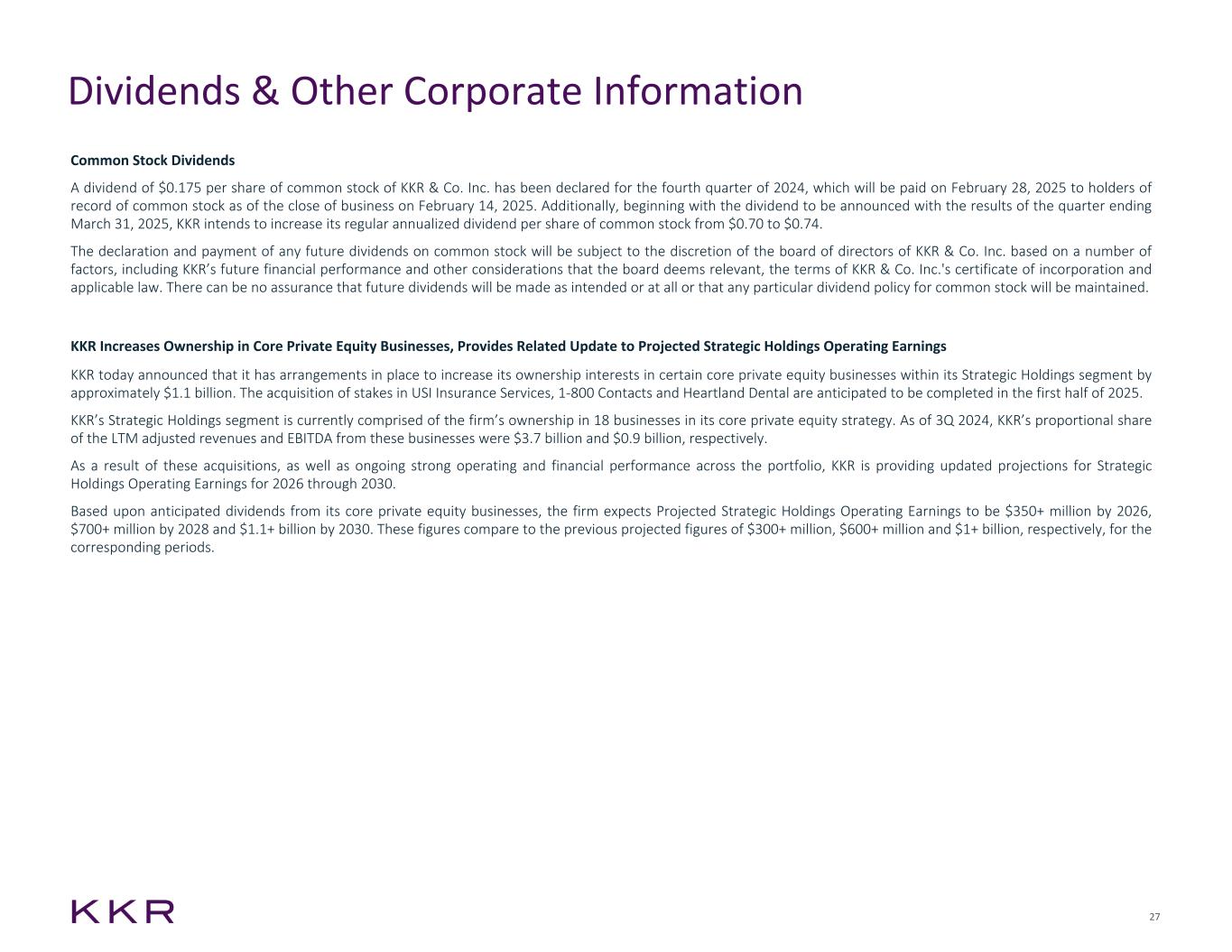 27 Common Stock Dividends A dividend of $0.175 per share of common stock of KKR & Co. Inc. has been declared for the fourth quarter of 2024, which will be paid on February 28, 2025 to holders of record of common stock as of the close of business on February 14, 2025. Additionally, beginning with the dividend to be announced with the results of the quarter ending March 31, 2025, KKR intends to increase its regular annualized dividend per share of common stock from $0.70 to $0.74. The declaration and payment of any future dividends on common stock will be subject to the discretion of the board of directors of KKR & Co. Inc. based on a number of factors, including KKR’s future financial performance and other considerations that the board deems relevant, the terms of KKR & Co. Inc.'s certificate of incorporation and applicable law. There can be no assurance that future dividends will be made as intended or at all or that any particular dividend policy for common stock will be maintained. KKR Increases Ownership in Core Private Equity Businesses, Provides Related Update to Projected Strategic Holdings Operating Earnings KKR today announced that it has arrangements in place to increase its ownership interests in certain core private equity businesses within its Strategic Holdings segment by approximately $1.1 billion. The acquisition of stakes in USI Insurance Services, 1-800 Contacts and Heartland Dental are anticipated to be completed in the first half of 2025. KKR’s Strategic Holdings segment is currently comprised of the firm’s ownership in 18 businesses in its core private equity strategy. As of 3Q 2024, KKR’s proportional share of the LTM adjusted revenues and EBITDA from these businesses were $3.7 billion and $0.9 billion, respectively. As a result of these acquisitions, as well as ongoing strong operating and financial performance across the portfolio, KKR is providing updated projections for Strategic Holdings Operating Earnings for 2026 through 2030. Based upon anticipated dividends from its core private equity businesses, the firm expects Projected Strategic Holdings Operating Earnings to be $350+ million by 2026, $700+ million by 2028 and $1.1+ billion by 2030. These figures compare to the previous projected figures of $300+ million, $600+ million and $1+ billion, respectively, for the corresponding periods. Dividends & Other Corporate Information