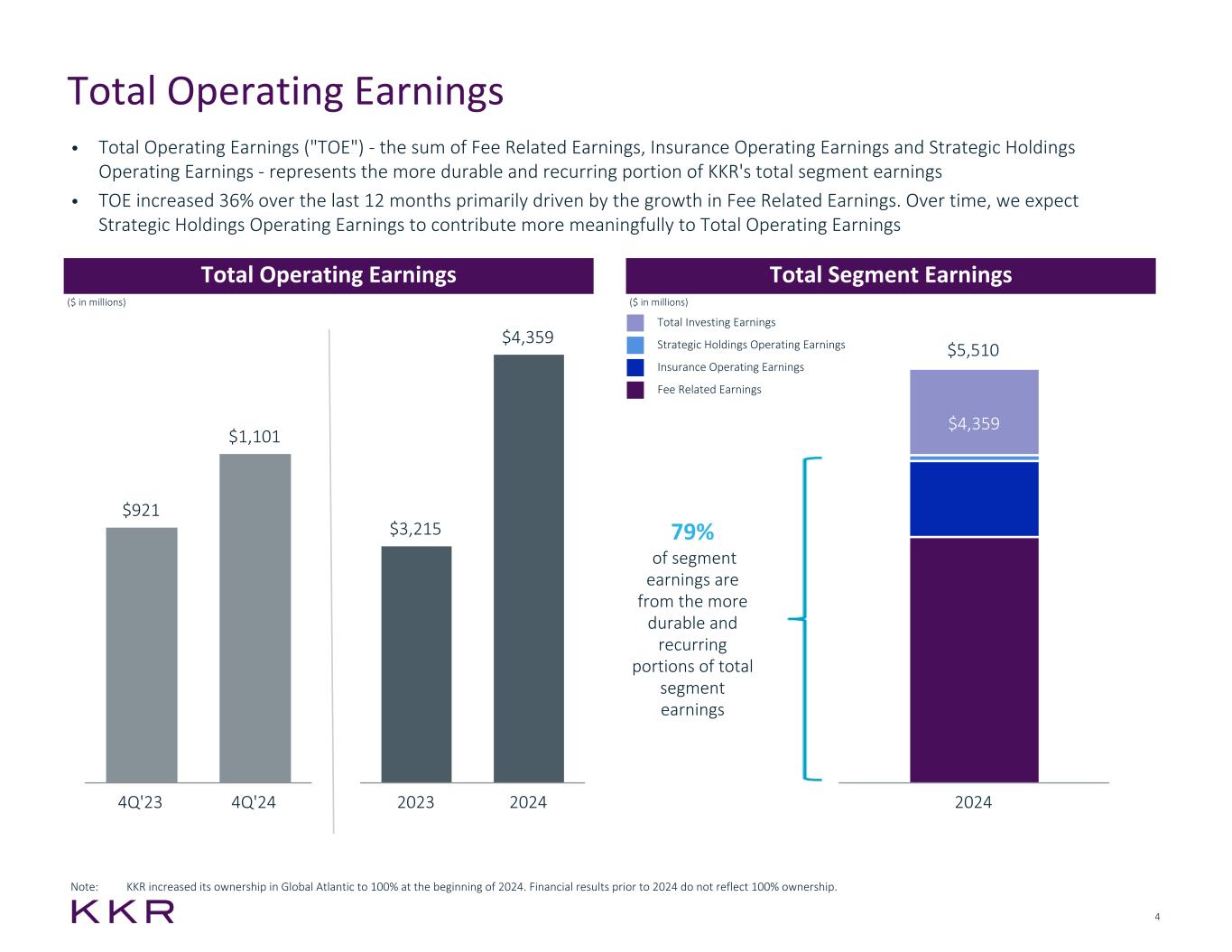3 Fourth Quarter 2024 Segment Earnings Note: See Appendix for GAAP reconciliations, endnotes about taxes affecting Adjusted Net Income and other important information. ($ in thousands, except per share data) 4Q'23 4Q'24 FY'23 FY'24 Management Fees $ 784,581 $ 906,118 $ 3,030,325 $ 3,461,381 Transaction and Monitoring Fees, Net 264,233 323,797 720,654 1,165,884 Fee Related Performance Revenues 23,898 25,091 94,427 137,992 Fee Related Compensation (241,349) (219,624) (865,336) (833,918) Other Operating Expenses (155,989) (192,397) (596,284) (663,543) Fee Related Earnings $ 675,374 $ 842,985 $ 2,383,786 $ 3,267,796 Insurance Operating Earnings $ 231,274 $ 249,973 $ 816,637 $ 1,014,546 Strategic Holdings Operating Earnings $ 14,531 $ 7,811 $ 14,531 $ 76,211 Total Operating Earnings $ 921,179 $ 1,100,769 $ 3,214,954 $ 4,358,553 Net Realized Performance Income 169,861 306,025 398,949 608,788 Net Realized Investment Income 93,434 93,350 541,441 542,163 Total Investing Earnings $ 263,295 $ 399,375 $ 940,390 $ 1,150,951 Total Segment Earnings $ 1,184,474 $ 1,500,144 $ 4,155,344 $ 5,509,504 Interest Expense, Net and Other (81,849) (75,658) (351,869) (318,441) Income Taxes on Adjusted Earnings (214,143) (239,337) (763,382) (988,797) Adjusted Net Income $ 888,482 $ 1,185,149 $ 3,040,093 $ 4,202,266 Adjusted Per Share Measures: FRE per Adjusted Share $ 0.76 $ 0.94 $ 2.68 $ 3.66 TOE per Adjusted Share $ 1.04 $ 1.23 $ 3.61 $ 4.88 ANI per Adjusted Share $ 1.00 $ 1.32 $ 3.42 $ 4.70