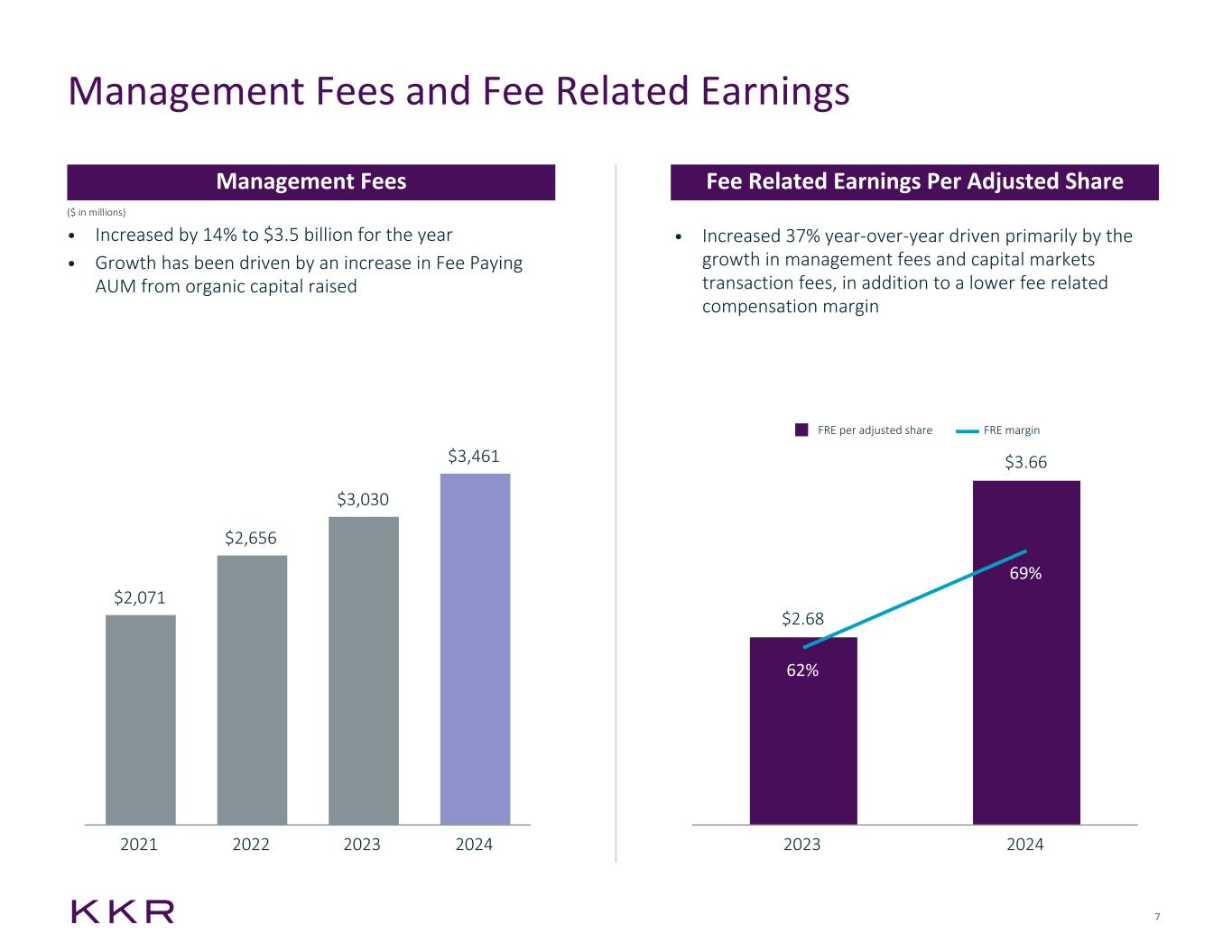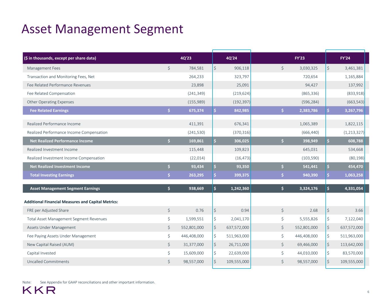 6 Asset Management Segment ($ in thousands, except per share data) 4Q'23 4Q'24 FY'23 FY'24 Management Fees $ 784,581 $ 906,118 $ 3,030,325 $ 3,461,381 Transaction and Monitoring Fees, Net 264,233 323,797 720,654 1,165,884 Fee Related Performance Revenues 23,898 25,091 94,427 137,992 Fee Related Compensation (241,349) (219,624) (865,336) (833,918) Other Operating Expenses (155,989) (192,397) (596,284) (663,543) Fee Related Earnings $ 675,374 $ 842,985 $ 2,383,786 $ 3,267,796 Realized Performance Income 411,391 676,341 1,065,389 1,822,115 Realized Performance Income Compensation (241,530) (370,316) (666,440) (1,213,327) Net Realized Performance Income $ 169,861 $ 306,025 $ 398,949 $ 608,788 Realized Investment Income 115,448 109,823 645,031 534,668 Realized Investment Income Compensation (22,014) (16,473) (103,590) (80,198) Net Realized Investment Income $ 93,434 $ 93,350 $ 541,441 $ 454,470 Total Investing Earnings $ 263,295 $ 399,375 $ 940,390 $ 1,063,258 Asset Management Segment Earnings $ 938,669 $ 1,242,360 $ 3,324,176 $ 4,331,054 Additional Financial Measures and Capital Metrics: FRE per Adjusted Share $ 0.76 $ 0.94 $ 2.68 $ 3.66 Total Asset Management Segment Revenues $ 1,599,551 $ 2,041,170 $ 5,555,826 $ 7,122,040 Assets Under Management $ 552,801,000 $ 637,572,000 $ 552,801,000 $ 637,572,000 Fee Paying Assets Under Management $ 446,408,000 $ 511,963,000 $ 446,408,000 $ 511,963,000 New Capital Raised (AUM) $ 31,377,000 $ 26,711,000 $ 69,466,000 $ 113,642,000 Capital Invested $ 15,609,000 $ 22,639,000 $ 44,010,000 $ 83,570,000 Uncalled Commitments $ 98,557,000 $ 109,555,000 $ 98,557,000 $ 109,555,000 Note: See Appendix for GAAP reconciliations and other important information.