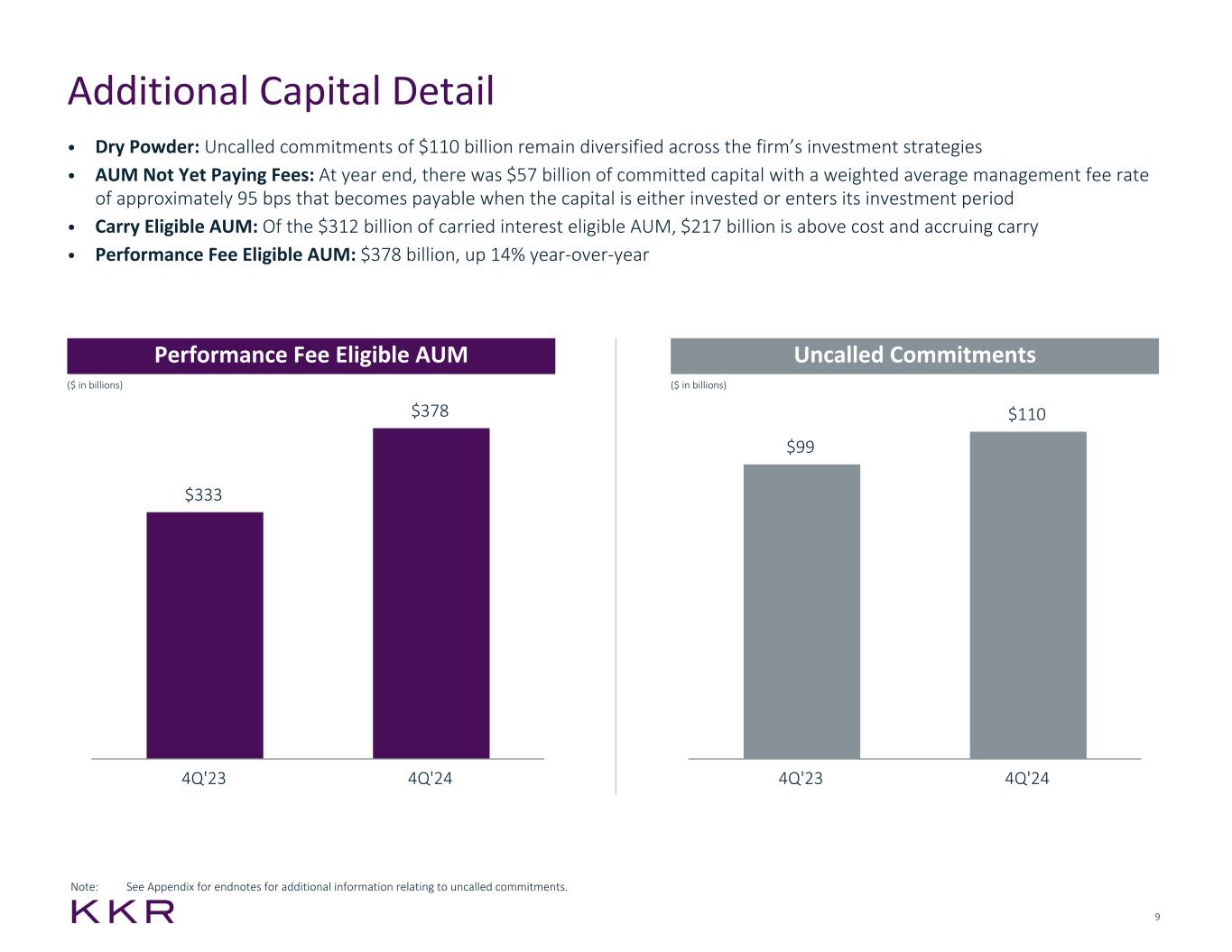 8 Assets Under Management • AUM of $638 billion, up 15% year-over-year, with $27 billion of organic new capital raised in the quarter and $114 billion for the year • Fee Paying AUM of $512 billion, up 15% year-over-year, with $21 billion of organic new capital raised in the quarter and $111 billion for the year • Perpetual Capital of $268 billion, up 20% year-over-year driven primarily by the organic growth of Global Atlantic. Perpetual capital represents 42% of AUM and 51% of FPAUM AUM Fee Paying AUM Perpetual Capital ($ in billions) ($ in billions) ($ in billions) $553 $638 4Q'23 4Q'24 $446 $512 4Q'23 4Q'24 $224 $268 4Q'23 4Q'24 Note: Perpetual capital is capital of indefinite duration, which may be reduced or terminated under certain conditions. See Appendix for endnotes about perpetual capital and other important information.