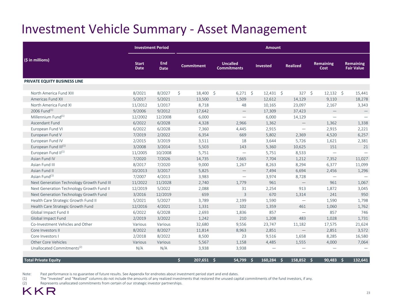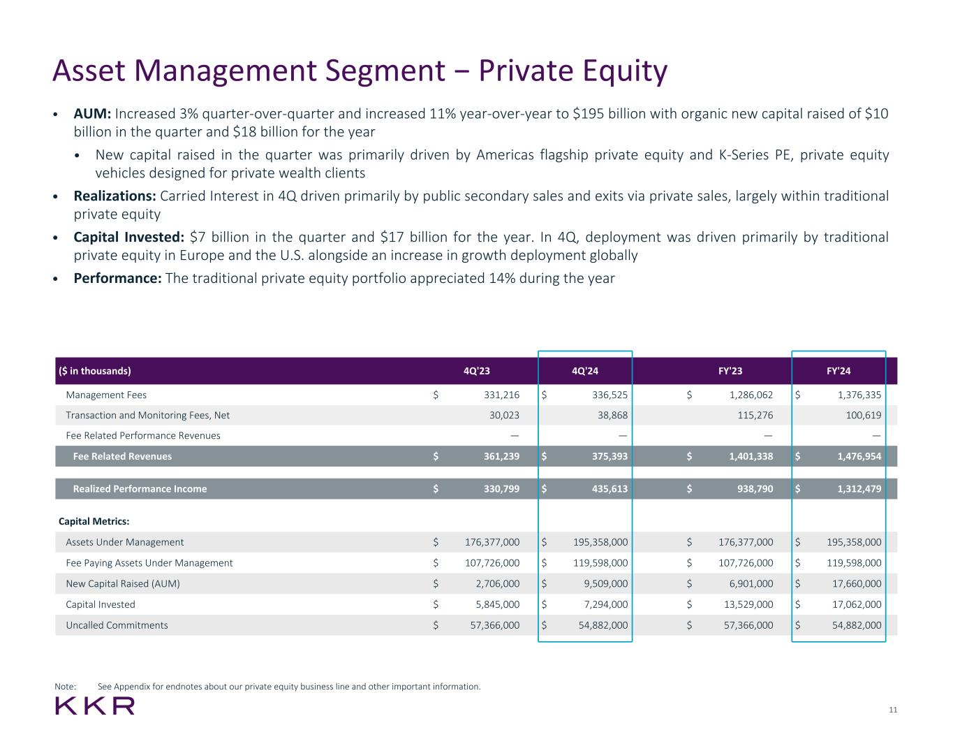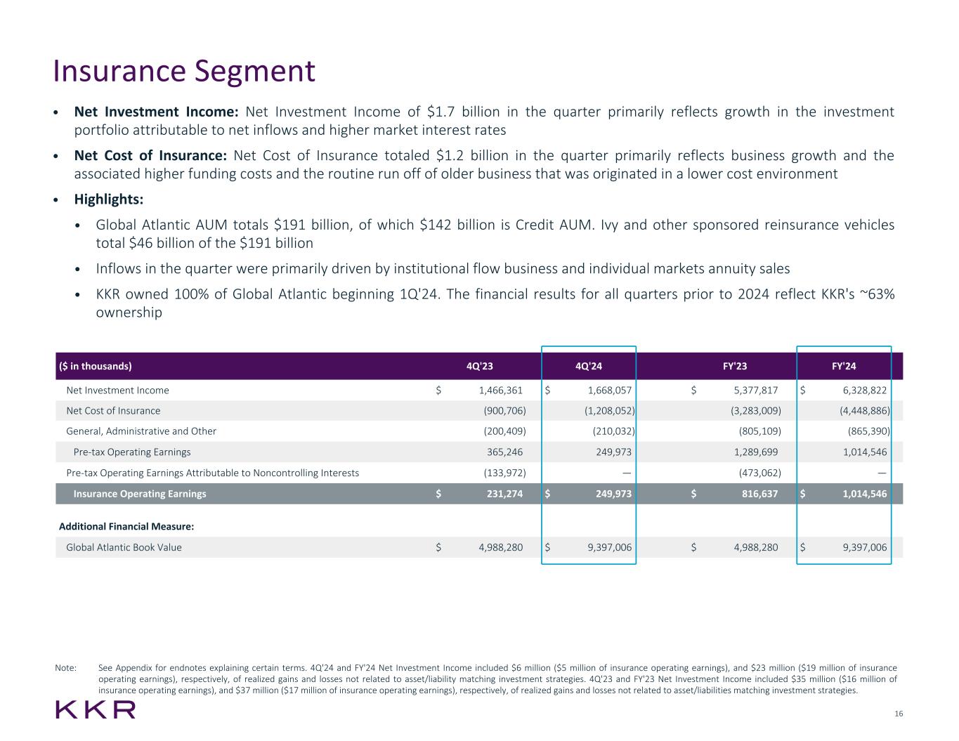 23 Investment Vehicle Summary - Asset Management ($ in thousands) 4Q'21 4Q'22 FY'21 FY'22 Net Investment Income $ 1,352,187 $ 1,230,677 $ 3,329,570 $ 4,112,244 Net Cost of Insurance (490,115) (751,332) (1,566,681) (2,415,996) General, Administrative and Other (162,085) (164,923) (500,410) (637,718) Pre-tax Insurance Operating Earnings 699,987 314,422 1,262,479 1,058,530 Income Taxes (135,947) (45,817) (199,095) (171,744) Net Income Attributable to Noncontrolling Interests (217,263) (103,464) (410,833) (341,582) Insurance Segment Operating Earnings $ 346,777 $ 165,141 $ 652,551 $ 545,204 Additional Financial Measures: Global Atlantic Book Value $ 3,372,498 $ 3,929,710 $ 3,372,498 $ 3,929,710 ($ in millions) Investment Period Amount Start Date End Date Commitment Uncalled Commitments Invested Realized Remaining Cost Remaining Fair Value PRIVATE EQUITY BUSINESS LINE North America Fund XIII 8/2021 8/2027 $ 18,400 $ 6,271 $ 12,431 $ 327 $ 12,132 $ 15,441 Americas Fund XII 5/2017 5/2021 13,500 1,509 12,612 14,129 9,110 18,278 North America Fund XI 11/2012 1/2017 8,718 48 10,165 23,097 2,167 3,343 2006 Fund(1) 9/2006 9/2012 17,642 — 17,309 37,423 — — Millennium Fund(1) 12/2002 12/2008 6,000 — 6,000 14,129 — — Ascendant Fund 6/2022 6/2028 4,328 2,966 1,362 — 1,362 1,338 European Fund VI 6/2022 6/2028 7,360 4,445 2,915 — 2,915 2,221 European Fund V 7/2019 2/2022 6,354 669 5,802 2,369 4,520 6,257 European Fund IV 2/2015 3/2019 3,511 18 3,644 5,726 1,621 2,381 European Fund III(1) 3/2008 3/2014 5,503 143 5,360 10,625 151 21 European Fund II(1) 11/2005 10/2008 5,751 — 5,751 8,533 — — Asian Fund IV 7/2020 7/2026 14,735 7,665 7,704 1,212 7,352 11,027 Asian Fund III 8/2017 7/2020 9,000 1,267 8,263 8,294 6,377 11,099 Asian Fund II 10/2013 3/2017 5,825 — 7,494 6,694 2,456 1,296 Asian Fund(1) 7/2007 4/2013 3,983 — 3,974 8,728 — — Next Generation Technology Growth Fund III 11/2022 11/2028 2,740 1,779 961 — 961 1,067 Next Generation Technology Growth Fund II 12/2019 5/2022 2,088 31 2,254 913 1,872 3,045 Next Generation Technology Growth Fund 3/2016 12/2019 659 3 670 1,314 241 950 Health Care Strategic Growth Fund II 5/2021 5/2027 3,789 2,199 1,590 — 1,590 1,798 Health Care Strategic Growth Fund 12/2016 4/2021 1,331 102 1,359 461 1,060 1,762 Global Impact Fund II 6/2022 6/2028 2,693 1,836 857 — 857 746 Global Impact Fund 2/2019 3/2022 1,242 210 1,208 483 1,028 1,731 Co-Investment Vehicles and Other Various Various 32,680 9,556 23,747 11,182 17,575 21,624 Core Investors II 8/2022 8/2027 11,814 8,963 2,851 — 2,851 3,572 Core Investors I 2/2018 8/2022 8,500 23 9,516 1,658 8,285 16,580 Other Core Vehicles Various Various 5,567 1,158 4,485 1,555 4,000 7,064 Unallocated Commitments(2) N/A N/A 3,938 3,938 — — — — Total Private Equity $ 207,651 $ 54,799 $ 160,284 $ 158,852 $ 90,483 $ 132,641 Note: Past performance is no guarantee of future results. See Appendix for endnotes about investment period start and end dates. (1) The “Invested" and “Realized” columns do not include the amounts of any realized investments that restored the unused capital commitments of the fund investors, if any. (2) Represents unallocated commitments from certain of our strategic investor partnerships.