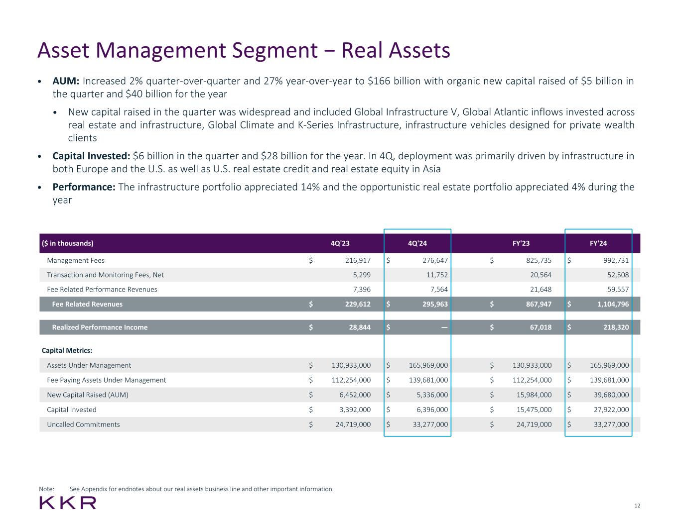 11 • AUM: Increased 3% quarter-over-quarter and increased 11% year-over-year to $195 billion with organic new capital raised of $10 billion in the quarter and $18 billion for the year • New capital raised in the quarter was primarily driven by Americas flagship private equity and K-Series PE, private equity vehicles designed for private wealth clients • Realizations: Carried Interest in 4Q driven primarily by public secondary sales and exits via private sales, largely within traditional private equity • Capital Invested: $7 billion in the quarter and $17 billion for the year. In 4Q, deployment was driven primarily by traditional private equity in Europe and the U.S. alongside an increase in growth deployment globally • Performance: The traditional private equity portfolio appreciated 14% during the year Asset Management Segment − Private Equity ($ in thousands) 4Q'23 4Q'24 FY'23 FY'24 Management Fees $ 331,216 $ 336,525 $ 1,286,062 $ 1,376,335 Transaction and Monitoring Fees, Net 30,023 38,868 115,276 100,619 Fee Related Performance Revenues — — — — Fee Related Revenues $ 361,239 $ 375,393 $ 1,401,338 $ 1,476,954 Realized Performance Income $ 330,799 $ 435,613 $ 938,790 $ 1,312,479 Capital Metrics: Assets Under Management $ 176,377,000 $ 195,358,000 $ 176,377,000 $ 195,358,000 Fee Paying Assets Under Management $ 107,726,000 $ 119,598,000 $ 107,726,000 $ 119,598,000 New Capital Raised (AUM) $ 2,706,000 $ 9,509,000 $ 6,901,000 $ 17,660,000 Capital Invested $ 5,845,000 $ 7,294,000 $ 13,529,000 $ 17,062,000 Uncalled Commitments $ 57,366,000 $ 54,882,000 $ 57,366,000 $ 54,882,000 Note: See Appendix for endnotes about our private equity business line and other important information.