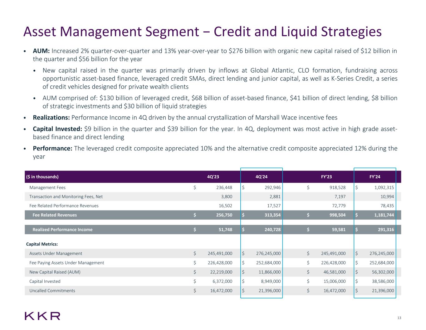12 Asset Management Segment − Real Assets • AUM: Increased 2% quarter-over-quarter and 27% year-over-year to $166 billion with organic new capital raised of $5 billion in the quarter and $40 billion for the year • New capital raised in the quarter was widespread and included Global Infrastructure V, Global Atlantic inflows invested across real estate and infrastructure, Global Climate and K-Series Infrastructure, infrastructure vehicles designed for private wealth clients • Capital Invested: $6 billion in the quarter and $28 billion for the year. In 4Q, deployment was primarily driven by infrastructure in both Europe and the U.S. as well as U.S. real estate credit and real estate equity in Asia • Performance: The infrastructure portfolio appreciated 14% and the opportunistic real estate portfolio appreciated 4% during the year ($ in thousands) 4Q'23 4Q'24 FY'23 FY'24 Management Fees $ 216,917 $ 276,647 $ 825,735 $ 992,731 Transaction and Monitoring Fees, Net 5,299 11,752 20,564 52,508 Fee Related Performance Revenues 7,396 7,564 21,648 59,557 Fee Related Revenues $ 229,612 $ 295,963 $ 867,947 $ 1,104,796 Realized Performance Income $ 28,844 $ — $ 67,018 $ 218,320 Capital Metrics: Assets Under Management $ 130,933,000 $ 165,969,000 $ 130,933,000 $ 165,969,000 Fee Paying Assets Under Management $ 112,254,000 $ 139,681,000 $ 112,254,000 $ 139,681,000 New Capital Raised (AUM) $ 6,452,000 $ 5,336,000 $ 15,984,000 $ 39,680,000 Capital Invested $ 3,392,000 $ 6,396,000 $ 15,475,000 $ 27,922,000 Uncalled Commitments $ 24,719,000 $ 33,277,000 $ 24,719,000 $ 33,277,000 Note: See Appendix for endnotes about our real assets business line and other important information.