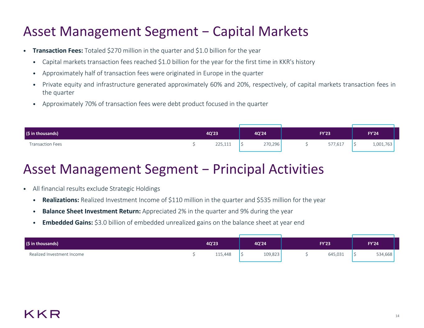 13 • AUM: Increased 2% quarter-over-quarter and 13% year-over-year to $276 billion with organic new capital raised of $12 billion in the quarter and $56 billion for the year • New capital raised in the quarter was primarily driven by inflows at Global Atlantic, CLO formation, fundraising across opportunistic asset-based finance, leveraged credit SMAs, direct lending and junior capital, as well as K-Series Credit, a series of credit vehicles designed for private wealth clients • AUM comprised of: $130 billion of leveraged credit, $68 billion of asset-based finance, $41 billion of direct lending, $8 billion of strategic investments and $30 billion of liquid strategies • Realizations: Performance Income in 4Q driven by the annual crystallization of Marshall Wace incentive fees • Capital Invested: $9 billion in the quarter and $39 billion for the year. In 4Q, deployment was most active in high grade asset- based finance and direct lending • Performance: The leveraged credit composite appreciated 10% and the alternative credit composite appreciated 12% during the year ($ in thousands) 4Q'23 4Q'24 FY'23 FY'24 Management Fees $ 236,448 $ 292,946 $ 918,528 $ 1,092,315 Transaction and Monitoring Fees, Net 3,800 2,881 7,197 10,994 Fee Related Performance Revenues 16,502 17,527 72,779 78,435 Fee Related Revenues $ 256,750 $ 313,354 $ 998,504 $ 1,181,744 Realized Performance Income $ 51,748 $ 240,728 $ 59,581 $ 291,316 Capital Metrics: Assets Under Management $ 245,491,000 $ 276,245,000 $ 245,491,000 $ 276,245,000 Fee Paying Assets Under Management $ 226,428,000 $ 252,684,000 $ 226,428,000 $ 252,684,000 New Capital Raised (AUM) $ 22,219,000 $ 11,866,000 $ 46,581,000 $ 56,302,000 Capital Invested $ 6,372,000 $ 8,949,000 $ 15,006,000 $ 38,586,000 Uncalled Commitments $ 16,472,000 $ 21,396,000 $ 16,472,000 $ 21,396,000 Asset Management Segment − Credit and Liquid Strategies