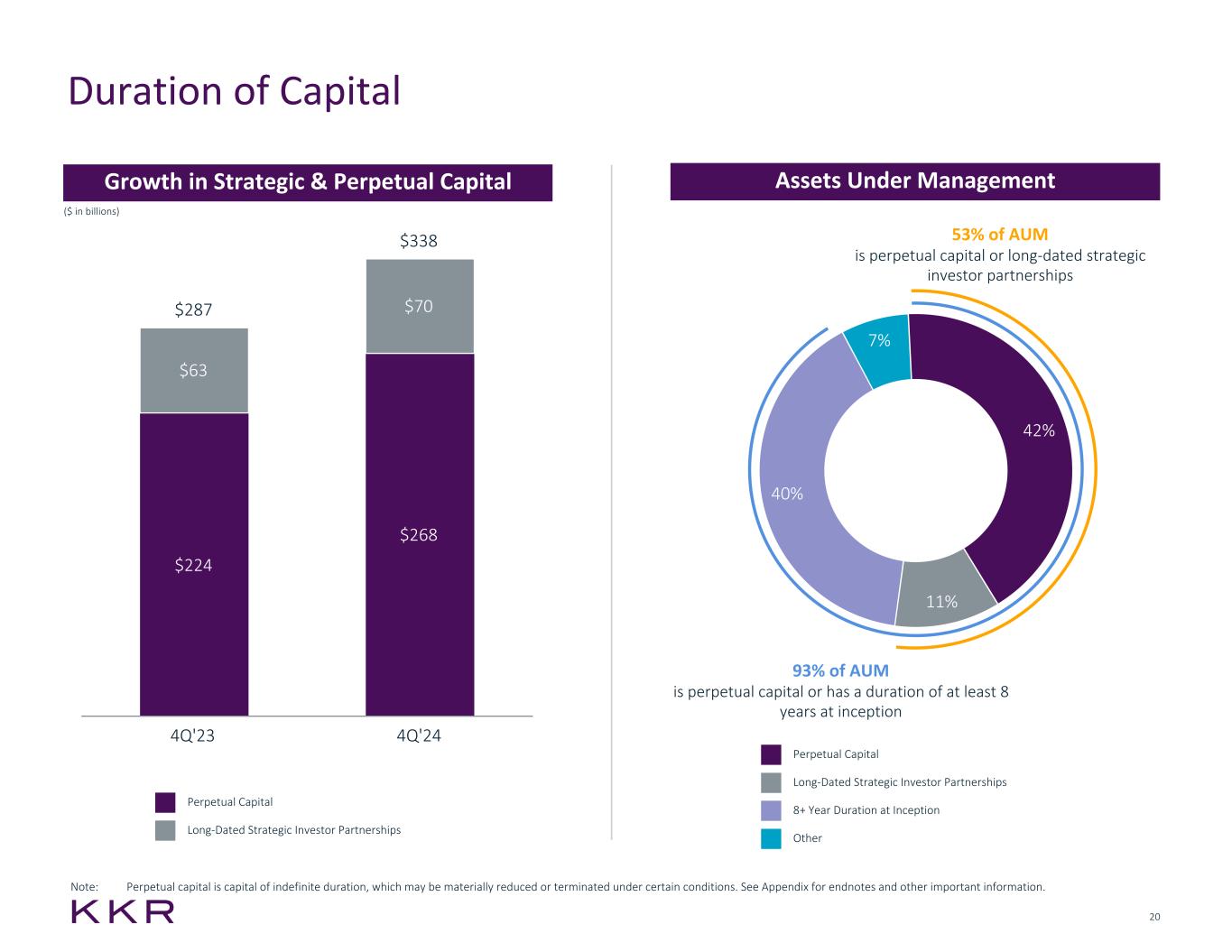 36 Notes to Page 18 – Strategic Holdings Segment • The adjusted revenue and adjusted EBITDA information represents the measures management currently uses to monitor the operating performance of the businesses. • The Capital Invested for Strategic Holdings segment is included in Private Equity Capital Invested within the Asset Management segment and relates to Core Private Equity. • LTM Adjusted EBITDA is shown based on the geographic location of the businesses' headquarters. • LTM Adjusted revenue and EBITDA represents KKR’s look-through ownership percentage for each of these companies in the aggregate as a result of the firm's investments in these companies through its participation in our core private equity strategy multiplied by the revenue and EBITDA of each portfolio company, respectively. Non-U.S. dollar businesses have been converted at the period-ending foreign exchange rate. The calculation reflects the underlying revenue or EBITDA growth of investments made in the preceding periods, assuming those businesses were owned for the full acquisition year and are shown on a constant currency / constant ownership percentage basis. We believe this is helpful to the investor to show a steady state growth profile of the underlying portfolio on an organic basis. • A reconciliation of the forecasts for certain non-GAAP measures, including Strategic Holdings Operating Earnings to their corresponding GAAP measures has not been provided due to the unreasonable efforts it would take to provide such a reconciliation. Notes to Page 20 – Duration of Capital • Please see endnote for page 8 for information about the term "perpetual capital." • "Other" in the chart primarily includes hedge fund partnerships and certain leveraged credit funds. Notes to Page 21 – Assets Under Management Rollforward • For the three months ended December 31, 2024, Distributions and Other includes $5 million of redemptions by fund investors in Private Equity, $66 million of redemptions by fund investors in Real Assets and $1,594 million of redemptions by fund investors in Credit and Liquid Strategies. • For the year ended December 31, 2024, Distributions and Other includes $13 million of redemptions by fund investors in Private Equity, $323 million of redemptions by fund investors in Real Assets and $7,638 million of redemptions by fund investors in Credit and Liquid Strategies. Important Information − Endnotes (cont’d) Notes to Page 22 – Fee Paying Assets Under Management Rollforward • For the three months ended December 31, 2024, Distributions and Other includes $5 million of redemptions by fund investors in Private Equity, $66 million of redemptions by fund investors in Real Assets and $1,594 million of redemptions by fund investors in Credit and Liquid Strategies. • For the year ended December 31, 2024, Distributions and Other includes net changes in fee base of certain Real Assets funds of $2,806 million, $13 million of redemptions by fund investors in Private Equity, $323 million of redemptions by fund investors in Real Assets, and $7,638 million of redemptions by fund investors in Credit and Liquid Strategies. Notes to Pages 23 to 25 – Investment Vehicle Summary • The start date represents the start of the fund's investment period as defined in the fund's governing documents and may or may not be the same as the date upon which management fees begin to accrue. • The end date represents the end of the fund's investment period as defined in the fund's governing documents and is generally not the date upon which management fees cease to accrue. For funds that initially charge management fees on the basis of committed capital, the end date is generally the date on or after which the management fees begin to be calculated instead on the basis of invested capital and may, for certain funds, begin to be calculated using a lower rate. • This table includes investment vehicles which are not investment funds. The terms investments and investment vehicles are terms used solely for purposes of financial presentation. Note to Page 26 – Strong Financial Profile • The Investment amounts do not include KKR's ownership of the Global Atlantic insurance companies through KKR's insurance segment or KKR's participation in the core private equity strategy through KKR's Strategic Holdings segment. • The term “investments” has been presented solely for purposes of demonstrating the financial performance of certain assets contained on KKR’s balance sheet, including majority ownership of subsidiaries that operate KKR’s asset management, insurance businesses, broker-dealer and other businesses, including the general partner interests of KKR’s investment funds. • Traditional private equity includes KKR's traditional private equity funds, co-investments alongside such KKR sponsored private equity funds, and other opportunistic investments. Equity investments in other asset classes, such as growth equity, energy, real estate, infrastructure, leveraged credit and alternative credit appear in these other asset classes.