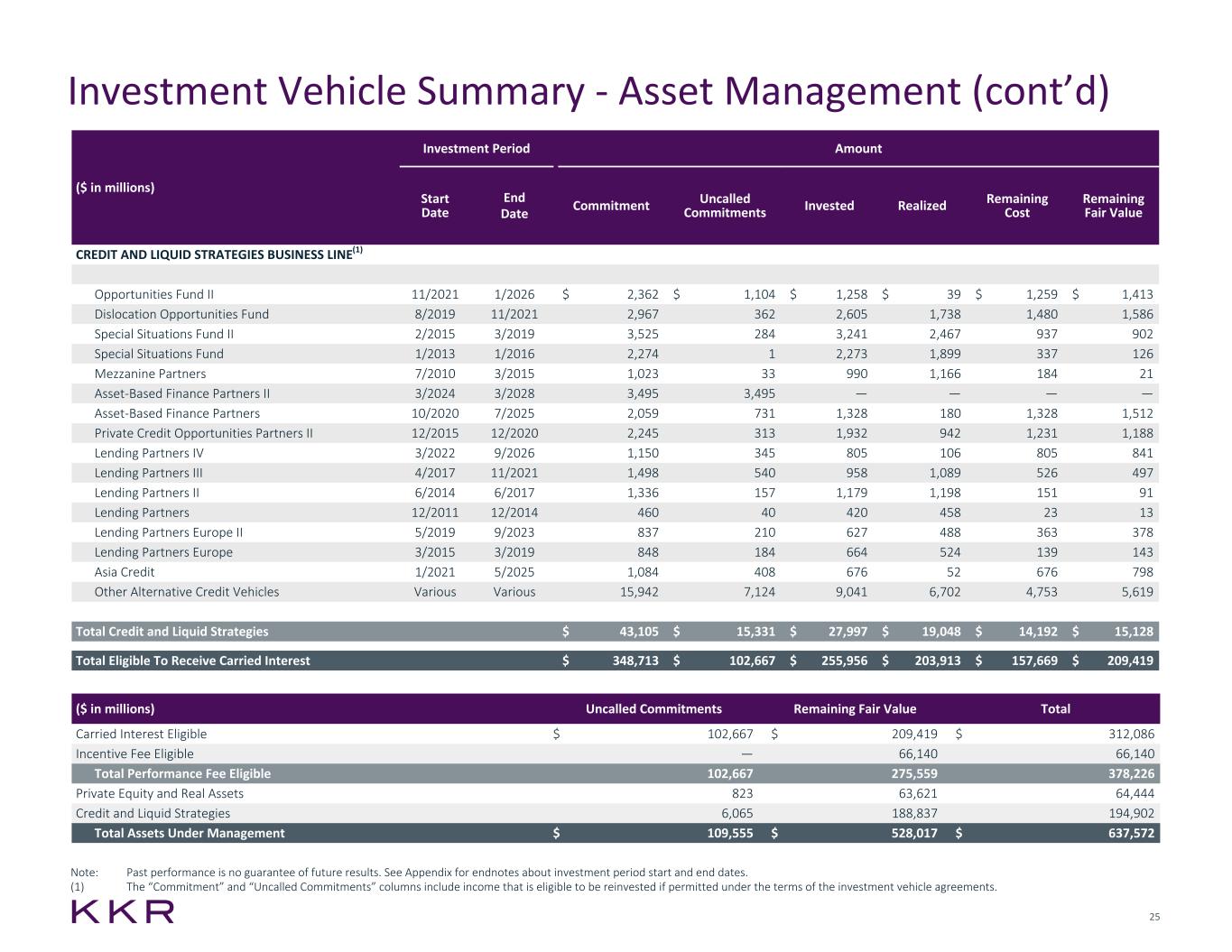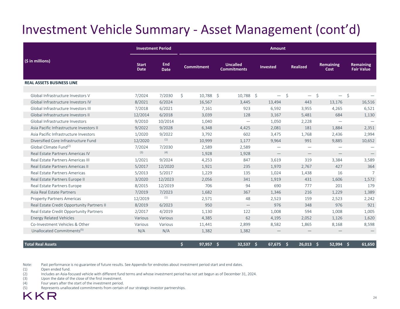 24 Note: Past performance is no guarantee of future results. See Appendix for endnotes about investment period start and end dates. (1) Open ended fund. (2) Includes an Asia-focused vehicle with different fund terms and whose investment period has not yet begun as of December 31, 2024. (3) Upon the date of the close of the first investment. (4) Four years after the start of the investment period. (5) Represents unallocated commitments from certain of our strategic investor partnerships. Investment Vehicle Summary - Asset Management (cont’d) ($ in millions) Investment Period Amount Start Date End Date Commitment Uncalled Commitments Invested Realized Remaining Cost Remaining Fair Value REAL ASSETS BUSINESS LINE Global Infrastructure Investors V 7/2024 7/2030 $ 10,788 $ 10,788 $ — $ — $ — $ — Global Infrastructure Investors IV 8/2021 6/2024 16,567 3,445 13,494 443 13,176 16,516 Global Infrastructure Investors III 7/2018 6/2021 7,161 923 6,592 3,955 4,265 6,521 Global Infrastructure Investors II 12/2014 6/2018 3,039 128 3,167 5,481 684 1,130 Global Infrastructure Investors 9/2010 10/2014 1,040 — 1,050 2,228 — — Asia Pacific Infrastructure Investors II 9/2022 9/2028 6,348 4,425 2,081 181 1,884 2,351 Asia Pacific Infrastructure Investors 1/2020 9/2022 3,792 602 3,475 1,768 2,436 2,994 Diversified Core Infrastructure Fund 12/2020 (1) 10,999 1,177 9,964 991 9,885 10,652 Global Climate Fund(2) 7/2024 7/2030 2,589 2,589 — — — — Real Estate Partners Americas IV (3) (4) 1,928 1,928 — — — — Real Estate Partners Americas III 1/2021 9/2024 4,253 847 3,619 319 3,384 3,589 Real Estate Partners Americas II 5/2017 12/2020 1,921 235 1,970 2,767 427 364 Real Estate Partners Americas 5/2013 5/2017 1,229 135 1,024 1,438 16 7 Real Estate Partners Europe II 3/2020 12/2023 2,056 341 1,919 431 1,606 1,572 Real Estate Partners Europe 8/2015 12/2019 706 94 690 777 201 179 Asia Real Estate Partners 7/2019 7/2023 1,682 367 1,346 216 1,229 1,389 Property Partners Americas 12/2019 (1) 2,571 48 2,523 159 2,523 2,242 Real Estate Credit Opportunity Partners II 8/2019 6/2023 950 — 976 348 976 921 Real Estate Credit Opportunity Partners 2/2017 4/2019 1,130 122 1,008 594 1,008 1,005 Energy Related Vehicles Various Various 4,385 62 4,195 2,052 1,126 1,620 Co-Investment Vehicles & Other Various Various 11,441 2,899 8,582 1,865 8,168 8,598 Unallocated Commitments(5) N/A N/A 1,382 1,382 — — — — Total Real Assets $ 97,957 $ 32,537 $ 67,675 $ 26,013 $ 52,994 $ 61,650