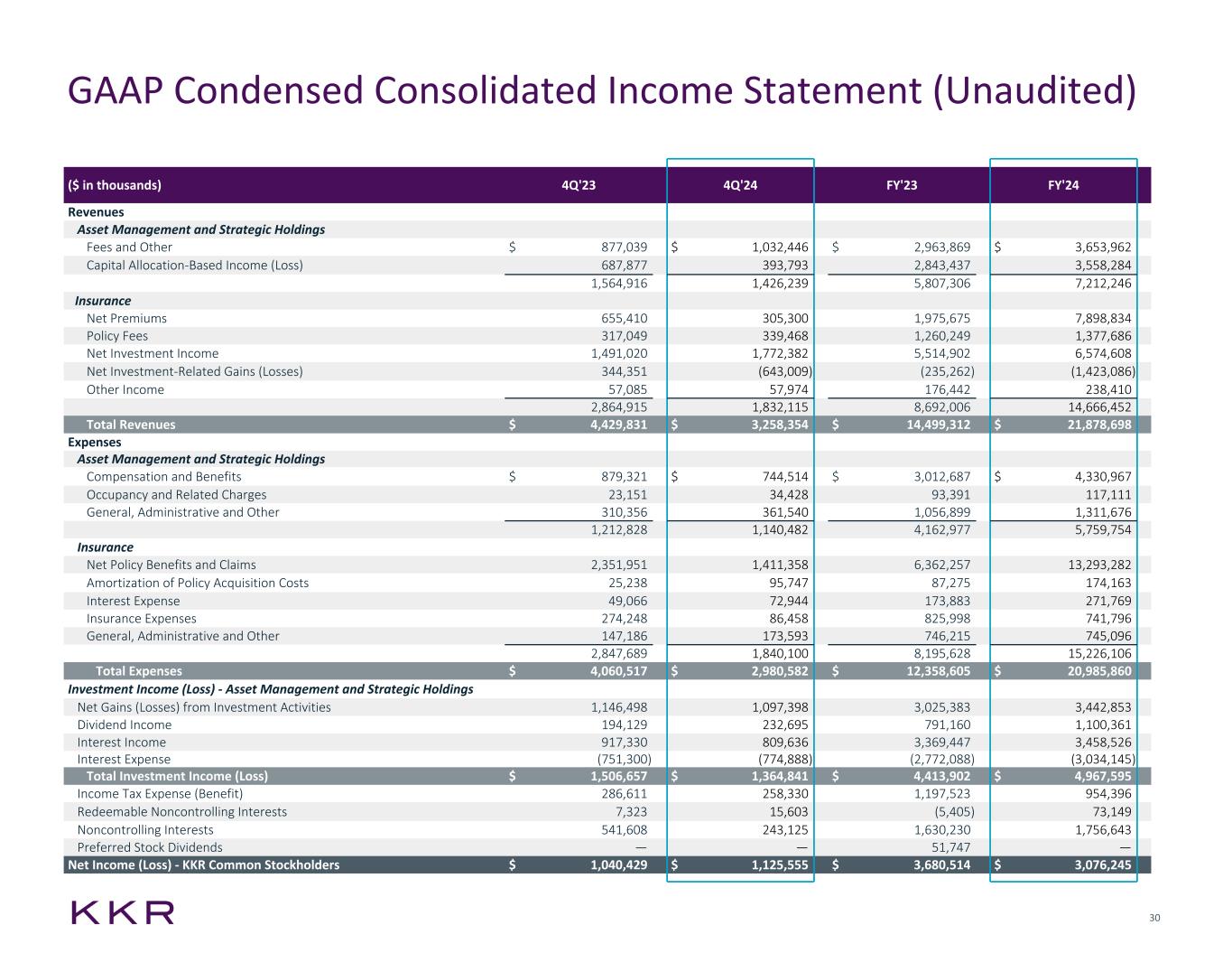 1 Fourth Quarter 2024 GAAP Results (Unaudited) GAAP Net Income Attributable to KKR & Co. Inc. Common Stockholders was $3.1 billion for the full year 2024 ($ in thousands, except per share data) 4Q'23 4Q'24 FY'23 FY'24 Revenues Asset Management and Strategic Holdings $ 1,564,916 $ 1,426,239 $ 5,807,306 $ 7,212,246 Insurance 2,864,915 1,832,115 8,692,006 14,666,452 Total Revenues $ 4,429,831 $ 3,258,354 $ 14,499,312 $ 21,878,698 Expenses Asset Management and Strategic Holdings $ 1,212,828 $ 1,140,482 $ 4,162,977 $ 5,759,754 Insurance 2,847,689 1,840,100 8,195,628 15,226,106 Total Expenses $ 4,060,517 $ 2,980,582 $ 12,358,605 $ 20,985,860 Total Investment Income (Loss) - Asset Management and Strategic Holdings $ 1,506,657 $ 1,364,841 $ 4,413,902 $ 4,967,595 Income Tax Expense (Benefit) 286,611 258,330 1,197,523 954,396 Redeemable Noncontrolling Interests 7,323 15,603 (5,405) 73,149 Noncontrolling Interests 541,608 243,125 1,630,230 1,756,643 Preferred Stock Dividends — — 51,747 — Net Income (Loss) - KKR Common Stockholders $ 1,040,429 $ 1,125,555 $ 3,680,514 $ 3,076,245 Net Income (Loss) Attributable to KKR & Co. Inc. Per Share of Common Stock Basic $ 1.18 $ 1.27 $ 4.24 $ 3.47 Diluted $ 1.14 $ 1.18 $ 4.09 $ 3.28 Weighted Average Shares of Common Stock Outstanding Basic 884,998,900 888,222,552 867,496,813 887,021,433 Diluted 912,002,464 956,267,561 911,787,433 938,904,600 Note: See Appendix for detailed GAAP income statement. Totals may not sum due to rounding in this presentation.