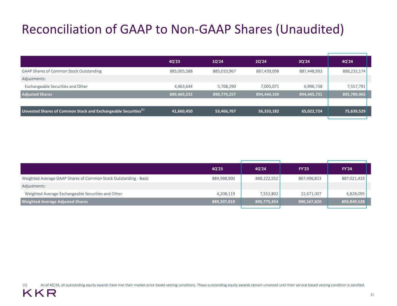 28 Stock Summary From December 31, 2023 through January 31, 2025, KKR used a total of $125 million to retire equity awards representing 1.2 million shares that otherwise would have been issued to participants under KKR's equity incentive plan. During this period, retirements were made at an average cost of $106.92 per share. Common Stock Repurchase Activity (Amounts in millions, except per share amounts) Inception to Date(1) Open Market Share Repurchases 67.3 Reduction of Shares for Retired Equity Awards(2) 25.8 Total Repurchased Shares and Retired Equity Awards 93.1 Total Capital Used $2,636 Average Price Paid Per Share $28.32 Remaining Availability under Share Repurchase Plan $69 Adjusted Shares 4Q'23 4Q'24 Common Stock Outstanding 885,005,588 888,232,174 Exchangeable Securities(3) 4,463,644 7,557,791 Adjusted Shares(4) 889,469,232 895,789,965 (1) KKR & Co. Inc.'s initial repurchase authorization was announced on October 27, 2015. Information is through January 31, 2025. (2) Refers to the retirement of equity awards issued pursuant to KKR & Co. Inc.’s equity incentive plans. (3) Includes certain securities exchangeable into shares of common stock of KKR & Co. Inc. (4) Excludes unvested shares granted under the equity incentive plan.
