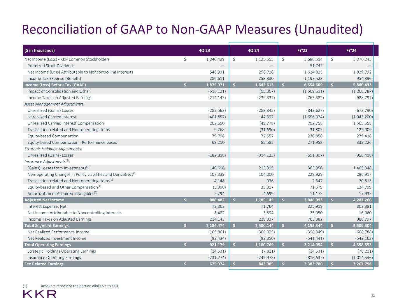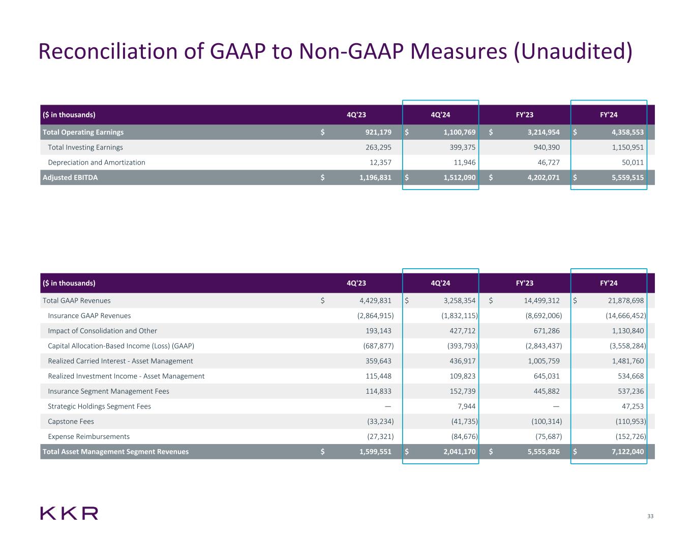 32 Reconciliation of GAAP to Non-GAAP Measures (Unaudited) (1) Amounts represent the portion allocable to KKR. ($ in thousands) 4Q'23 4Q'24 FY'23 FY'24 Net Income (Loss) - KKR Common Stockholders $ 1,040,429 $ 1,125,555 $ 3,680,514 $ 3,076,245 Preferred Stock Dividends — — 51,747 — Net Income (Loss) Attributable to Noncontrolling Interests 548,931 258,728 1,624,825 1,829,792 Income Tax Expense (Benefit) 286,611 258,330 1,197,523 954,396 Income (Loss) Before Tax (GAAP) $ 1,875,971 $ 1,642,613 $ 6,554,609 $ 5,860,433 Impact of Consolidation and Other (516,121) (95,067) (1,569,591) (1,268,787) Income Taxes on Adjusted Earnings (214,143) (239,337) (763,382) (988,797) Asset Management Adjustments: Unrealized (Gains) Losses (282,563) (288,342) (843,627) (673,790) Unrealized Carried Interest (401,857) 44,397 (1,656,974) (1,943,200) Unrealized Carried Interest Compensation 202,650 (49,778) 792,758 1,505,558 Transaction-related and Non-operating Items 9,768 (31,690) 31,805 122,009 Equity-based Compensation 79,798 72,557 230,858 279,418 Equity-based Compensation - Performance based 68,210 85,582 271,958 332,226 Strategic Holdings Adjustments: Unrealized (Gains) Losses (182,818) (314,133) (691,307) (958,418) Insurance Adjustments(1): (Gains) Losses from Investments(1) 140,696 213,395 363,956 1,465,348 Non-operating Changes in Policy Liabilities and Derivatives(1) 107,339 104,000 228,929 296,917 Transaction-related and Non-operating Items(1) 4,148 936 7,347 20,615 Equity-based and Other Compensation(1) (5,390) 35,317 71,579 134,799 Amortization of Acquired Intangibles(1) 2,794 4,699 11,175 17,935 Adjusted Net Income $ 888,482 $ 1,185,149 $ 3,040,093 $ 4,202,266 Interest Expense, Net 73,362 71,764 325,919 302,381 Net Income Attributable to Noncontrolling Interests 8,487 3,894 25,950 16,060 Income Taxes on Adjusted Earnings 214,143 239,337 763,382 988,797 Total Segment Earnings $ 1,184,474 $ 1,500,144 $ 4,155,344 $ 5,509,504 Net Realized Performance Income (169,861) (306,025) (398,949) (608,788) Net Realized Investment Income (93,434) (93,350) (541,441) (542,163) Total Operating Earnings $ 921,179 $ 1,100,769 $ 3,214,954 $ 4,358,553 Strategic Holdings Operating Earnings (14,531) (7,811) (14,531) (76,211) Insurance Operating Earnings (231,274) (249,973) (816,637) (1,014,546) Fee Related Earnings $ 675,374 $ 842,985 $ 2,383,786 $ 3,267,796
