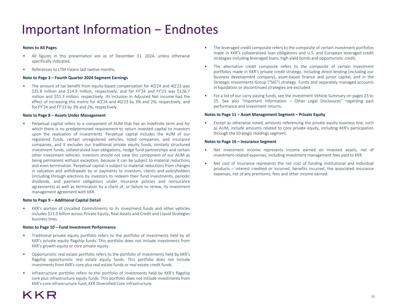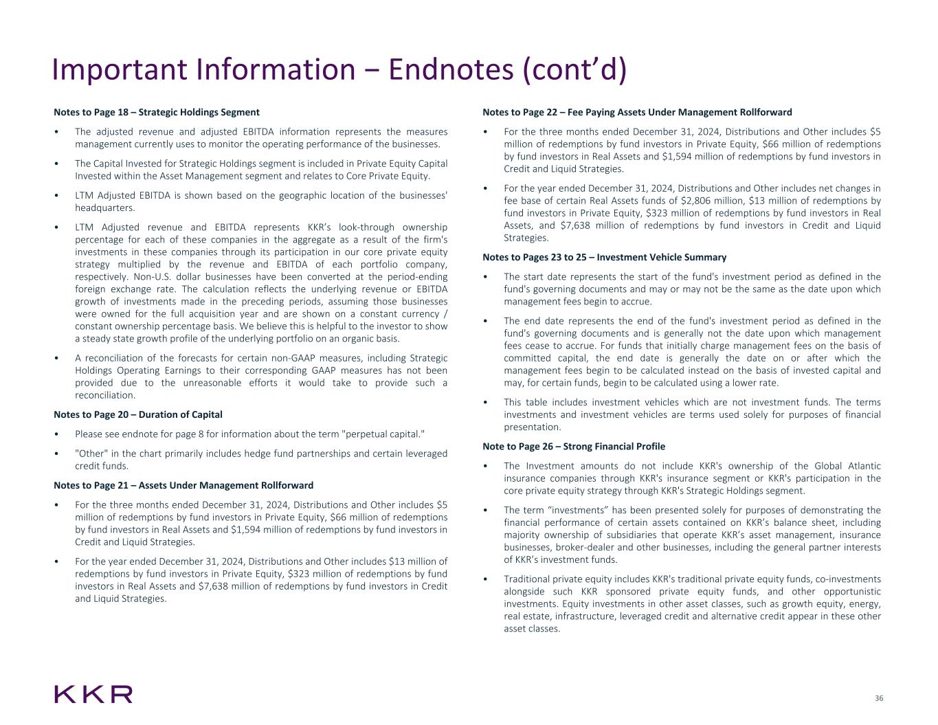 35 • The leveraged credit composite refers to the composite of certain investment portfolios made in KKR’s collateralized loan obligations and U.S. and European leveraged credit strategies including leveraged loans, high-yield bonds and opportunistic credit. • The alternative credit composite refers to the composite of certain investment portfolios made in KKR's private credit strategy, including direct lending (including our business development company), asset-based finance and junior capital, and in the Strategic Investments Group ("SIG") strategy. Funds and separately managed accounts in liquidation or discontinued strategies are excluded. • For a list of our carry paying funds, see the Investment Vehicle Summary on pages 23 to 25. See also “Important Information – Other Legal Disclosures” regarding past performance and investment returns. Notes to Page 11 – Asset Management Segment – Private Equity • Except as otherwise noted, amounts referencing the private equity business line, such as AUM, include amounts related to core private equity, including KKR's participation through the Strategic Holdings segment. Notes to Page 16 – Insurance Segment • Net investment income represents income earned on invested assets, net of investment-related expenses, including investment management fees paid to KKR. • Net cost of insurance represents the net cost of funding institutional and individual products – interest credited or incurred, benefits incurred, the associated insurance expenses, net of any premiums, fees and other income earned. Notes to All Pages • All figures in this presentation are as of December 31, 2024, unless otherwise specifically indicated. • References to LTM means last twelve months. Note to Page 3 – Fourth Quarter 2024 Segment Earnings • The amount of tax benefit from equity-based compensation for 4Q'24 and 4Q'23 was $35.8 million and $14.9 million, respectively, and for FY'24 and FY'23 was $126.7 million and $51.3 million, respectively. Its inclusion in Adjusted Net Income had the effect of increasing this metric for 4Q'24 and 4Q'23 by 3% and 2%, respectively, and for FY'24 and FY'23 by 3% and 2%, respectively. Note to Page 8 – Assets Under Management • Perpetual capital refers to a component of AUM that has an indefinite term and for which there is no predetermined requirement to return invested capital to investors upon the realization of investments. Perpetual capital includes the AUM of our registered funds, certain unregistered vehicles, listed companies, and insurance companies, and it excludes our traditional private equity funds, similarly structured investment funds, collateralized loan obligations, hedge fund partnerships and certain other investment vehicles. Investors should not view this component of our AUM as being permanent without exception, because it can be subject to material reductions and even termination. Perpetual capital is subject to material reductions from changes in valuation and withdrawals by or payments to investors, clients and policyholders (including through elections by investors to redeem their fund investments, periodic dividends, and payment obligations under insurance policies and reinsurance agreements) as well as termination by a client of, or failure to renew, its investment management agreement with KKR. Note to Page 9 – Additional Capital Detail • KKR’s portion of Uncalled Commitments to its investment funds and other vehicles includes $11.0 billion across Private Equity, Real Assets and Credit and Liquid Strategies business lines. Notes to Page 10 – Fund Investment Performance • Traditional private equity portfolio refers to the portfolio of investments held by all KKR’s private equity flagship funds. This portfolio does not include investments from KKR’s growth equity or core private equity. • Opportunistic real estate portfolio refers to the portfolio of investments held by KKR’s flagship opportunistic real estate equity funds. This portfolio does not include investments from KKR's core plus real estate funds or real estate credit funds. • Infrastructure portfolio refers to the portfolio of investments held by KKR’s flagship core plus infrastructure equity funds. This portfolio does not include investments from KKR’s core infrastructure fund, KKR Diversified Core Infrastructure. Important Information − Endnotes