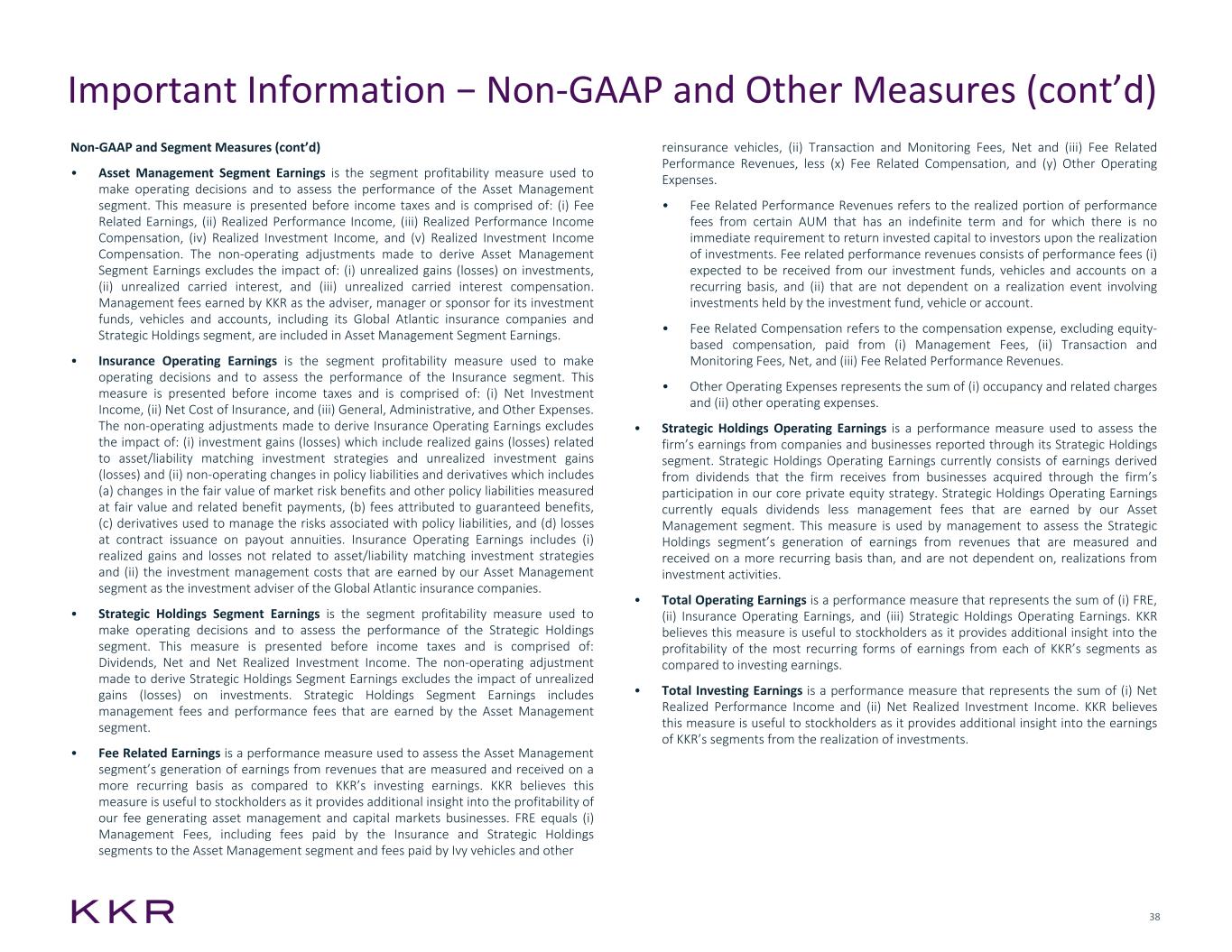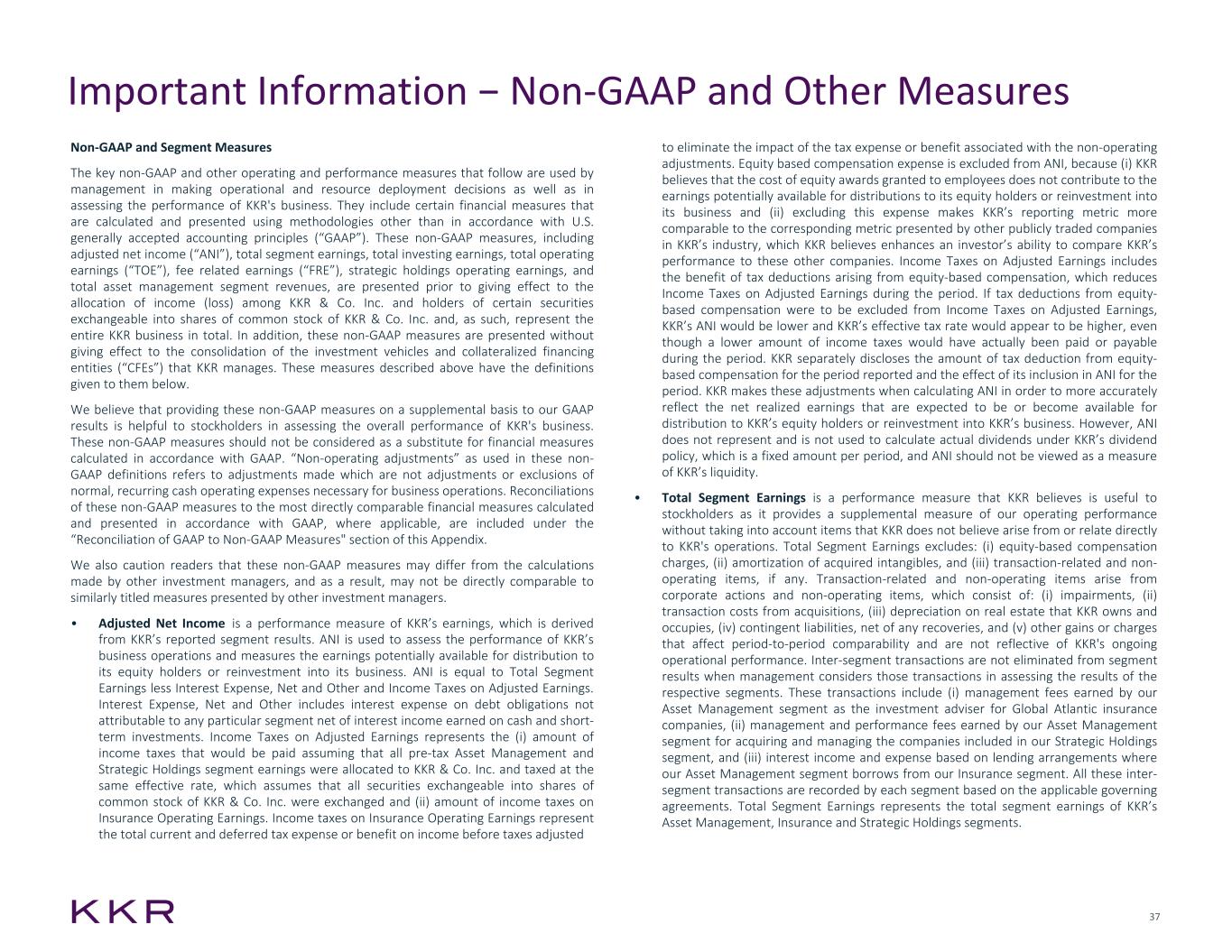 37 Important Information − Non-GAAP and Other Measures to eliminate the impact of the tax expense or benefit associated with the non-operating adjustments. Equity based compensation expense is excluded from ANI, because (i) KKR believes that the cost of equity awards granted to employees does not contribute to the earnings potentially available for distributions to its equity holders or reinvestment into its business and (ii) excluding this expense makes KKR’s reporting metric more comparable to the corresponding metric presented by other publicly traded companies in KKR’s industry, which KKR believes enhances an investor’s ability to compare KKR’s performance to these other companies. Income Taxes on Adjusted Earnings includes the benefit of tax deductions arising from equity-based compensation, which reduces Income Taxes on Adjusted Earnings during the period. If tax deductions from equity- based compensation were to be excluded from Income Taxes on Adjusted Earnings, KKR’s ANI would be lower and KKR’s effective tax rate would appear to be higher, even though a lower amount of income taxes would have actually been paid or payable during the period. KKR separately discloses the amount of tax deduction from equity- based compensation for the period reported and the effect of its inclusion in ANI for the period. KKR makes these adjustments when calculating ANI in order to more accurately reflect the net realized earnings that are expected to be or become available for distribution to KKR’s equity holders or reinvestment into KKR’s business. However, ANI does not represent and is not used to calculate actual dividends under KKR’s dividend policy, which is a fixed amount per period, and ANI should not be viewed as a measure of KKR’s liquidity. • Total Segment Earnings is a performance measure that KKR believes is useful to stockholders as it provides a supplemental measure of our operating performance without taking into account items that KKR does not believe arise from or relate directly to KKR's operations. Total Segment Earnings excludes: (i) equity-based compensation charges, (ii) amortization of acquired intangibles, and (iii) transaction-related and non- operating items, if any. Transaction-related and non-operating items arise from corporate actions and non-operating items, which consist of: (i) impairments, (ii) transaction costs from acquisitions, (iii) depreciation on real estate that KKR owns and occupies, (iv) contingent liabilities, net of any recoveries, and (v) other gains or charges that affect period-to-period comparability and are not reflective of KKR's ongoing operational performance. Inter-segment transactions are not eliminated from segment results when management considers those transactions in assessing the results of the respective segments. These transactions include (i) management fees earned by our Asset Management segment as the investment adviser for Global Atlantic insurance companies, (ii) management and performance fees earned by our Asset Management segment for acquiring and managing the companies included in our Strategic Holdings segment, and (iii) interest income and expense based on lending arrangements where our Asset Management segment borrows from our Insurance segment. All these inter- segment transactions are recorded by each segment based on the applicable governing agreements. Total Segment Earnings represents the total segment earnings of KKR’s Asset Management, Insurance and Strategic Holdings segments. Non-GAAP and Segment Measures The key non-GAAP and other operating and performance measures that follow are used by management in making operational and resource deployment decisions as well as in assessing the performance of KKR's business. They include certain financial measures that are calculated and presented using methodologies other than in accordance with U.S. generally accepted accounting principles (“GAAP”). These non-GAAP measures, including adjusted net income (“ANI”), total segment earnings, total investing earnings, total operating earnings (“TOE”), fee related earnings (“FRE”), strategic holdings operating earnings, and total asset management segment revenues, are presented prior to giving effect to the allocation of income (loss) among KKR & Co. Inc. and holders of certain securities exchangeable into shares of common stock of KKR & Co. Inc. and, as such, represent the entire KKR business in total. In addition, these non-GAAP measures are presented without giving effect to the consolidation of the investment vehicles and collateralized financing entities (“CFEs”) that KKR manages. These measures described above have the definitions given to them below. We believe that providing these non-GAAP measures on a supplemental basis to our GAAP results is helpful to stockholders in assessing the overall performance of KKR's business. These non-GAAP measures should not be considered as a substitute for financial measures calculated in accordance with GAAP. “Non-operating adjustments” as used in these non- GAAP definitions refers to adjustments made which are not adjustments or exclusions of normal, recurring cash operating expenses necessary for business operations. Reconciliations of these non-GAAP measures to the most directly comparable financial measures calculated and presented in accordance with GAAP, where applicable, are included under the “Reconciliation of GAAP to Non-GAAP Measures" section of this Appendix. We also caution readers that these non-GAAP measures may differ from the calculations made by other investment managers, and as a result, may not be directly comparable to similarly titled measures presented by other investment managers. • Adjusted Net Income is a performance measure of KKR’s earnings, which is derived from KKR’s reported segment results. ANI is used to assess the performance of KKR’s business operations and measures the earnings potentially availa