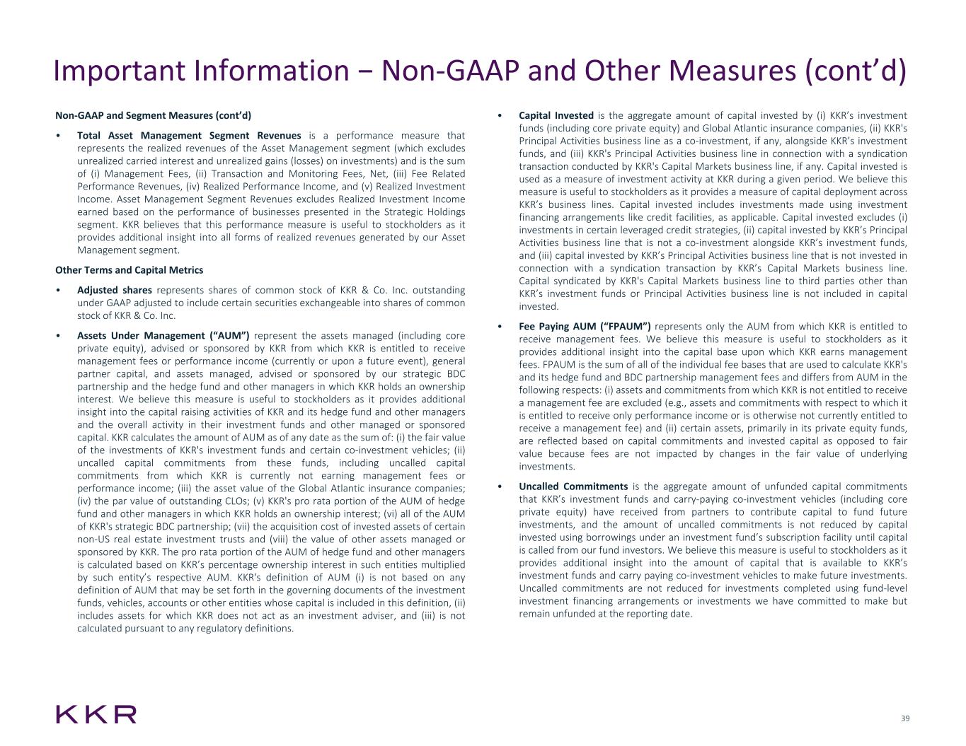 38 Non-GAAP and Segment Measures (cont’d) • Asset Management Segment Earnings is the segment profitability measure used to make operating decisions and to assess the performance of the Asset Management segment. This measure is presented before income taxes and is comprised of: (i) Fee Related Earnings, (ii) Realized Performance Income, (iii) Realized Performance Income Compensation, (iv) Realized Investment Income, and (v) Realized Investment Income Compensation. The non-operating adjustments made to derive Asset Management Segment Earnings excludes the impact of: (i) unrealized gains (losses) on investments, (ii) unrealized carried interest, and (iii) unrealized carried interest compensation. Management fees earned by KKR as the adviser, manager or sponsor for its investment funds, vehicles and accounts, including its Global Atlantic insurance companies and Strategic Holdings segment, are included in Asset Management Segment Earnings. • Insurance Operating Earnings is the segment profitability measure used to make operating decisions and to assess the performance of the Insurance segment. This measure is presented before income taxes and is comprised of: (i) Net Investment Income, (ii) Net Cost of Insurance, and (iii) General, Administrative, and Other Expenses. The non-operating adjustments made to derive Insurance Operating Earnings excludes the impact of: (i) investment gains (losses) which include realized gains (losses) related to asset/liability matching investment strategies and unrealized investment gains (losses) and (ii) non-operating changes in policy liabilities and derivatives which includes (a) changes in the fair value of market risk benefits and other policy liabilities measured at fair value and related benefit payments, (b) fees attributed to guaranteed benefits, (c) derivatives used to manage the risks associated with policy liabilities, and (d) losses at contract issuance on payout annuities. Insurance Operating Earnings includes (i) realized gains and losses not related to asset/liability matching investment strategies and (ii) the investment management costs that are earned by our Asset Management segment as the investment adviser of the Global Atlantic insurance companies. • Strategic Holdings Segment Earnings is the segment profitability measure used to make operating decisions and to assess the performance of the Strategic Holdings segment. This measure is presented before income taxes and is comprised of: Dividends, Net and Net Realized Investment Income. The non-operating adjustment made to derive Strategic Holdings Segment Earnings excludes the impact of unrealized gains (losses) on investments. Strategic Holdings Segment Earnings includes management fees and performance fees that are earned by the Asset Management segment. • Fee Related Earnings is a performance measure used to assess the Asset Management segment’s generation of earnings from revenues that are measured and received on a more recurring basis as compared to KKR’s investing earnings. KKR believes this measure is useful to stockholders as it provides additional insight into the profitability of our fee generating asset management and capital markets businesses. FRE equals (i) Management Fees, including fees paid by the Insurance and Strategic Holdings segments to the Asset Management segment and fees paid by Ivy vehicles and other Important Information − Non-GAAP and Other Measures (cont’d) reinsurance vehicles, (ii) Transaction and Monitoring Fees, Net and (iii) Fee Related Performance Revenues, less (x) Fee Related Compensation, and (y) Other Operating Expenses. • Fee Related Performance Revenues refers to the realized portion of performance fees from certain AUM that has an indefinite term and for which there is no immediate requirement to return invested capital to investors upon the realization of investments. Fee related performance revenues consists of performance fees (i) expected to be received from our investment funds, vehicles and accounts on a recurring basis, and (ii) that are not dependent on a realization event involving investments held by the investment fund, vehicle or account. • Fee Related Compensation refers to the compensation expense, excluding equity- based compensation, paid from (i) Management Fees, (ii) Transaction and Monitoring Fees, Net, and (iii) Fee Related Performance Revenues. • Other Operating Expenses represents the sum of (i) occupancy and related charges and (ii) other operating expenses. • Strategic Holdings Operating Earnings is a performance measure used to assess the firm’s earnings from companies and businesses reported through its Strategic Holdings segment. Strategic Holdings Operating Earnings currently consists of earnings derived from dividends that the firm receives from businesses acquired through the firm’s participation in our core private equity strategy. Strategic Holdings Operating Earnings currently equals dividends less management fees that are earned by our Asset Management segment. This measure is used by management to assess the Strategic Holdings segment’s generation of earnings from revenues that are measured and received on a more recurring basis than, and are not dependent on, realizations from investment activities. • Total Operating Earnings is a performance measure that represents the sum of (i) FRE, (ii) Insurance Operating Earnings, and (iii) Strategic Holdings Operating Earnings. KKR believes this measure is useful to stockholders as it provides additional insight into the profitability of the most recurring forms of earnings from each of KKR’s segments as compared to investing earnings. • Total Investing Earnings is a performance measure that represents the sum of (i) Net Realized Performance Income and (ii) Net Realized Investment Income. KKR believes this measure is useful to stockholders as it provides additional insight into the earnings of KKR’s segments from the realization of in