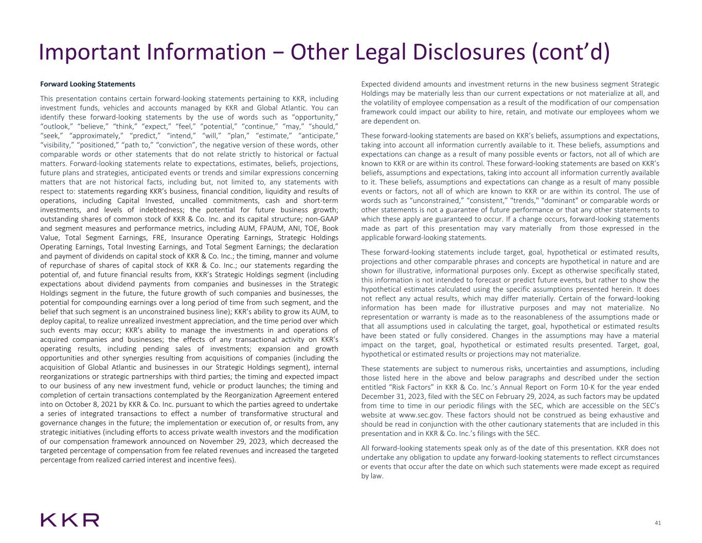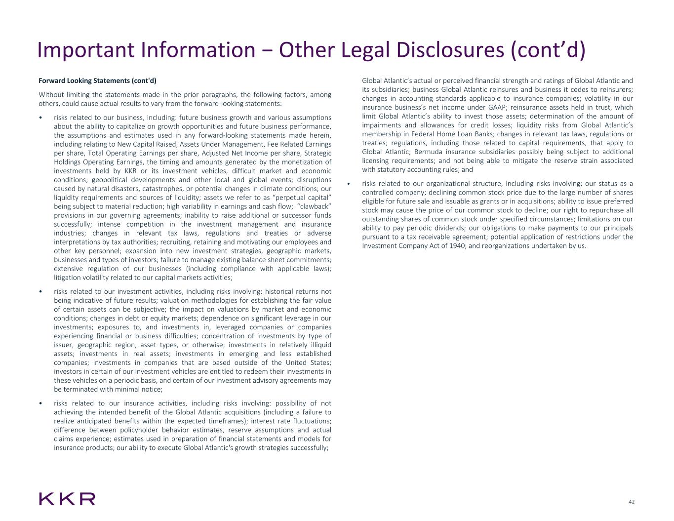 42 Global Atlantic’s actual or perceived financial strength and ratings of Global Atlantic and its subsidiaries; business Global Atlantic reinsures and business it cedes to reinsurers; changes in accounting standards applicable to insurance companies; volatility in our insurance business’s net income under GAAP; reinsurance assets held in trust, which limit Global Atlantic’s ability to invest those assets; determination of the amount of impairments and allowances for credit losses; liquidity risks from Global Atlantic’s membership in Federal Home Loan Banks; changes in relevant tax laws, regulations or treaties; regulations, including those related to capital requirements, that apply to Global Atlantic; Bermuda insurance subsidiaries possibly being subject to additional licensing requirements; and not being able to mitigate the reserve strain associated with statutory accounting rules; and • risks related to our organizational structure, including risks involving: our status as a controlled company; declining common stock price due to the large number of shares eligible for future sale and issuable as grants or in acquisitions; ability to issue preferred stock may cause the price of our common stock to decline; our right to repurchase all outstanding shares of common stock under specified circumstances; limitations on our ability to pay periodic dividends; our obligations to make payments to our principals pursuant to a tax receivable agreement; potential application of restrictions under the Investment Company Act of 1940; and reorganizations undertaken by us. Forward Looking Statements (cont'd) Without limiting the statements made in the prior paragraphs, the following factors, among others, could cause actual results to vary from the forward-looking statements: • risks related to our business, including: future business growth and various assumptions about the ability to capitalize on growth opportunities and future business performance, the assumptions and estimates used in any forward-looking statements made herein, including relating to New Capital Raised, Assets Under Management, Fee Related Earnings per share, Total Operating Earnings per share, Adjusted Net Income per share, Strategic Holdings Operating Earnings, the timing and amounts generated by the monetization of investments held by KKR or its investment vehicles, difficult market and economic conditions; geopolitical developments and other local and global events; disruptions caused by natural disasters, catastrophes, or potential changes in climate conditions; our liquidity requirements and sources of liquidity; assets we refer to as “perpetual capital” being subject to material reduction; high variability in earnings and cash flow; “clawback” provisions in our governing agreements; inability to raise additional or successor funds successfully; intense competition in the investment management and insurance industries; changes in relevant tax laws, regulations and treaties or adverse interpretations by tax authorities; recruiting, retaining and motivating our employees and other key personnel; expansion into new investment strategies, geographic markets, businesses and types of investors; failure to manage existing balance sheet commitments; extensive regulation of our businesses (including compliance with applicable laws); litigation volatility related to our capital markets activities; • risks related to our investment activities, including risks involving: historical returns not being indicative of future results; valuation methodologies for establishing the fair value of certain assets can be subjective; the impact on valuations by market and economic conditions; changes in debt or equity markets; dependence on significant leverage in our investments; exposures to, and investments in, leveraged companies or companies experiencing financial or business difficulties; concentration of investments by type of issuer, geographic region, asset types, or otherwise; investments in relatively illiquid assets; investments in real assets; investments in emerging and less established companies; investments in companies that are based outside of the United States; investors in certain of our investment vehicles are entitled to redeem their investments in these vehicles on a periodic basis, and certain of our investment advisory agreements may be terminated with minimal notice; • risks related to our insurance activities, including risks involving: possibility of not achieving the intended benefit of the Global Atlantic acquisitions (including a failure to realize anticipated benefits within the expected timeframes); interest rate fluctuations; difference between policyholder behavior estimates, reserve assumptions and actual claims experience; estimates used in preparation of financial statements and models for insurance products; our ability to execute Global Atlantic's growth strategies successfully; Important Information − Other Legal Disclosures (cont’d)