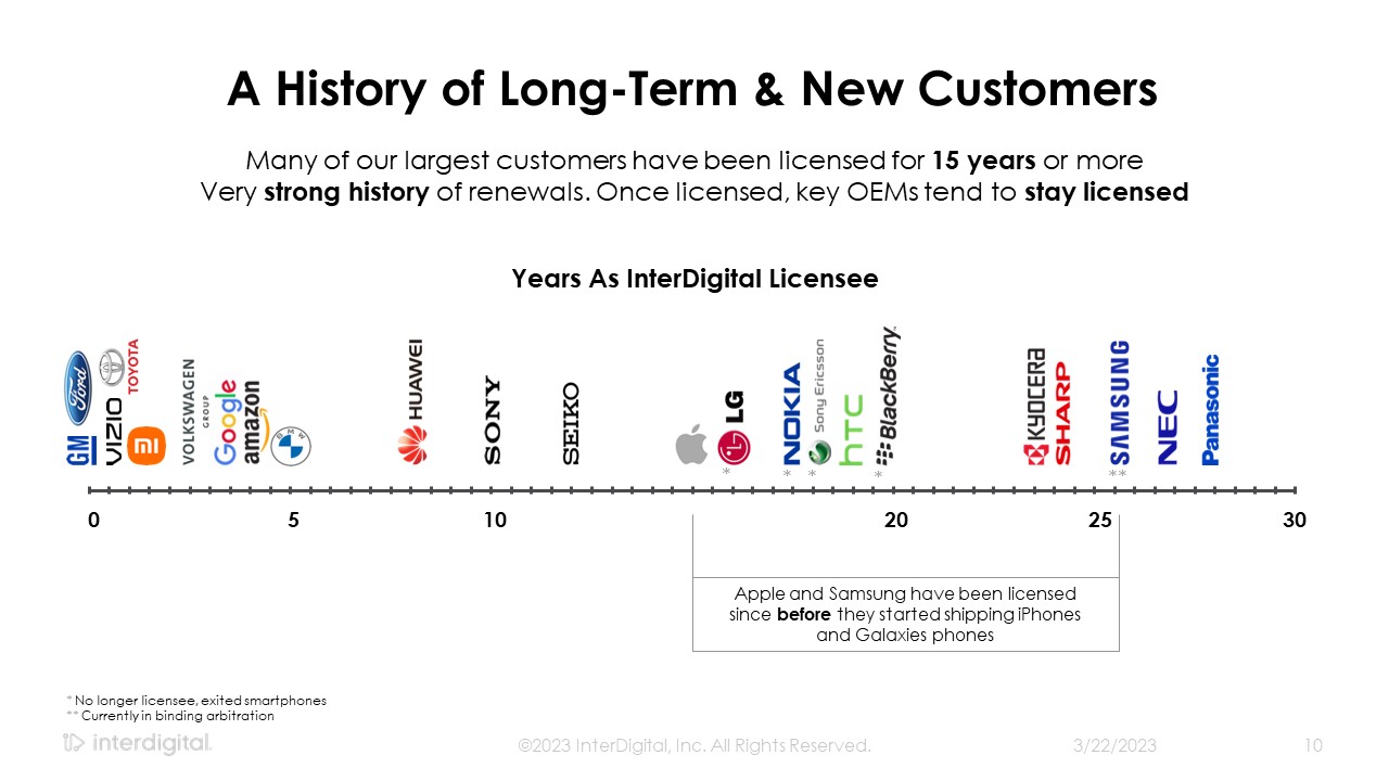 3/21/2023  10  ©2023 InterDigital, Inc. All Rights Reserved.  Years As InterDigital Licensee  0  5  10  20  25  30   *  *  *  *  Apple and Samsung have been licensed since before they started shipping iPhones and Galaxies phones  Many of our largest customers have been licensed for 15 years or more  Very strong history of renewals. Once licensed, key OEMs tend to stay licensed   A History of Long-Term & New Customers  **  * No longer licensee, exited smartphones  ** Currently in binding arbitration