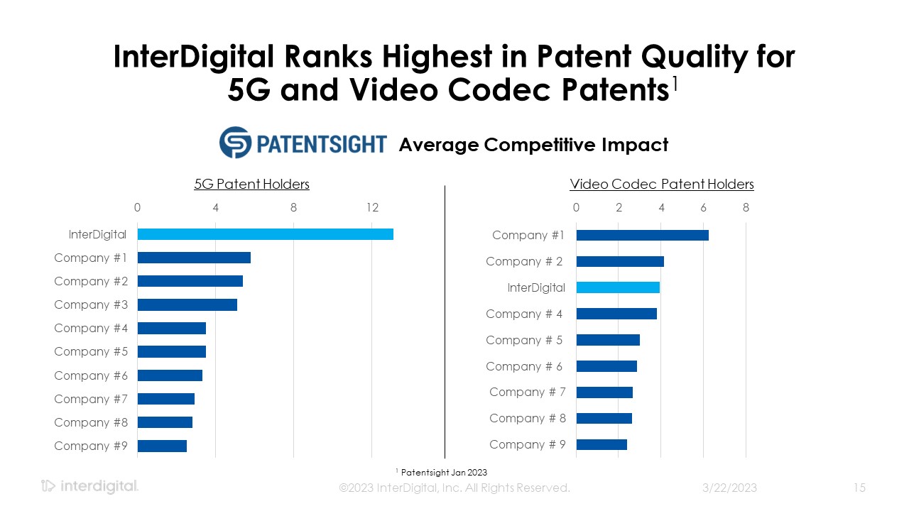Average Competitive Impact  InterDigital Ranks Highest in Patent Quality for5G and Video Codec Patents1  3/21/2023  ©2023 InterDigital, Inc. All Rights Reserved.  15  Video Codec Patent Holders   5G Patent Holders  1 Patentsight Jan 2023