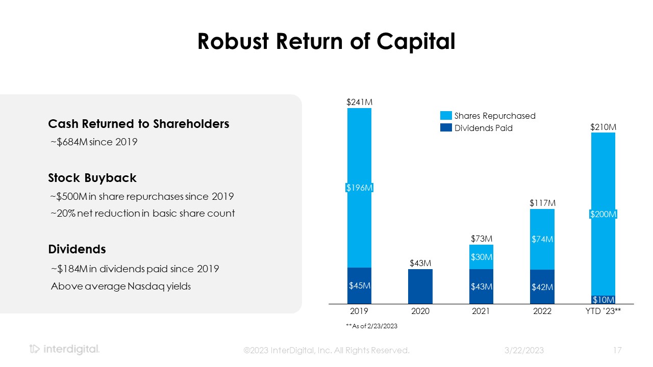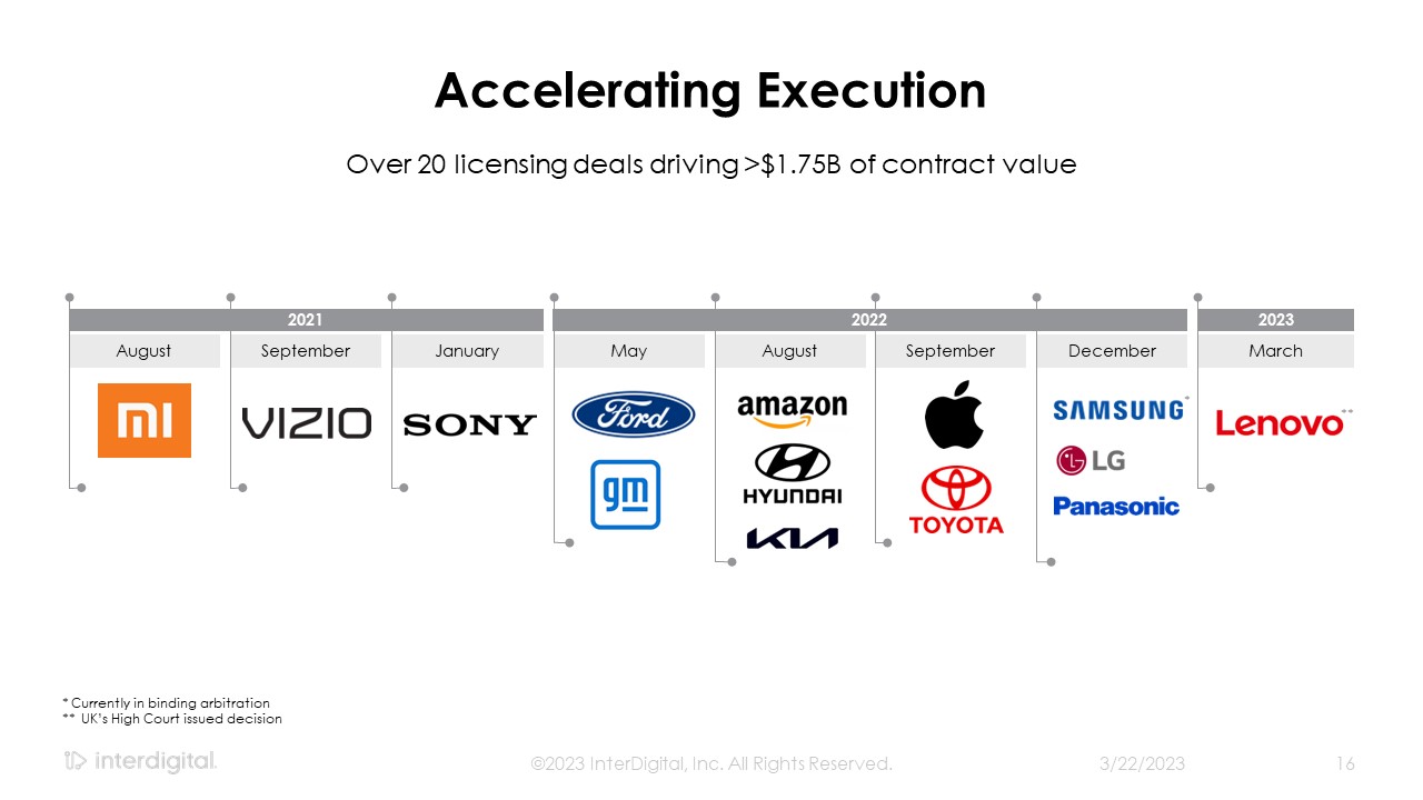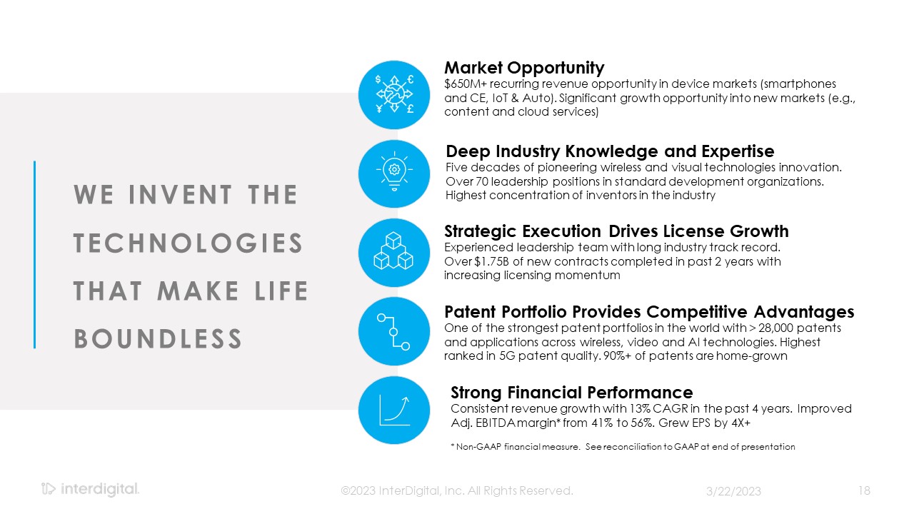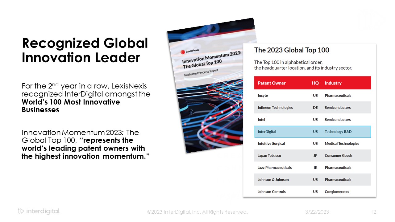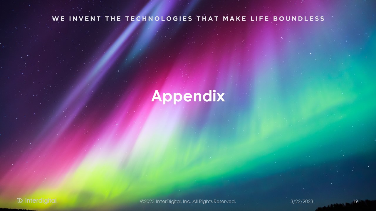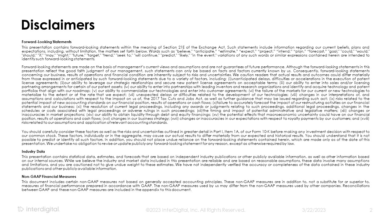 3/21/2023  ©2023 InterDigital, Inc. All Rights Reserved.  2  Forward-Looking Statements  This presentation contains forward-looking statements within the meaning of Section 21E of the Exchange Act. Such statements include information regarding our current beliefs, plans and expectations, including, without limitation, the matters set forth below. Words such as "believe," “anticipate,” “estimate,” “expect,” “project,” “intend,” “plan,” “forecast,” "goal," "could," "would," "should," "if," "may," "might," "future," "target," "trend," "seek to," "will continue," "predict," "likely," "in the event," variations of any such words or similar expressions contained herein are intended to identify such forward-looking statements.  Forward-looking statements are made on the basis of management’s current views and assumptions and are not guarantees of future performance. Although the forward-looking statements in this presentation reflect the good faith judgment of our management, such statements can only be based on facts and factors currently known by us. Consequently, forward-looking statements concerning our business, results of operations and financial condition are inherently subject to risks and uncertainties. We caution readers that actual results and outcomes could differ materially from those expressed in or anticipated by such forward-looking statements due to a variety of factors, including: (i)unanticipated delays, difficulties or accelerations in the execution of patent license agreements; (ii)our ability to leverage our strategic relationships and secure new patent license agreements on acceptable terms; (iii) our ability to enter into sales and/or licensing partnering arrangements for certain of our patent assets; (iv) our ability to enter into partnerships with leading inventors and research organizations and identify and acquire technology and patent portfolios that align with our roadmap; (v) our ability to commercialize our technologies and enter into customer agreements; (vi) the failure of the markets for our current or new technologies to materialize to the extent or at the rate that we expect; (vii) unexpected delays or difficulties related to the development of our technologies; (viii) changes in our interpretations of, and assumptions and calculations with respect to the impact on us of, the 2017 Tax Cuts and Jobs Act, as well as further guidance that may be issued regarding such act; (ix) risks related to the potential impact of new accounting standards on our financial position, results of operations or cash flows; (x)failure to accurately forecast the impact of our restructuring activities on our financial statements and our business; (xi) the resolution of current legal proceedings, including any awards or judgments relating to such proceedings, additional legal proceedings, changes in the schedules or costs associated with legal proceedings or adverse rulings in such proceedings; (xii)the timing and impact of potential administrative and legislative matters; (xiii) changes or inaccuracies in market projections; (xiv) our ability to obtain liquidity through debt and equity financings; (xv) the potential effects that macroeconomic uncertainty could have on our financial position, results of operations and cash flows; (xvi) changes in our business strategy; (xvii) changes or inaccuracies in our expectations with respect to royalty payments by our customers; and (xviii) risks related to our assumptions and application of relevant accounting standards.  You should carefully consider these factors as well as the risks and uncertainties outlined in greater detail in Part I, Item 1A, of our Form 10-K before making any investment decision with respect to our common stock. These factors, individually or in the aggregate, may cause our actual results to differ materially from our expected and historical results. You should understand that it is not possible to predict or identify all such factors. In addition, you should not place undue reliance on the forward-looking statements contained herein, which are made only as of the date of this presentation. We undertake no obligation to revise or update publicly any forward-looking statement for any reason, except as otherwise required by law.  Industry Data  This presentation contains statistical data, estimates, and forecasts that are based on independent industry publications or other publicly available information, as well as other information based on our internal sources. While we believe the industry and market data included in this presentation are reliable and are based on reasonable assumptions, these data involve many assumptions and limitations, and you are cautioned not to give undue weight to these estimates. We have not independently verified the accuracy or completeness of the data contained in these industry publications and other publicly available information.  Non-GAAP Financial Measures  This document includes certain non-GAAP measures not based on generally accepted accounting principles. These non-GAAP measures are in addition to, not a substitute for or superior to, measures of financial performance prepared in accordance with GAAP. The non-GAAP measures used by us may differ from the non-GAAP measures used by other companies. Reconciliations between GAAP and these non-GAAP measures are included in the appendix to this document.   Disclaimers