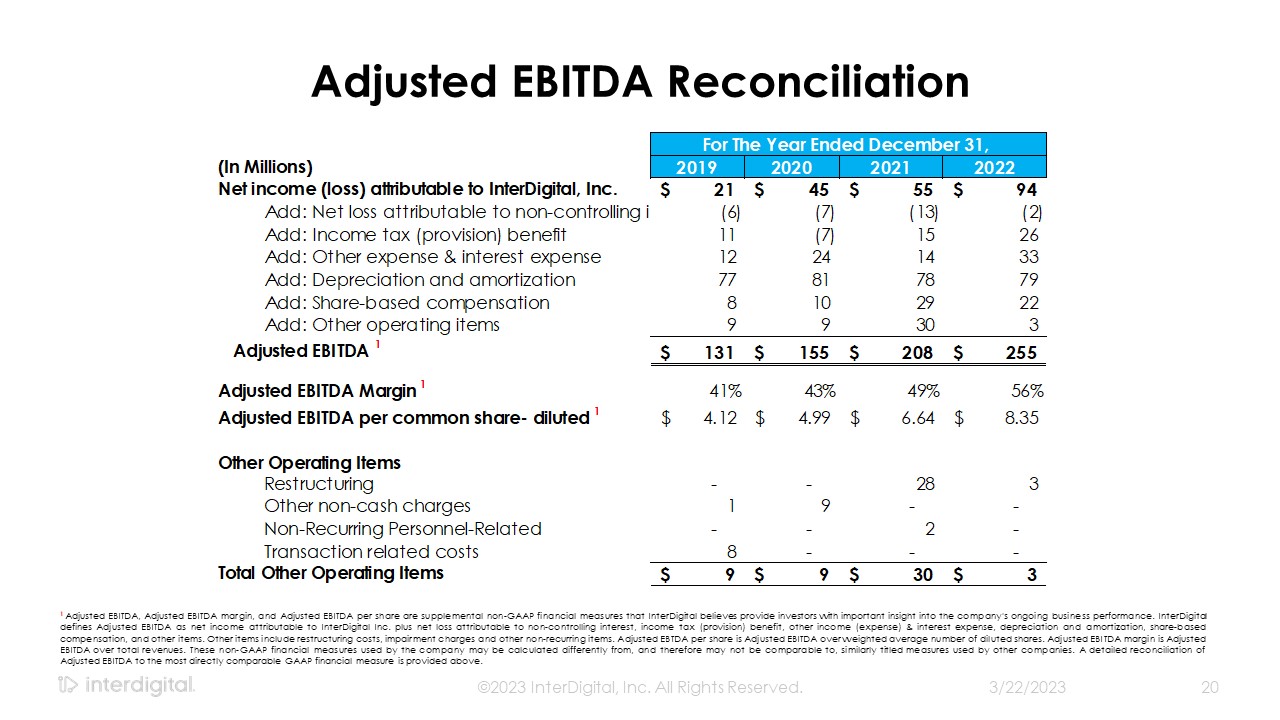 3/21/2023  ©2023 InterDigital, Inc. All Rights Reserved.  20  Adjusted EBITDA Reconciliation  1 Adjusted EBITDA, Adjusted EBITDA margin, and Adjusted EBITDA per share are supplemental non-GAAP financial measures that InterDigital believes provide investors with important insight into the company's ongoing business performance. InterDigital defines Adjusted EBITDA as net income attributable to InterDigital Inc. plus net loss attributable to non-controlling interest, income tax (provision) benefit, other income (expense) & interest expense, depreciation and amortization, share-based compensation, and other items. Other items include restructuring costs, impairment charges and other non-recurring items. Adjusted EBTDA per share is Adjusted EBITDA over weighted average number of diluted shares. Adjusted EBITDA margin is Adjusted EBITDA over total revenues. These non-GAAP financial measures used by the company may be calculated differently from, and therefore may not be comparable to, similarly titled measures used by other companies. A detailed reconciliation of Adjusted EBITDA to the most directly comparable GAAP financial measure is provided above.