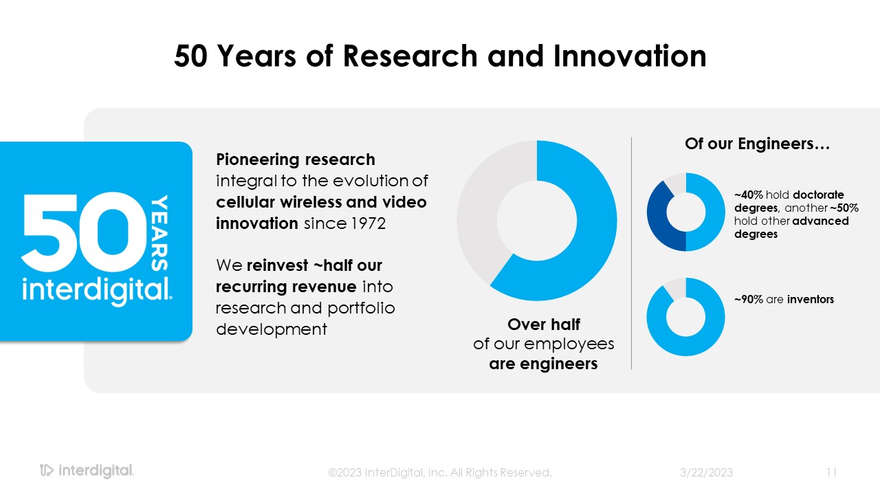 Pioneering research integral to the evolution of cellular wireless and video innovation since 1972  We reinvest ~half our recurring revenue into research and portfolio development   50 Years of Research and Innovation  3/21/2023  ©2023 InterDigital, Inc. All Rights Reserved.  11  Over half of our employees are engineers  ~40% hold doctorate degrees, another ~50% hold other advanced degrees  ~90% are inventors  Of our Engineers…