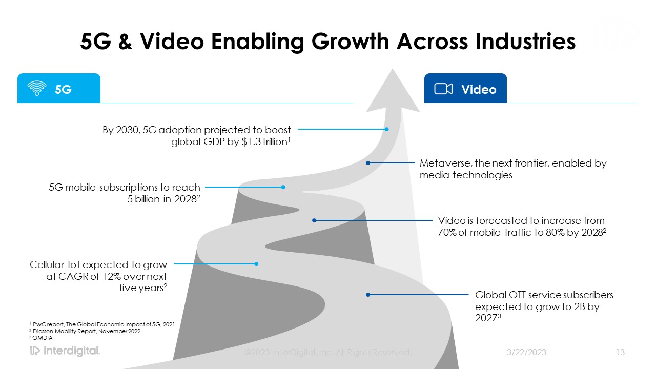 5G & Video Enabling Growth Across Industries   3/21/2023  ©2023 InterDigital, Inc. All Rights Reserved.  13  3/21/2023  ©2023 InterDigital, Inc. All Rights Reserved.  13  By 2030, 5G adoption projected to boost   global GDP by $1.3 trillion1   5G mobile subscriptions to reach   5 billion in 20282    Cellular IoT expected to grow at CAGR of 12% over next   five years2  Global OTT service subscribers expected to grow to 2B by 20273   5G   Video  1 PwC report, The Global Economic Impact of 5G, 2021  2 Ericsson Mobility Report, November 2022  3 OMDIA  Metaverse, the next frontier, enabled by media technologies  Video is forecasted to increase from 70% of mobile traffic to 80% by 20282