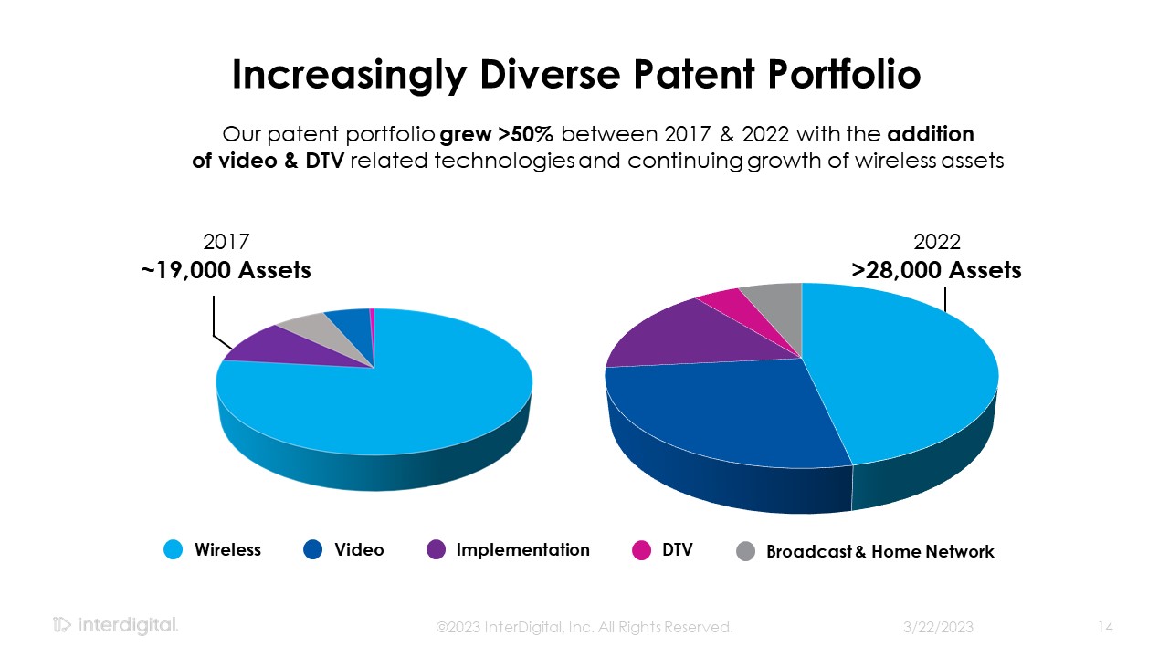 Wireless  Video  Implementation  DTV  Broadcast & Home Network  2017  ~19,000 Assets  2022  >28,000 Assets  Increasingly Diverse Patent Portfolio  Our patent portfolio grew >50% between 2017 & 2022 with the addition of video & DTV related technologies and continuing growth of wireless assets  3/21/2023  ©2023 InterDigital, Inc. All Rights Reserved.  14