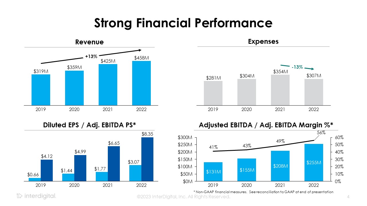 Strong Financial Performance  2019  2020  2021  2022  -13%  Revenue  Expenses  Diluted EPS / Adj. EBITDA PS*  2019  2020  2021  2022  2019  2020  2021  2022  Adjusted EBITDA / Adj. EBITDA Margin %*  ©2023 InterDigital, Inc. All Rights Reserved.  4  2019  2020  2021  2022  +13%  * Non-GAAP financial measures. See reconciliation to GAAP at end of presentation