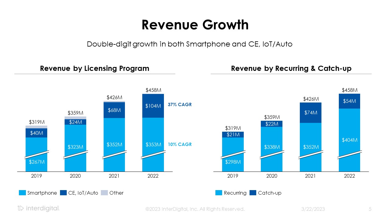 Revenue Growth   Double-digit growth in both Smartphone and CE, IoT/Auto   $267M  2019  $323M  2020  $352M  2021  $353M  2022  $319M  $359M  $426M  $458M  Smartphone  CE, IoT/Auto  Other  3/21/2023  ©2023 InterDigital, Inc. All Rights Reserved.  5  $298M  2019  $338M  2020  $352M  2021  $404M  2022  $319M  $359M  $426M  $458M  Recurring  Catch-up  Revenue by Licensing Program  Revenue by Recurring & Catch-up  37% CAGR  10% CAGR