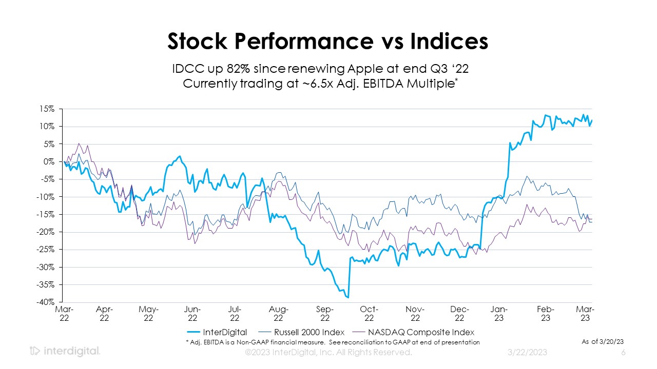 Stock Performance vs Indices  3/21/2023  ©2023 InterDigital, Inc. All Rights Reserved.  6  Mar-22  Apr-22  May-22  Jun-22  Jul-22  Aug-22  Sep-22  Oct-22  Nov-22  Dec-22  Jan-23  Feb-23  Mar-23  InterDigital  Russell 2000 Index  NASDAQ Composite Index  As of 3/20/23  IDCC up 82% since renewing Apple at end Q3 ‘22  Currently trading at ~6.5x Adj. EBITDA Multiple*  * Adj. EBITDA is a Non-GAAP financial measure.  See reconciliation to GAAP at end of presentation